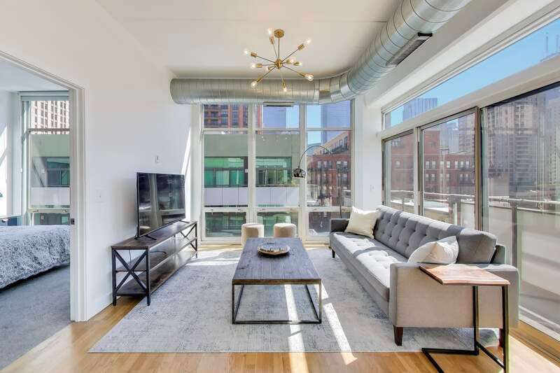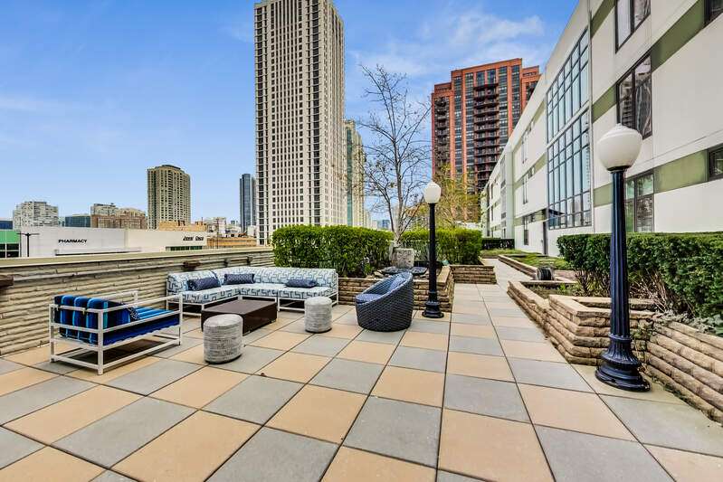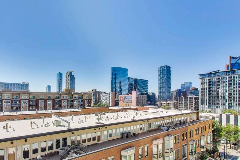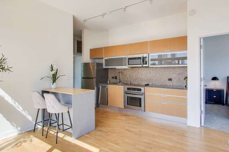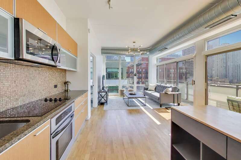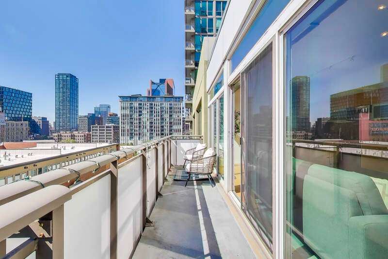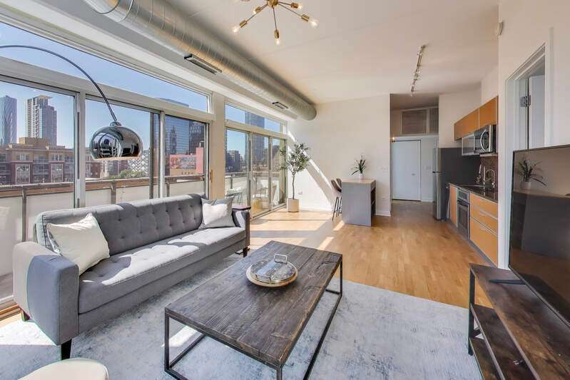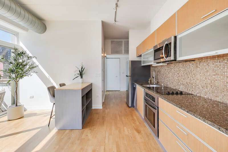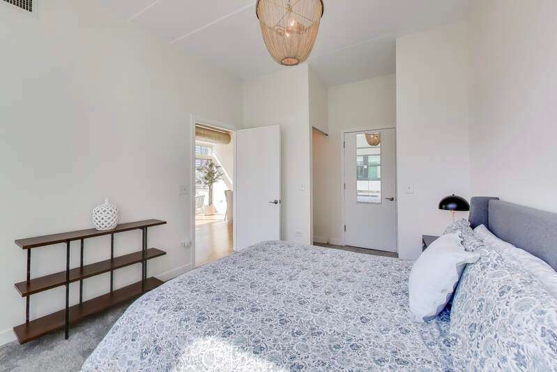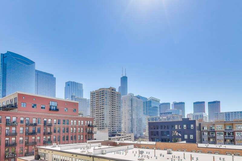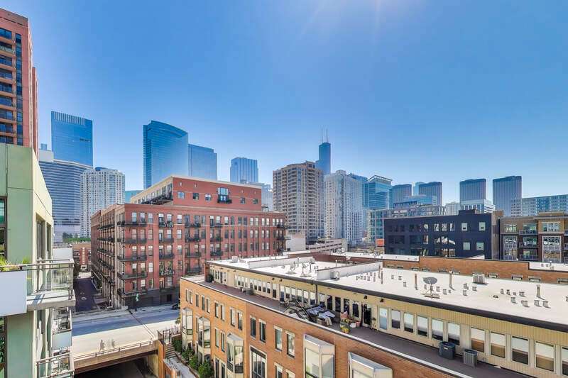 Welcome to this rare 7th-floor corner penthouse at The Trio, offering sweeping southeast views in the highly sought-after Fulton Market River District. This 2-bedroom, 2-bath residence features a spacious open layout with 10-foot ceilings, hardwood floors, and floor-to-ceiling windows that flood the home with natural light. The modern galley kitchen is equipped with flat-panel cabinetry, stainless steel appliances, stone countertops, and a stylish tile backsplash. The primary suite boasts two closets, and a generously sized en-suite bath. The second bedroom is perfect for guests or a home office. The second bath is finished with a vessel sink and a beautifully tiled shower. Additional highlights include in-unit laundry, new central HVAC, and a full-size storage locker. Prime indoor parking is available at an additional $30k. The Trio is a pet-friendly, elevator building with outstanding amenities: a landscaped green roof terrace with fountains and seating, a fully renovated resident lounge with gaming and dining areas plus a full kitchen, a fitness center, and a business center. Tucked away on quiet Wayman Street-just steps from a park and dog run-this hidden gem is walkable to top-tier dining (fulton market), shopping, coffee shops, and groceries, with quick (0.3miles) access to the Morgan CTA Station (Green & Pink), Metra Stations (Union 0.6 mile)/ (Ogilvie 0.3) the Loop, and expressway.