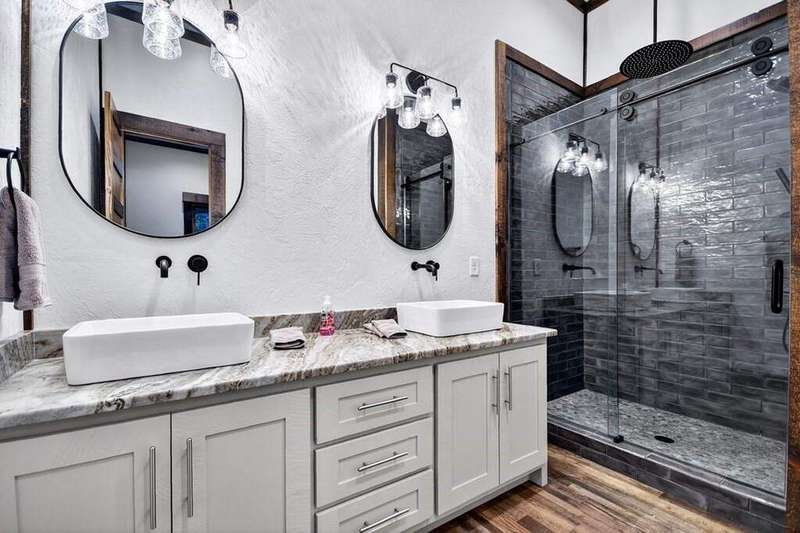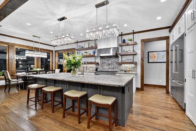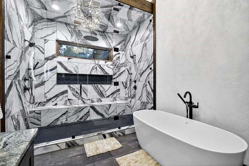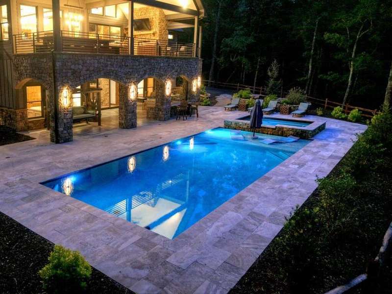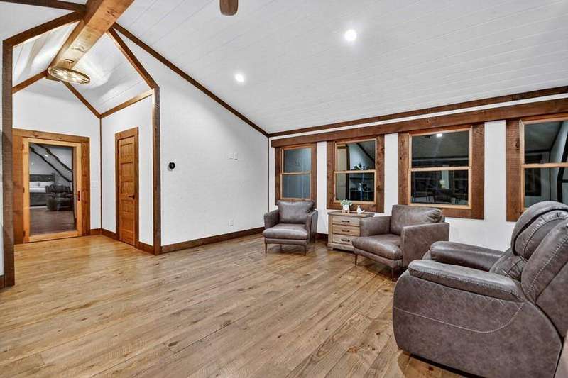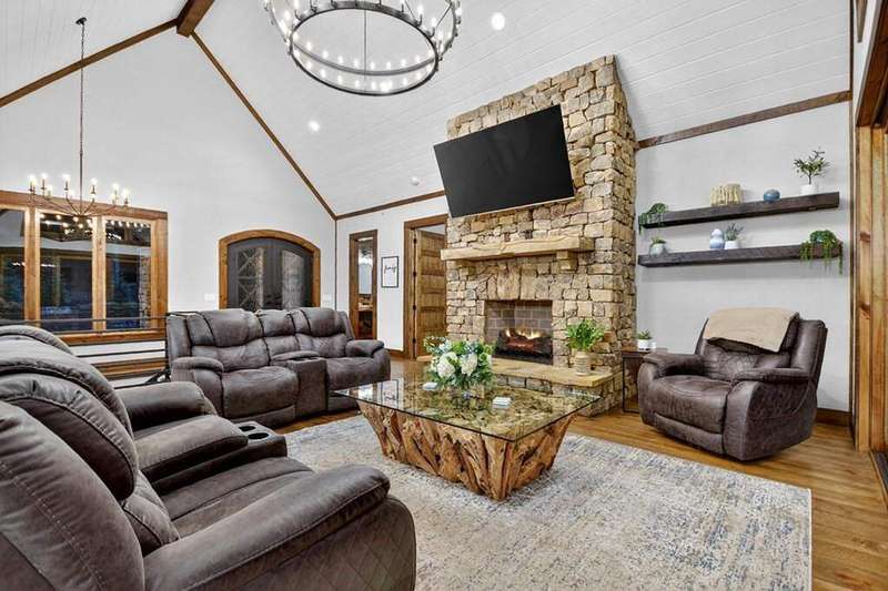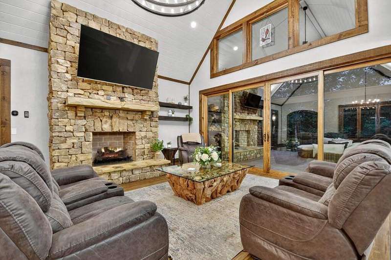 Extraordinary one-of-a-kind Marc Nicholson custom luxury estate situated on 3.34 pristine mountain acres within an ultra-exclusive gated community featuring complete paved road access, magnificent community pavilion with outdoor kitchen, and private Toccoa River access just minutes from downtown Blue Ridge. This breathtaking 5-bedroom, 5.5-bathroom architectural masterpiece showcases stunning curb appeal and welcomes guests through a grand foyer with soaring ceilings and floor-to-ceiling windows. The heart of this magnificent home features a great room anchored by a custom rock fireplace, seamlessly flowing into a culinary masterpiece kitchen equipped with luxury appliances, oversized entertaining island, sophisticated coffee bar, and concealed butler's pantry for effortless service. The owner's suite serves as a private sanctuary featuring a romantic balcony, sumptuous soaking tub, extraordinary steam shower with rainfall head, luxurious heated floors, and palatial walk-in closet overlooking the wooded grounds. Sophisticated interior spaces include an exclusive bourbon and cigar lounge with state-of-the-art air purification, versatile multi-purpose room with elevated dog wash station, convenient mud room off the garage with custom storage bench, and climate-controlled three-car garage with EV charging pre-wiring and impressive 1,000 square foot guest apartment above with private entrance. Step into your private backyard resort oasis featuring a magnificent heated saltwater pool with tanning ledge, oversized spa with dramatic spillover features, all surrounded by exquisite custom travertine stonework. The professional outdoor kitchen showcases premium stainless steel cabinetry, Big Green Egg, Blackstone griddle, Bull propane grill, and beverage cooling system, while the expansive covered porch features a breathtaking double-sided stone fireplace. Award-worthy professional landscaping creates perfect harmony between sophisticated design and natural mountain beauty.