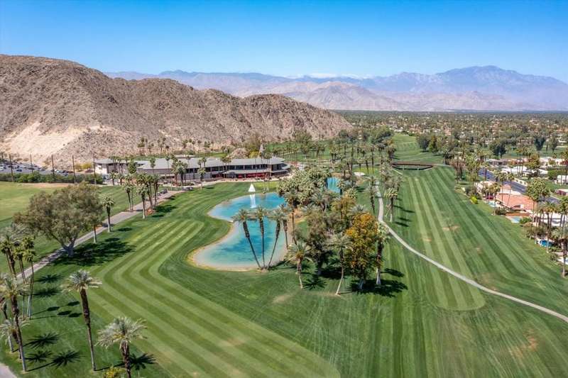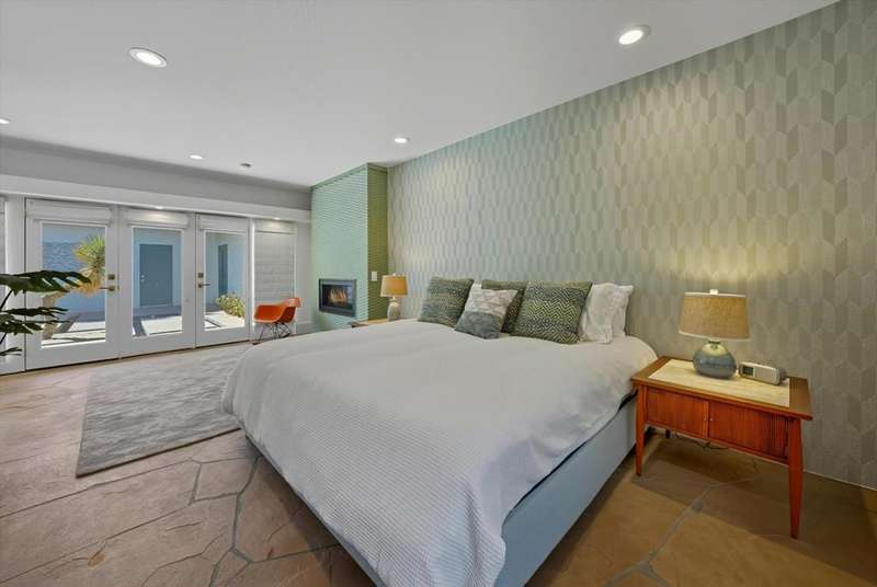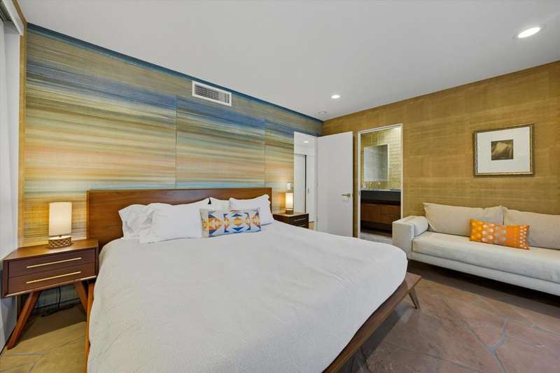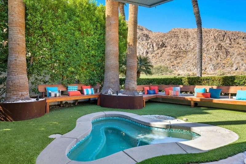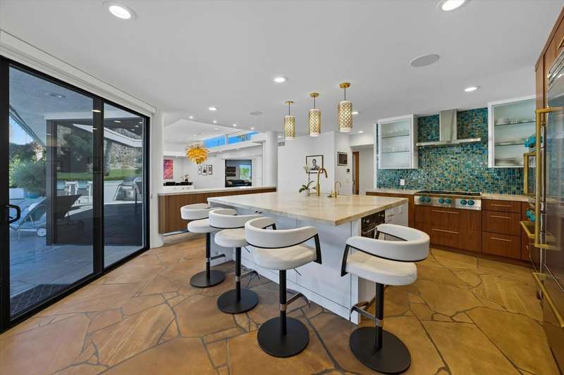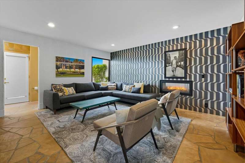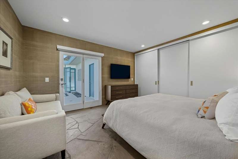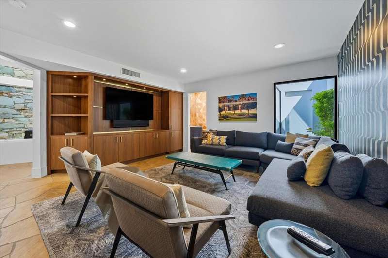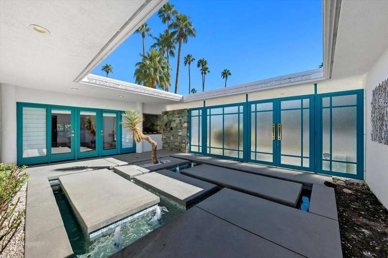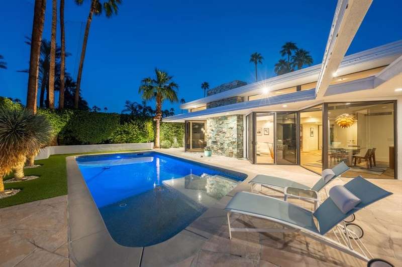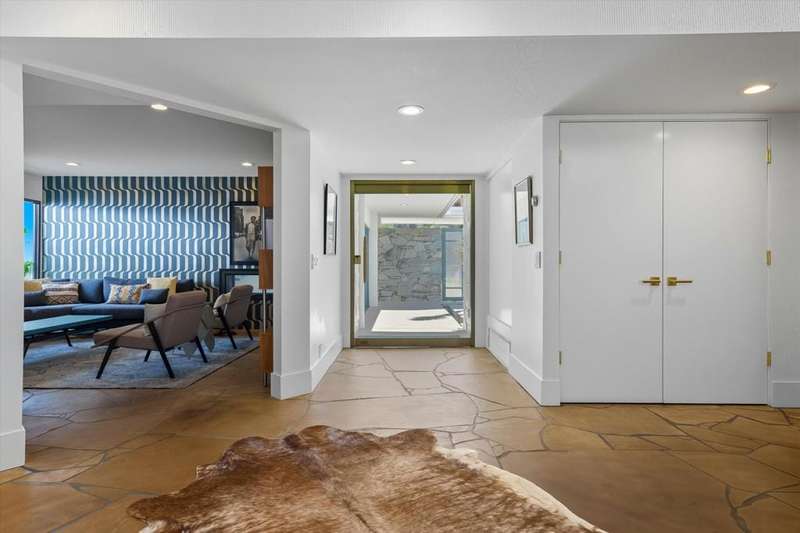 Stunning 1963 Mid-Century Modern, remodeled in 2019, captures expansive South Mountain and Indian Wells Fairway views while offering exceptional privacy. The front elevation with iconic Utah Jade stone facade and circular drive are immortalized in a Carrie Graber artwork, available at Coda Gallery, which sets the tone. A front courtyard wall of obscure glass provides natural light, privacy and leads to the main entry, Casita, and Guest suite. Mid-Century imagination comes alive with the geometric concrete water feature which is the courtyard floor. Inside, the Great Room impresses with a dramatic wall of angular glass and transom windows spanning the width of the home. Flagstone flooring flows throughout, anchored by a striking Utah Jade fireplace. The Great Room with a wet bar, large kitchen, and Primary suite open to the pool, spa and large patio with sweeping views of the South fairway and mountains. The flexible Media Room includes a large screen TV, a 3/4 bath and could serve as a 4th bedroom. A see-thru fireplace connects to the spacious en-suite Casita with private entry and offers a romantic element. Both the Primary and Guest suites enjoy remodeled baths with large showers. The 2019 renovation offers owned Solar electricity and showcases walnut cabinetry, custom shades, quartzite counters, high-end Blue Star appliances, a Thermador wine cooler, and a well-appointed kitchen with a generous island which opens to a covered patio area perfect for dining.Resort-style outdoor living includes a pool with tanning shelf, spa, two fire pits, built-in BBQ with dining counter, and a large covered patio with redwood bench seating, perfect for large parties. A 2-car plus golf cart garage has just been refinished with epoxy flooring. Large side hedges separate this from the neighboring homes for privacy. This beautiful home is offered furnished per inventory and, ready for immediate occupancy. Located in Indian Wells Country Club behind the Manitou Gate, with low HOA dues and enjoys all the Indian Wells perks offered to residents.