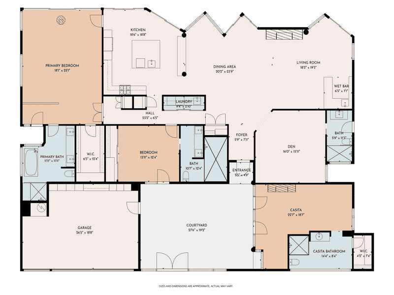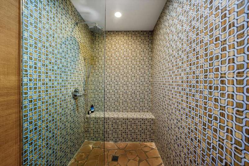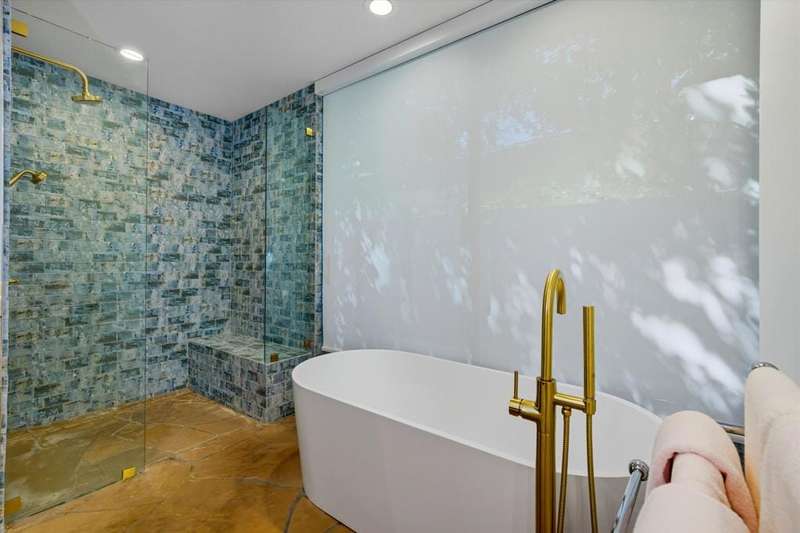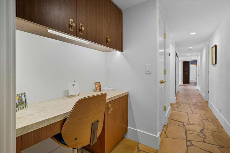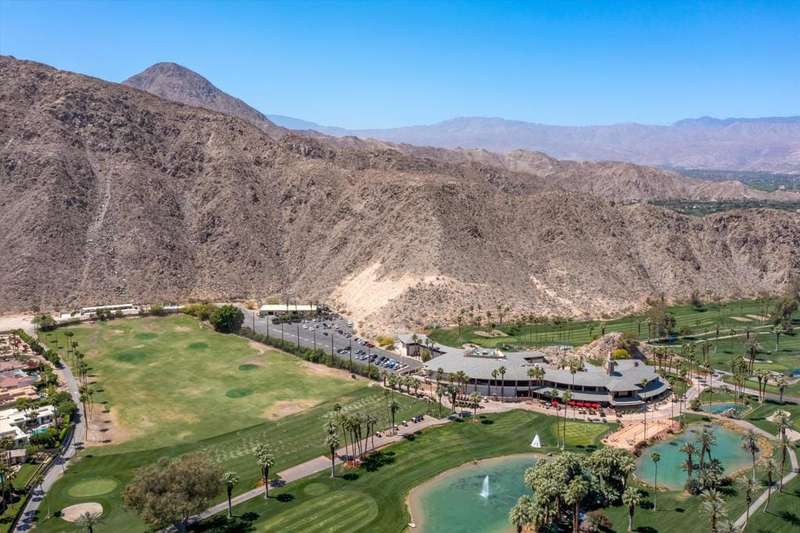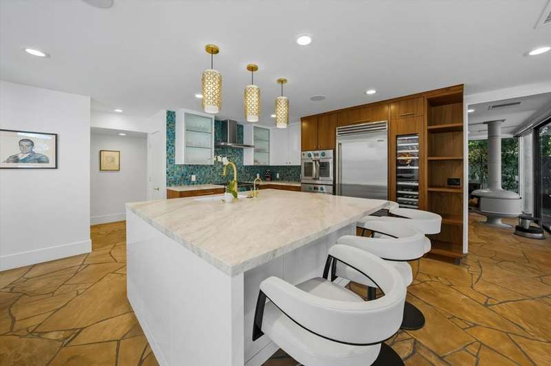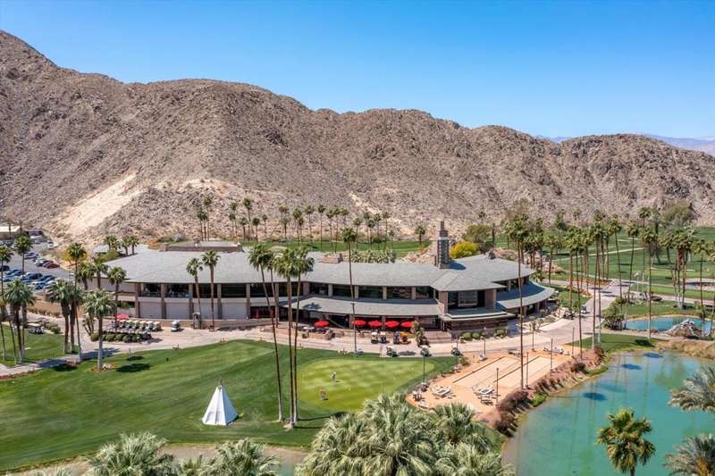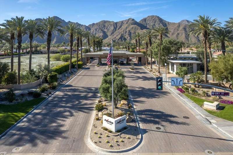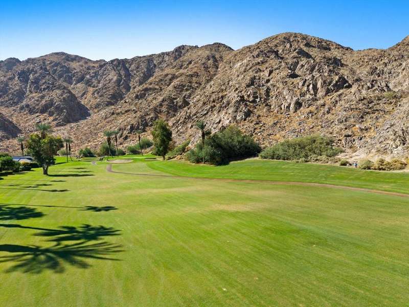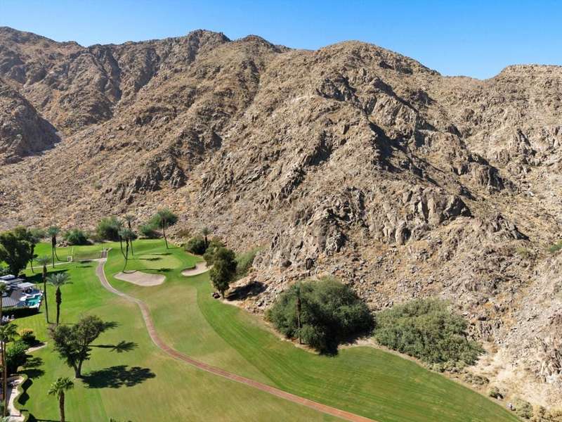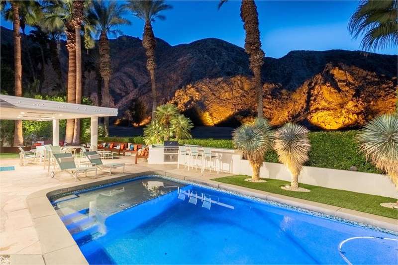 Stunning 1963 Mid-Century Modern, remodeled in 2019, captures expansive South Mountain and Indian Wells Fairway views while offering exceptional privacy. The front elevation with iconic Utah Jade stone facade and circular drive are immortalized in a Carrie Graber artwork, available at Coda Gallery, which sets the tone. A front courtyard wall of obscure glass provides natural light, privacy and leads to the main entry, Casita, and Guest suite. Mid-Century imagination comes alive with the geometric concrete water feature which is the courtyard floor. Inside, the Great Room impresses with a dramatic wall of angular glass and transom windows spanning the width of the home. Flagstone flooring flows throughout, anchored by a striking Utah Jade fireplace. The Great Room with a wet bar, large kitchen, and Primary suite open to the pool, spa and large patio with sweeping views of the South fairway and mountains. The flexible Media Room includes a large screen TV, a 3/4 bath and could serve as a 4th bedroom. A see-thru fireplace connects to the spacious en-suite Casita with private entry and offers a romantic element. Both the Primary and Guest suites enjoy remodeled baths with large showers. The 2019 renovation offers owned Solar electricity and showcases walnut cabinetry, custom shades, quartzite counters, high-end Blue Star appliances, a Thermador wine cooler, and a well-appointed kitchen with a generous island which opens to a covered patio area perfect for dining.Resort-style outdoor living includes a pool with tanning shelf, spa, two fire pits, built-in BBQ with dining counter, and a large covered patio with redwood bench seating, perfect for large parties. A 2-car plus golf cart garage has just been refinished with epoxy flooring. Large side hedges separate this from the neighboring homes for privacy. This beautiful home is offered furnished per inventory and, ready for immediate occupancy. Located in Indian Wells Country Club behind the Manitou Gate, with low HOA dues and enjoys all the Indian Wells perks offered to residents.