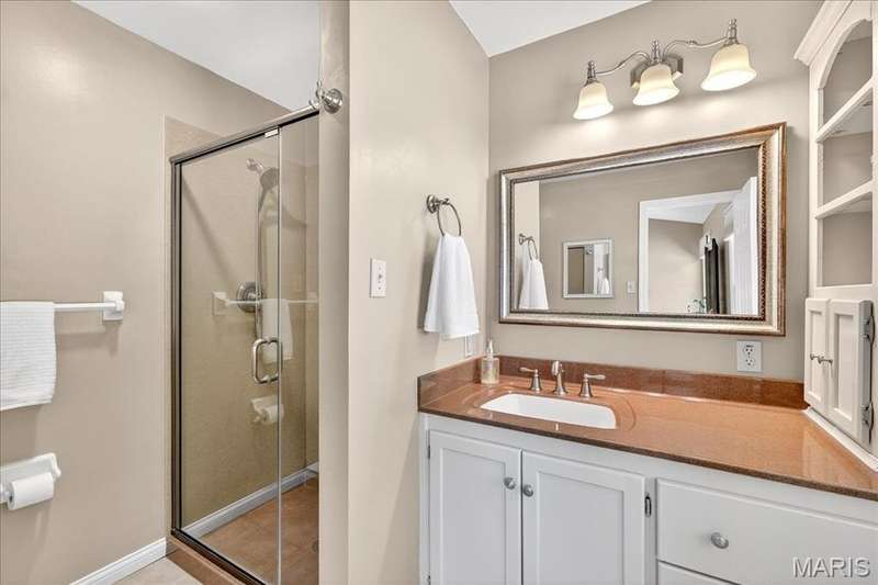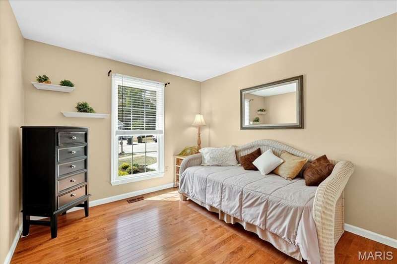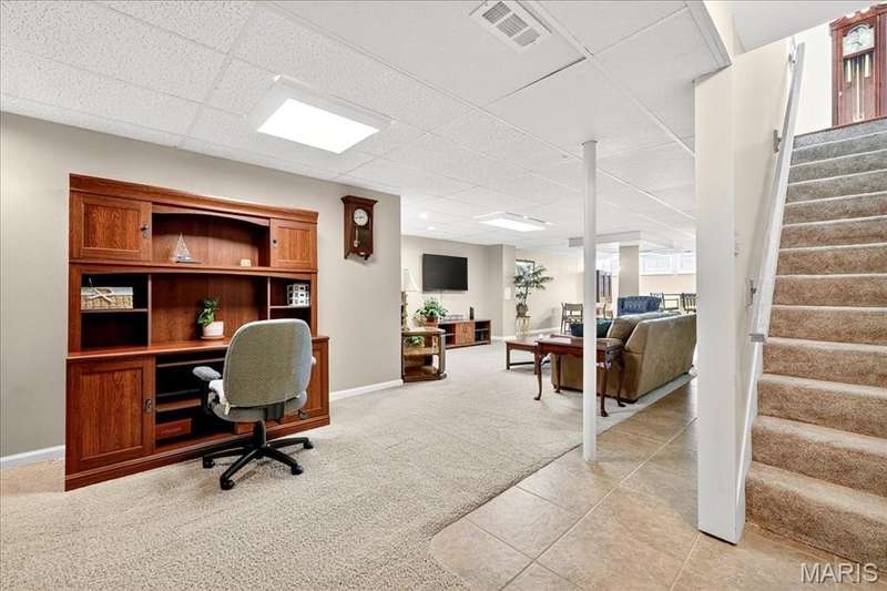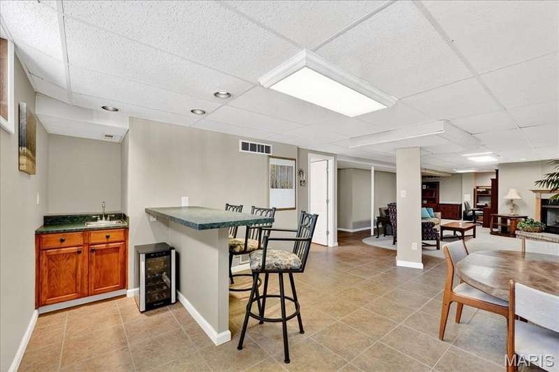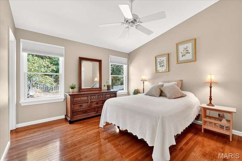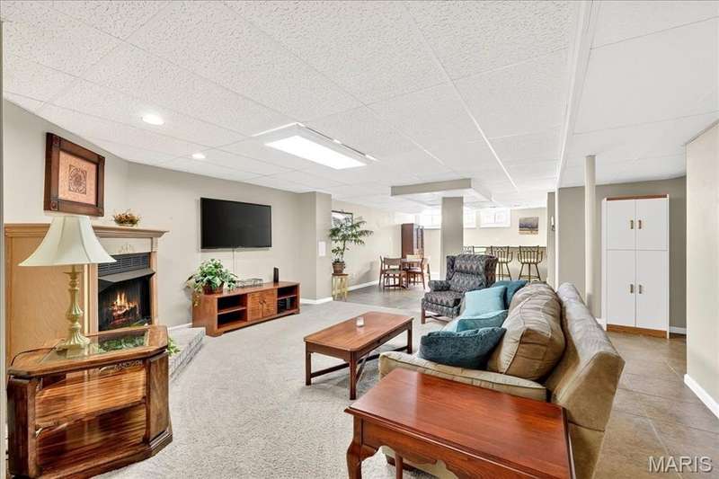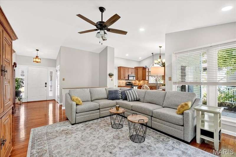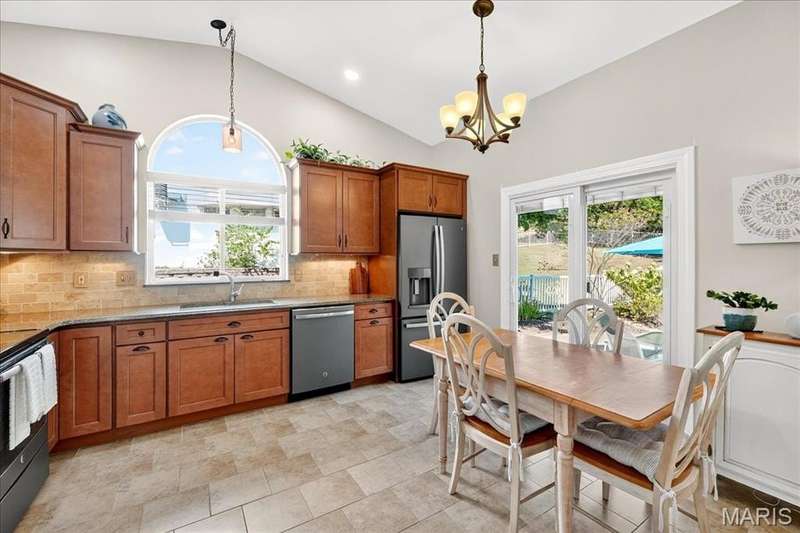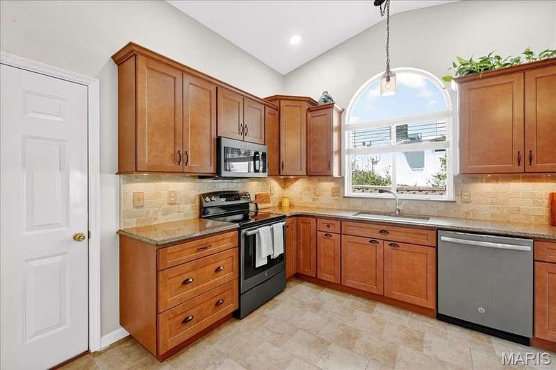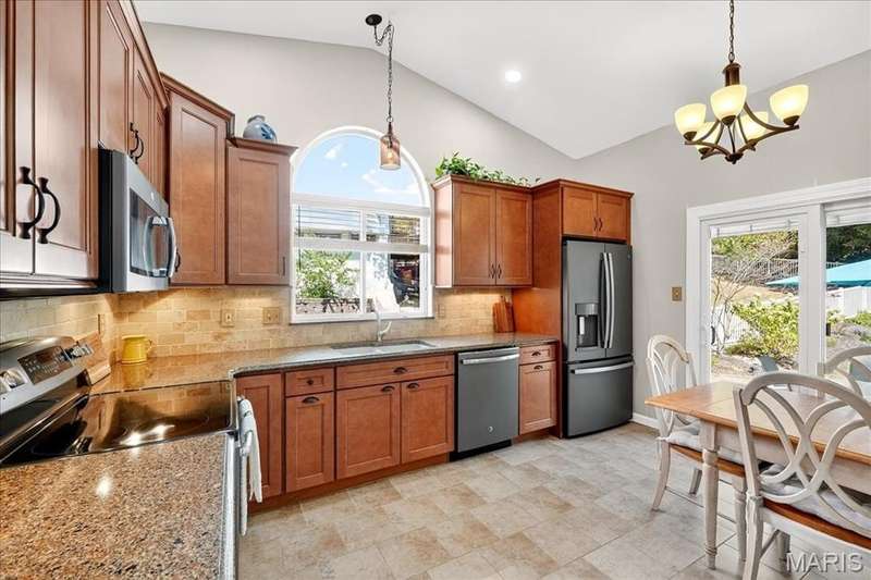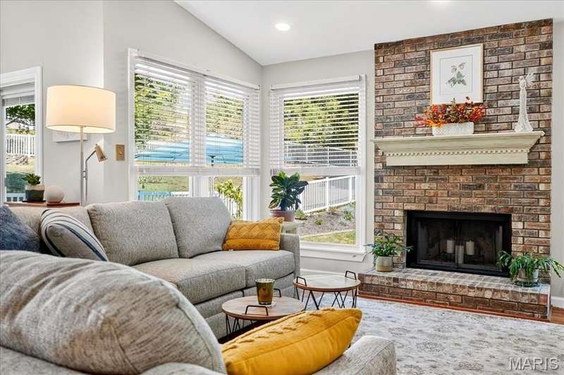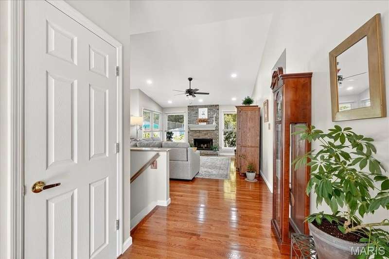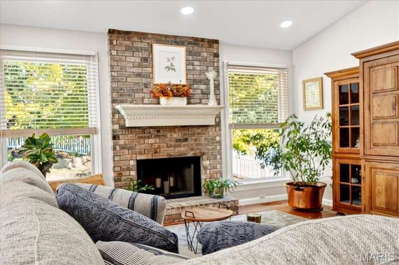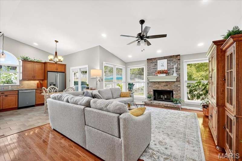 Step into this beautifully maintained ranch-style residence, where charm meets modern comfort. Gleaming hardwood floors flow seamlessly throughout the main level, setting the tone for elegant living. The spacious living room boasts a vaulted ceiling and a cozy wood-burning fireplace—perfect for relaxing evenings or entertaining guests. The renovated kitchen features rich wood cabinetry, sleek stainless steel appliances, and a functional layout that opens to a sunlit eat-in dining area. From here, enjoy direct access to the patio and lush, professionally landscaped gardens. The primary suite is a true retreat, complete with vaulted ceilings, abundant natural light, and a generous walk-in closet. The en-suite bath offers a walk-in shower, single vanity, and tasteful tile flooring. Two additional bedrooms and a well-appointed hall bath round out the main level, offering comfort and flexibility for family or guests. Downstairs, the finished lower level expands your living space with a large family room featuring a gas fireplace, a convenient half bath, laundry area, and ample storage.
