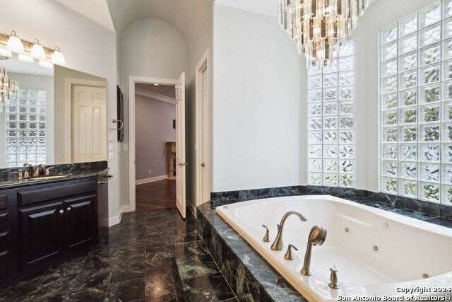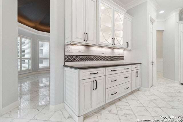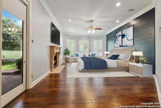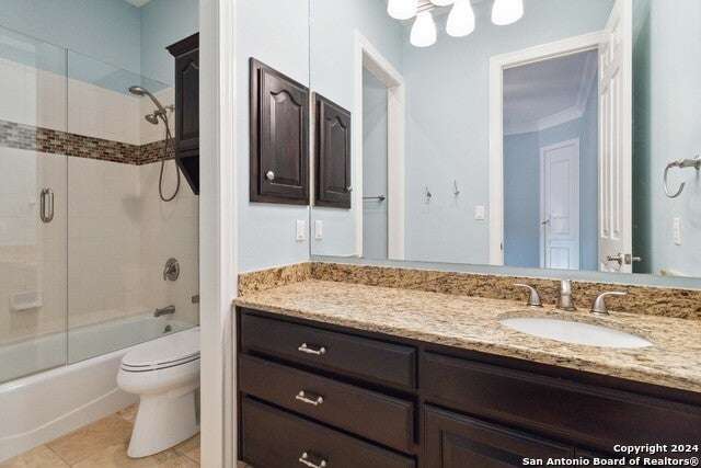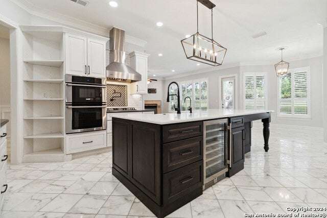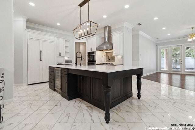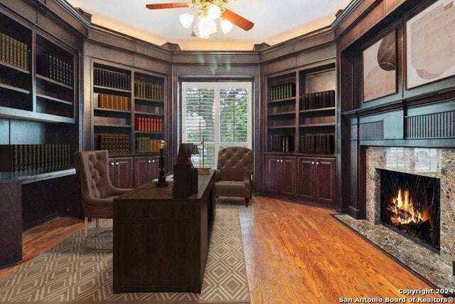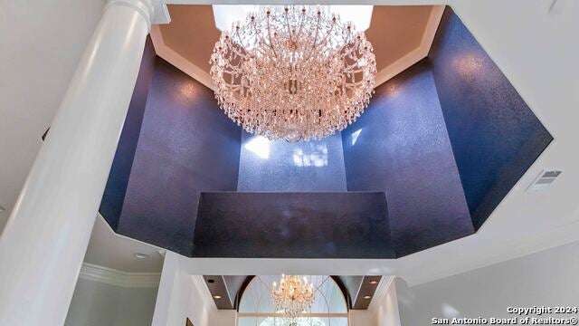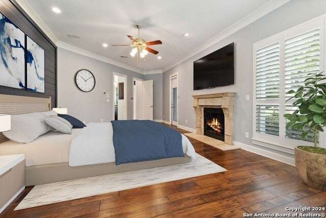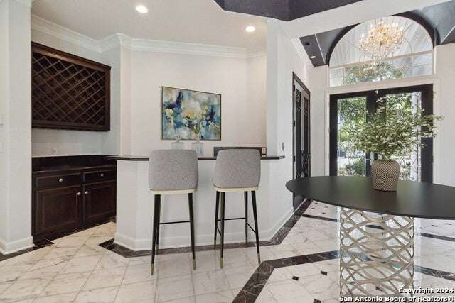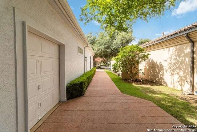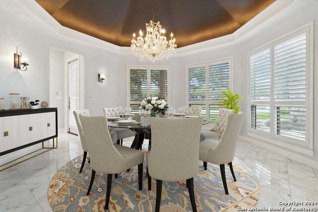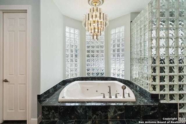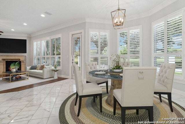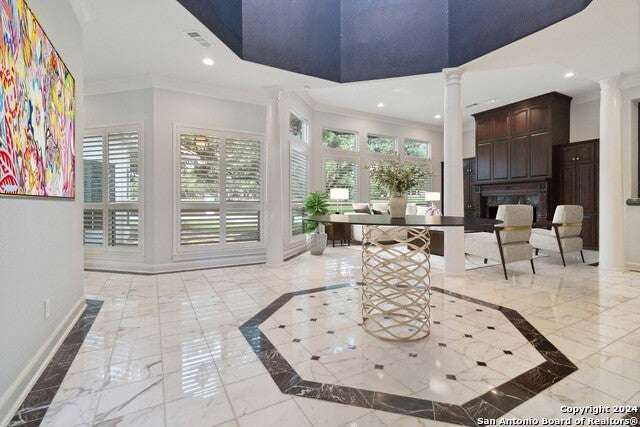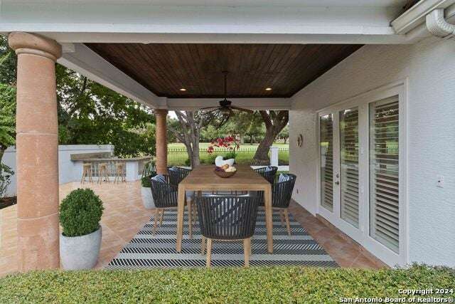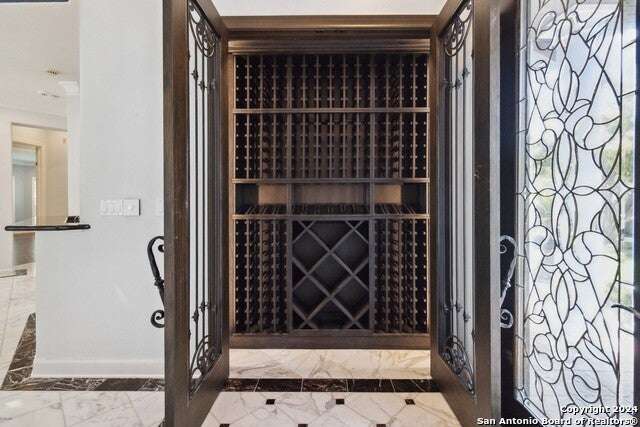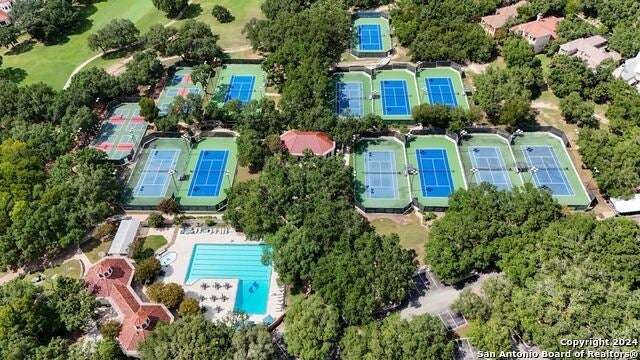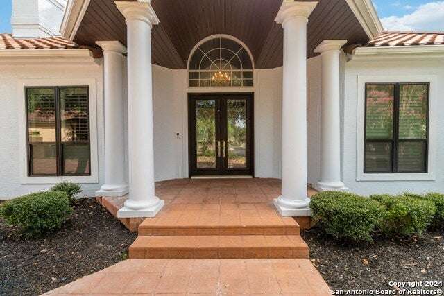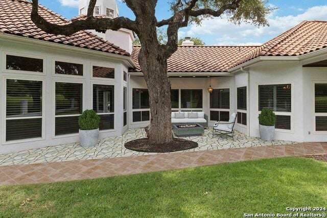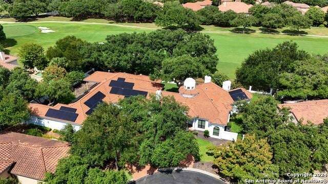Nestled in the prestigious Dominion community, this timeless single-story estate exudes a perfect blend of clean sophistication and transitional modern design offering 5 bedrooms, 5.5 bath, 3 car garage and 4595 square feet. As you step inside, the elegance of marble floors and the sparkle of exquisite chandeliers draw your eye to the high ceilings, and featuring 4 fireplaces creating ambience in all living ares, study, and primary bedroom. The lovely wince storage behind custom iron doors at the entry provides a prominent display of your wine collection. The expansive views of the 10th hole of The Dominion Golf Course providing amazing views and and appeals the golf enthusiast. This home is designed for both grand entertaining and intimate gatherings. The formal living and dining rooms are complemented by a stylish bar, setting the stage for memorable evenings. The newly remodeled Chef's kitchen, featuring stainless steel appliances and custom solid wood cabinetry, opens seamlessly to the secondary family room, creating a warm and inviting space for daily living. The master suite is a true retreat, with stunning hardwood floors, a cozy fireplace, and a spa-like bathroom that boasts his and hers closets. The private patio offers serene views of the golf course, making it the perfect spot for morning coffee or evening relaxation. Guests are comfortably accommodated in three spacious secondary bedrooms, each with en-suite bathrooms, providing privacy and luxury. A separate fifth bedroom with a full bath offers additional flexibility, ideal for guests or live-in help accessing this space from the garage. Outside, the lush greenery and multiple patios create a serene oasis. The summer kitchen is perfect for al fresco dining, with the beauty of The Dominion Golf Course and mature trees as your backdrop. This estate is more than a home; it's a lifestyle of unparalleled elegance and comfort.