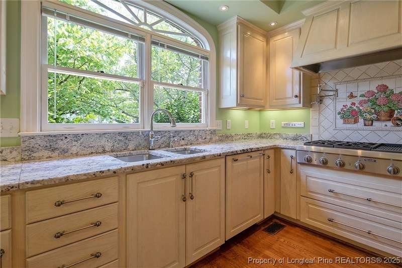 Beautiful executive home in historic Haymount located on a corner lot, bordered by a stately wrought iron fence. Meticulously maintained, with an elevator for ease and convenience. The elegant interior features hardwood floors, custom wood plantation shutters, crown molding, new gas fireplace logs in living room and a Waterford crystal chandelier in the formal dining room. The chef's kitchen is a gourmet's dream, with stainless Thermador appliances, granite countertops, custom-made cabinetry, warming ovens, large baker's island complete with unique amenities, and an imported Italian hand-painted tile mural over the cooktop. A spacious breakfast room opens into a bright Garden Room overlooking a private garden with fishpond and mature plantings. Downstairs primary suite with gas fireplace and separate dressing room. Two upstairs bedrooms, full baths, and bonus room. Abundant closet space and storage throughout. New tankless water heater in 2022, HVAC in 2019 (downstairs). A dream home!