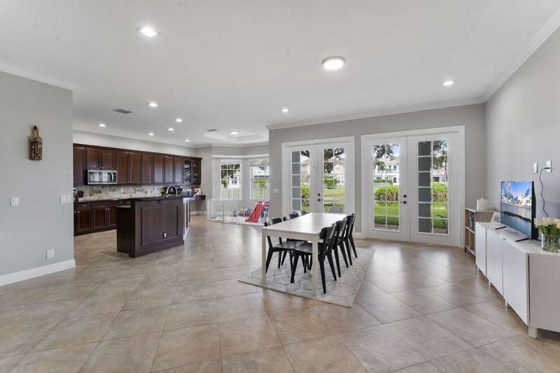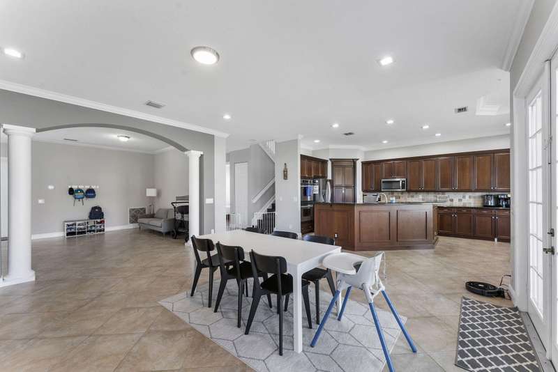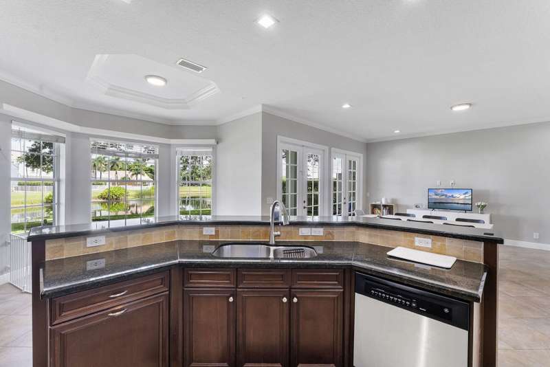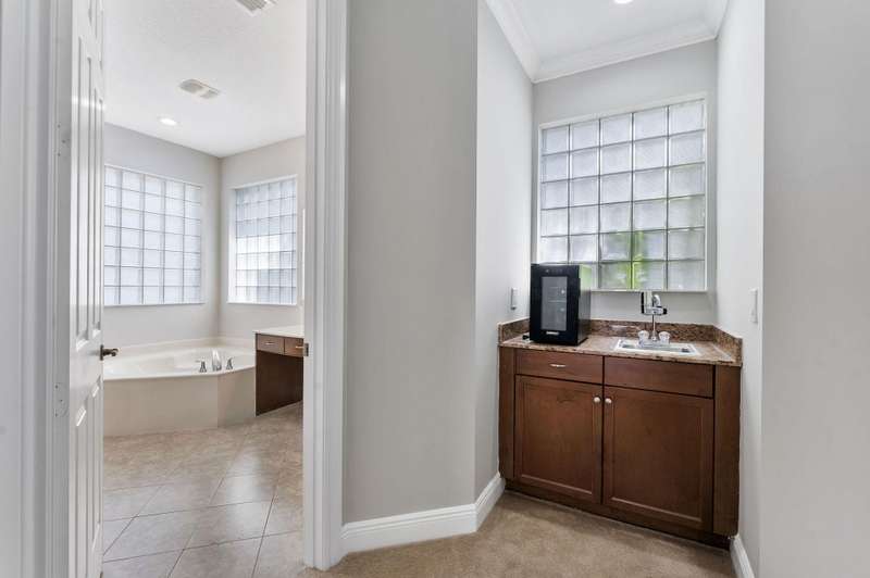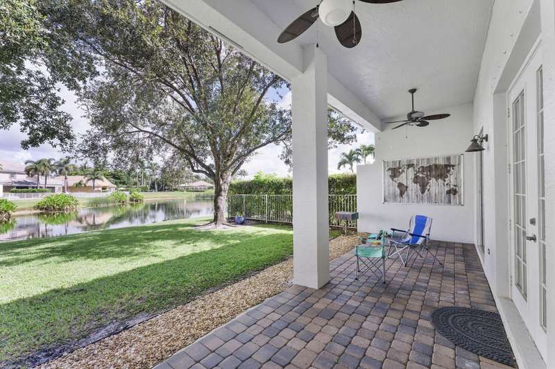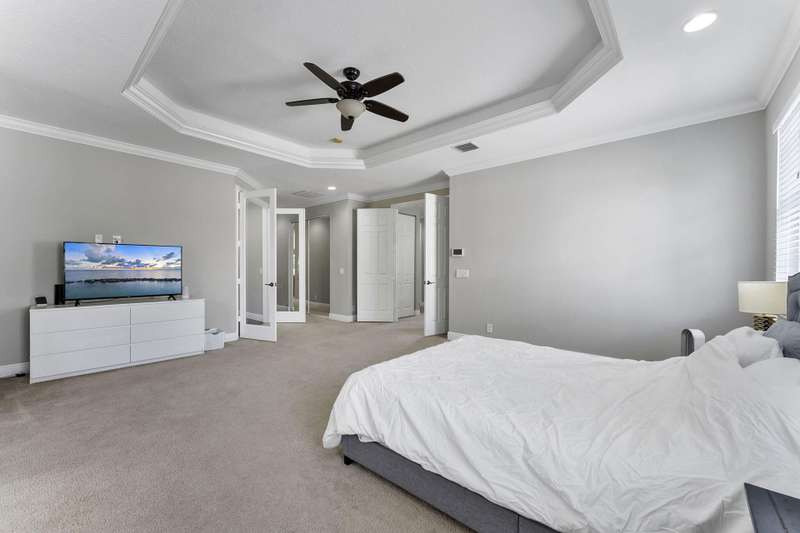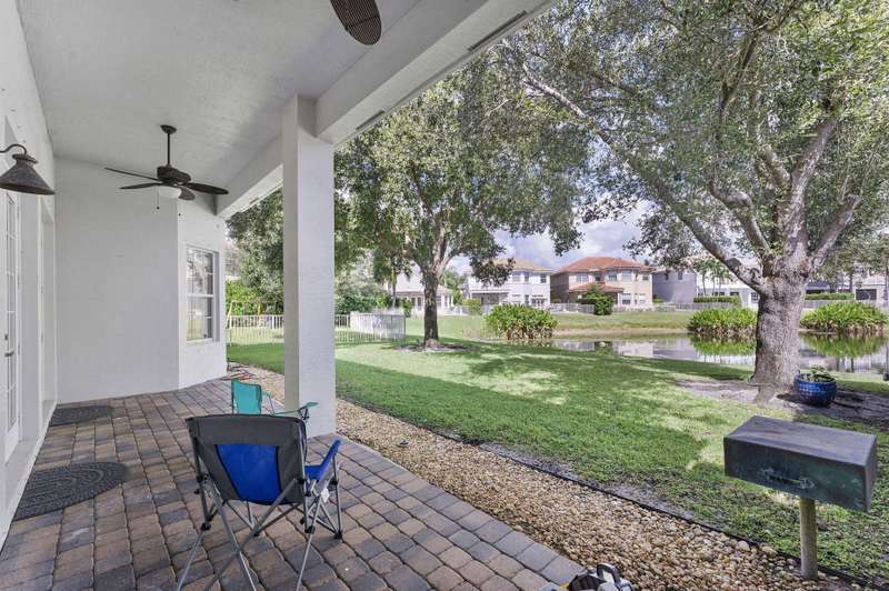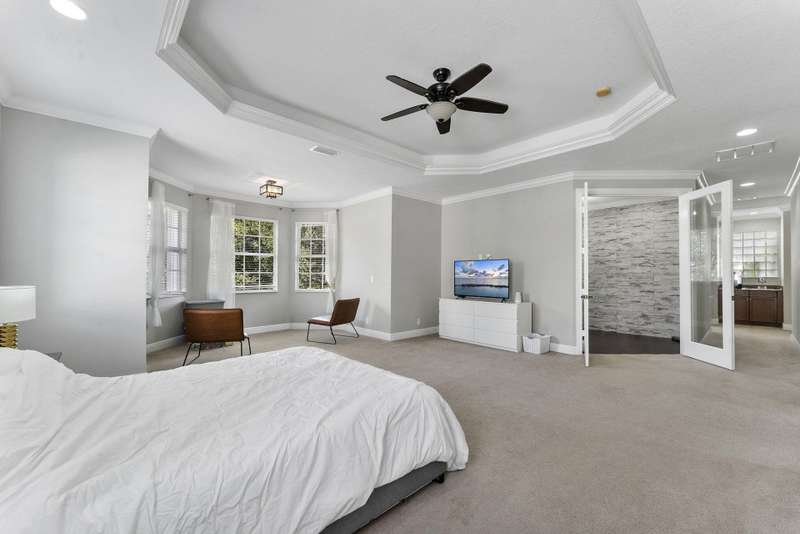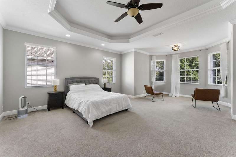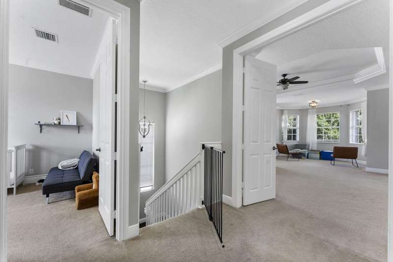 Welcome to this beautiful home featuring breathtaking lake views in a quiet, gated neighborhood. This exceptional property includes a 3-car garage and offers 2 bedrooms and 2 full bathrooms on the first floor, making it perfect for guests or multigenerational living. Step through the French doors to a covered lanai that presents stunning lake vistas, ideal for outdoor entertaining.The chefs kitchen, equipped with premium finishes and a spacious breakfast bar, is designed for gatherings of any size. Upstairs, the opulent master suite boasts a sitting area, versatile bedroom space for a home office or nursery, and two expansive walk-in closets. The updated master bath features a luxurious shower, a separate soaking tub, and dual sinks.Additional highlights include two large bedrooms,