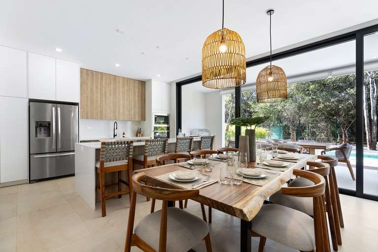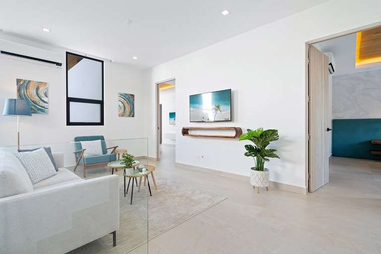 Built with high-quality concrete block construction and elevated with elegant teak-inlaid ceilings, recessed LED lighting, and sleek modern finishes, Villa Tropical Dawn delivers both durability and style. The villa spans two levels, with a well-laid-out floor plan tailored for comfort and privacy. On the ground floor, a bright and open living room connects effortlessly with the dining area, chef's kitchen, and an expansive terrace through oversized sliding glass doors—inviting the outside in and offering the essence of tropical living. The spacious bunk room on this level was designed as a playful sanctuary for kids, complete with four single beds and plenty of room to relax.