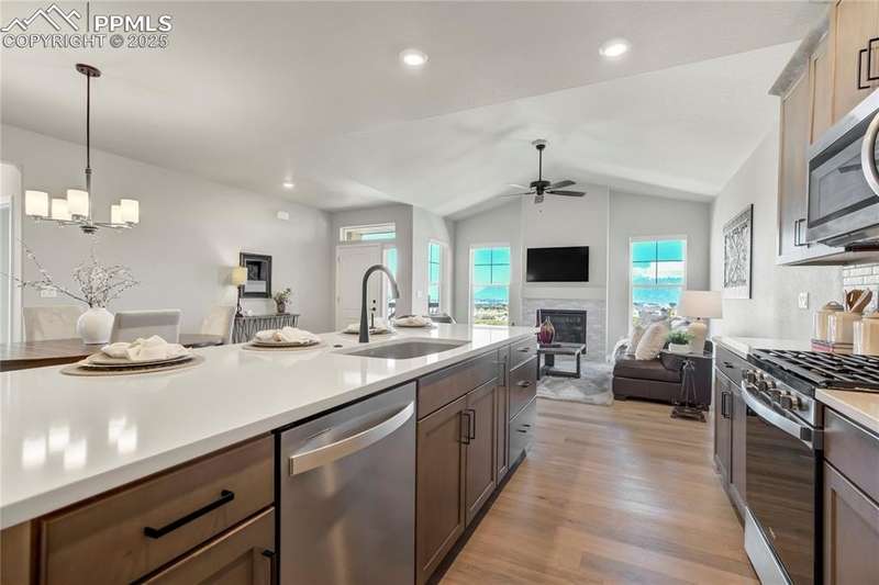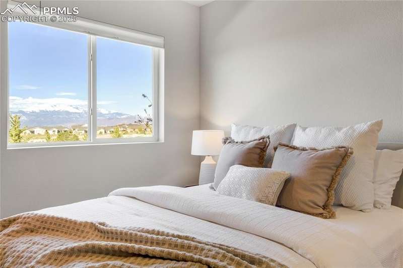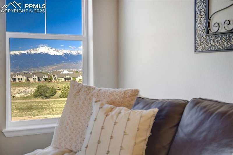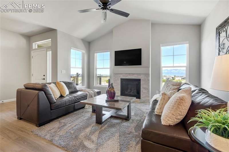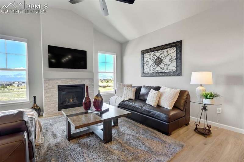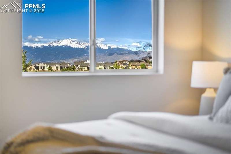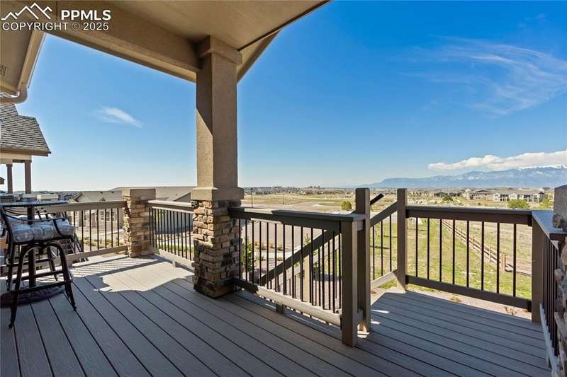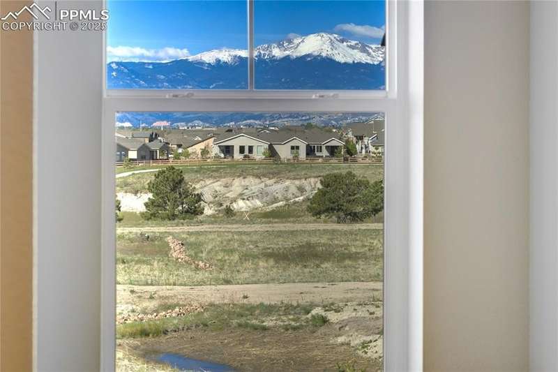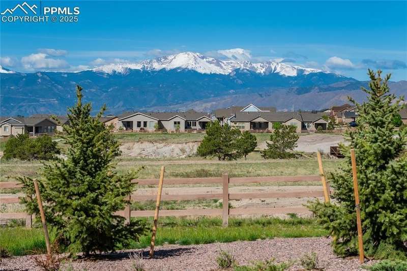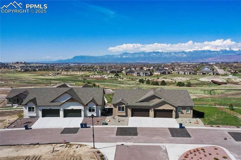 A true Colorado sanctuary—this impeccably upgraded ranch-style residence backs to open space and offers front-row views of Pikes Peak, Garden of the Gods + the Front Range, delivering unmatched design, comfort + scenery in one breathtaking package. Designed with comfort, beauty + living in mind, the open-concept floor plan showcases White Oak eng wood floors, Aristocrat cabinetry w/matte black hardware, upgraded Shaw carpet w/8lb pad + soaring 9’ ceilings. The welcoming great room is centered by a gas fireplace w/stone surround + framed by walls of windows perfectly capturing Colorado’s iconic vistas. The chef’s kitchen balances style and function w/quartz countertops, Whirlpool stainless steel appliances, a gas range/oven, soft-close cabinetry, a walk-in pantry + a generous center island designed for gathering. Retreat to the spa-worthy primary suite, featuring Bianco Antico slab granite counters, a standalone tiled shower w/mosaic accents, porcelain tile floors + walk-in closet. Additional bedroom, a 3/4 bath w/designer finishes + a main level laundry room w/a utility sink + patterned luxury vinyl flooring add flexibility + ease. The finished walk-out basement offers expansive recreation spaces, soaring 9’ ceilings, bedroom and full bathroom and is pre-plumbed for a future junior suite w/private ensuite bath + wet bar. Add highlights include: Reem tankless hwh, Trane 96% high-efficiency furnace, central a/c, Nest thermostat + wood shelving throughout closets + pantry. Outdoor living is just as effortless w/a covered patio + stunning views—designed for relaxation, entertaining + savoring every sunset. Located in Wolf Ranch w/miles of trails, Wolf Lake for paddleboarding/kayaking, numerous parks + playgrounds, community recreation center w/pool, splash park, clubhouse and future plans include a second, state-of-the-art Rec Center. Award-winning D20 schools complete the package. Move-in ready, meticulously maintained + crafted for a life of beauty, connection + ease.