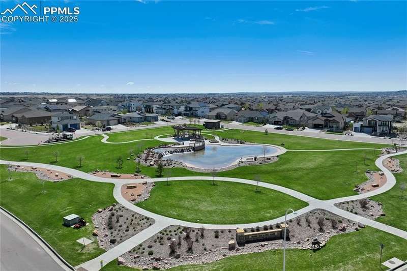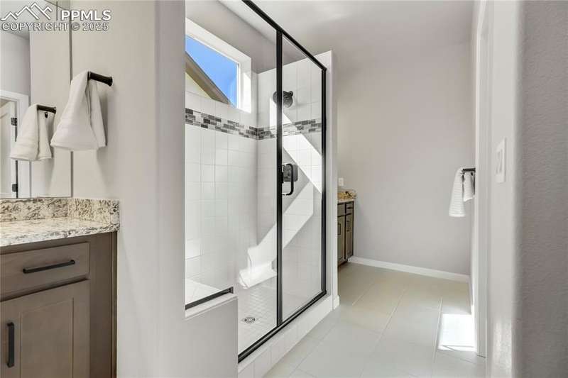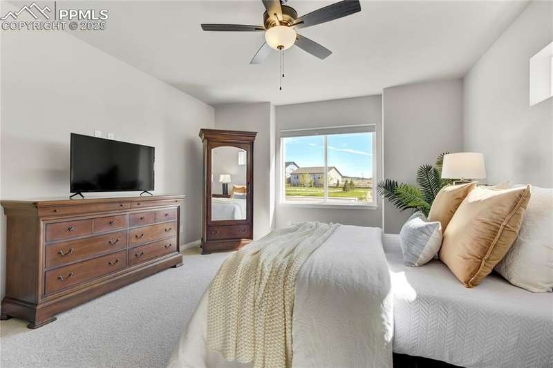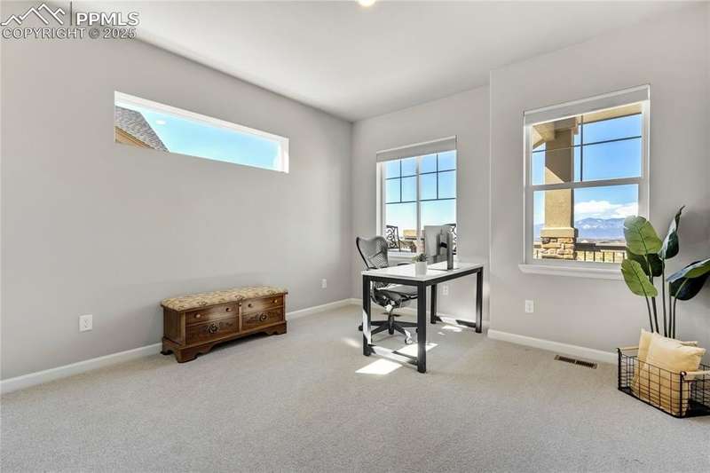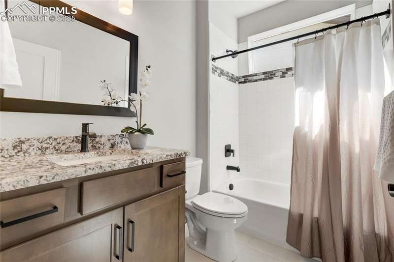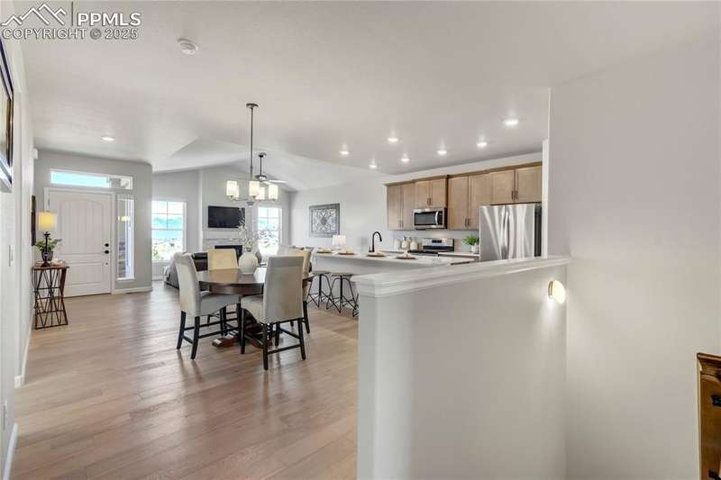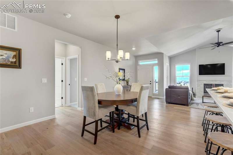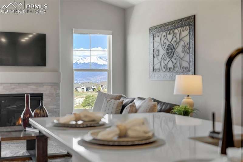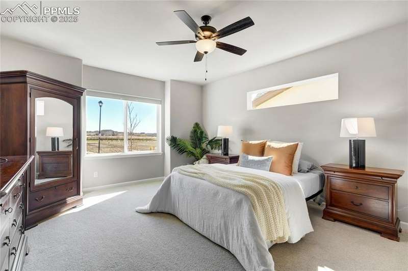 A true Colorado sanctuary—this impeccably upgraded ranch-style residence backs to open space and offers front-row views of Pikes Peak, Garden of the Gods + the Front Range, delivering unmatched design, comfort + scenery in one breathtaking package. Designed with comfort, beauty + living in mind, the open-concept floor plan showcases White Oak eng wood floors, Aristocrat cabinetry w/matte black hardware, upgraded Shaw carpet w/8lb pad + soaring 9’ ceilings. The welcoming great room is centered by a gas fireplace w/stone surround + framed by walls of windows perfectly capturing Colorado’s iconic vistas. The chef’s kitchen balances style and function w/quartz countertops, Whirlpool stainless steel appliances, a gas range/oven, soft-close cabinetry, a walk-in pantry + a generous center island designed for gathering. Retreat to the spa-worthy primary suite, featuring Bianco Antico slab granite counters, a standalone tiled shower w/mosaic accents, porcelain tile floors + walk-in closet. Additional bedroom, a 3/4 bath w/designer finishes + a main level laundry room w/a utility sink + patterned luxury vinyl flooring add flexibility + ease. The finished walk-out basement offers expansive recreation spaces, soaring 9’ ceilings, bedroom and full bathroom and is pre-plumbed for a future junior suite w/private ensuite bath + wet bar. Add highlights include: Reem tankless hwh, Trane 96% high-efficiency furnace, central a/c, Nest thermostat + wood shelving throughout closets + pantry. Outdoor living is just as effortless w/a covered patio + stunning views—designed for relaxation, entertaining + savoring every sunset. Located in Wolf Ranch w/miles of trails, Wolf Lake for paddleboarding/kayaking, numerous parks + playgrounds, community recreation center w/pool, splash park, clubhouse and future plans include a second, state-of-the-art Rec Center. Award-winning D20 schools complete the package. Move-in ready, meticulously maintained + crafted for a life of beauty, connection + ease.