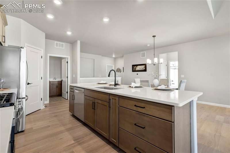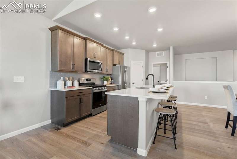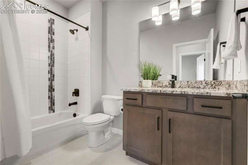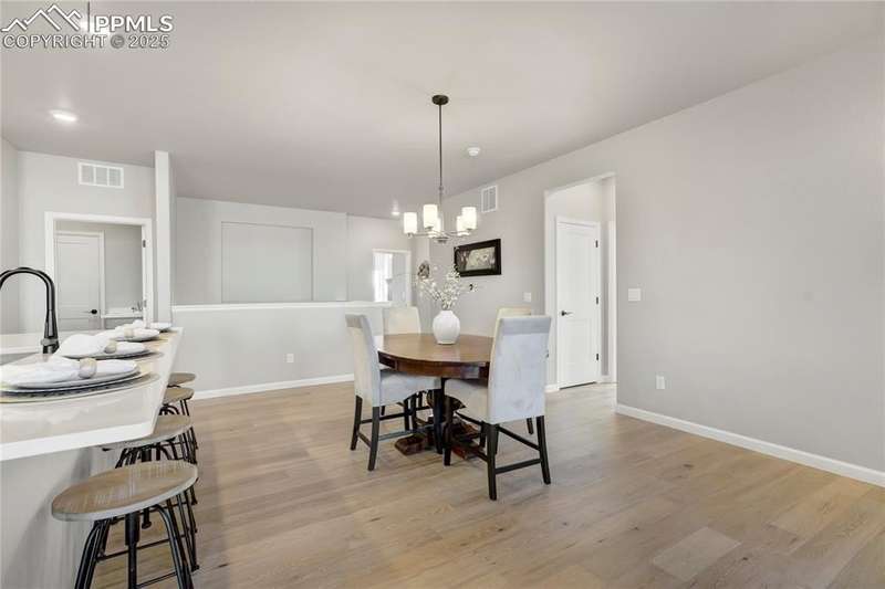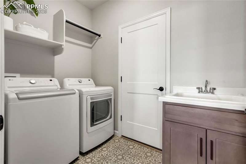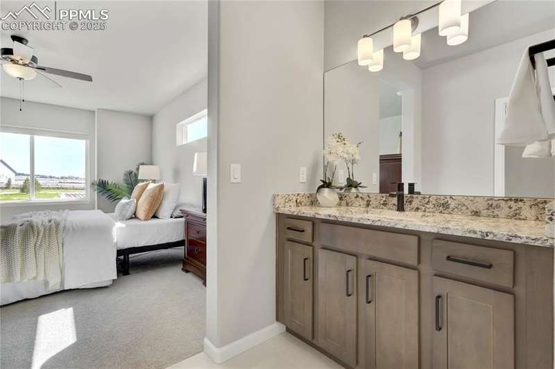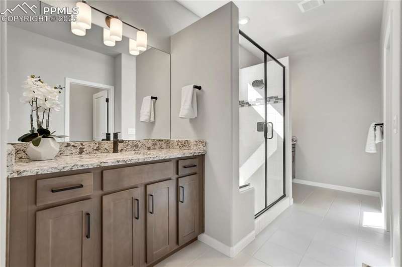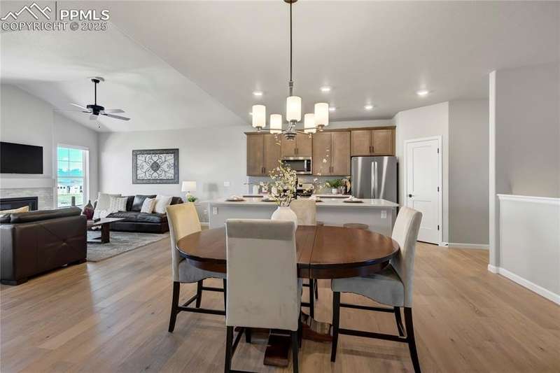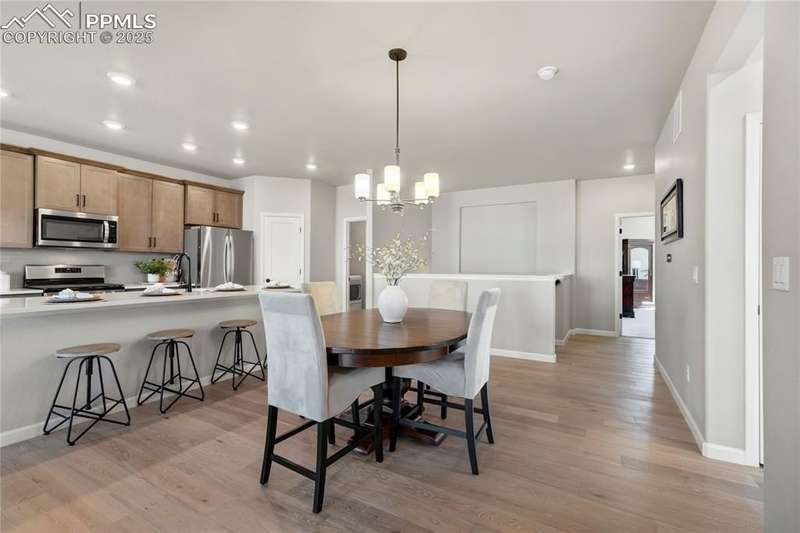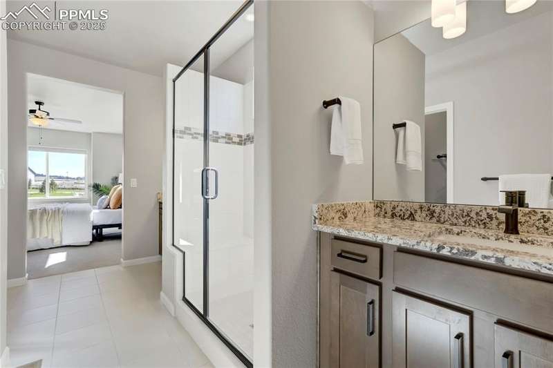 A true Colorado sanctuary—this impeccably upgraded ranch-style residence backs to open space and offers front-row views of Pikes Peak, Garden of the Gods + the Front Range, delivering unmatched design, comfort + scenery in one breathtaking package. Designed with comfort, beauty + living in mind, the open-concept floor plan showcases White Oak eng wood floors, Aristocrat cabinetry w/matte black hardware, upgraded Shaw carpet w/8lb pad + soaring 9’ ceilings. The welcoming great room is centered by a gas fireplace w/stone surround + framed by walls of windows perfectly capturing Colorado’s iconic vistas. The chef’s kitchen balances style and function w/quartz countertops, Whirlpool stainless steel appliances, a gas range/oven, soft-close cabinetry, a walk-in pantry + a generous center island designed for gathering. Retreat to the spa-worthy primary suite, featuring Bianco Antico slab granite counters, a standalone tiled shower w/mosaic accents, porcelain tile floors + walk-in closet. Additional bedroom, a 3/4 bath w/designer finishes + a main level laundry room w/a utility sink + patterned luxury vinyl flooring add flexibility + ease. The finished walk-out basement offers expansive recreation spaces, soaring 9’ ceilings, bedroom and full bathroom and is pre-plumbed for a future junior suite w/private ensuite bath + wet bar. Add highlights include: Reem tankless hwh, Trane 96% high-efficiency furnace, central a/c, Nest thermostat + wood shelving throughout closets + pantry. Outdoor living is just as effortless w/a covered patio + stunning views—designed for relaxation, entertaining + savoring every sunset. Located in Wolf Ranch w/miles of trails, Wolf Lake for paddleboarding/kayaking, numerous parks + playgrounds, community recreation center w/pool, splash park, clubhouse and future plans include a second, state-of-the-art Rec Center. Award-winning D20 schools complete the package. Move-in ready, meticulously maintained + crafted for a life of beauty, connection + ease.