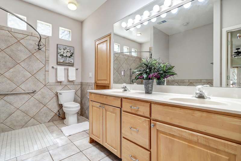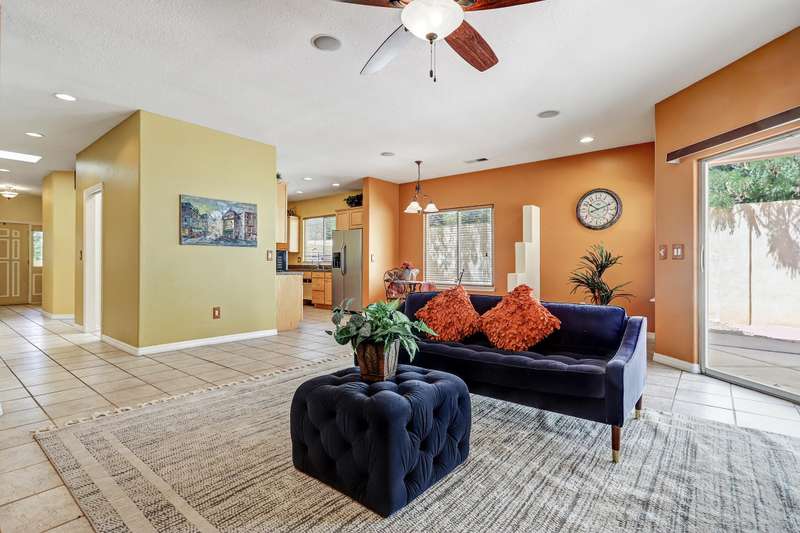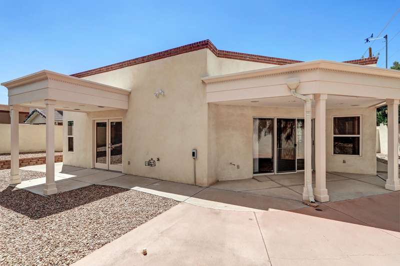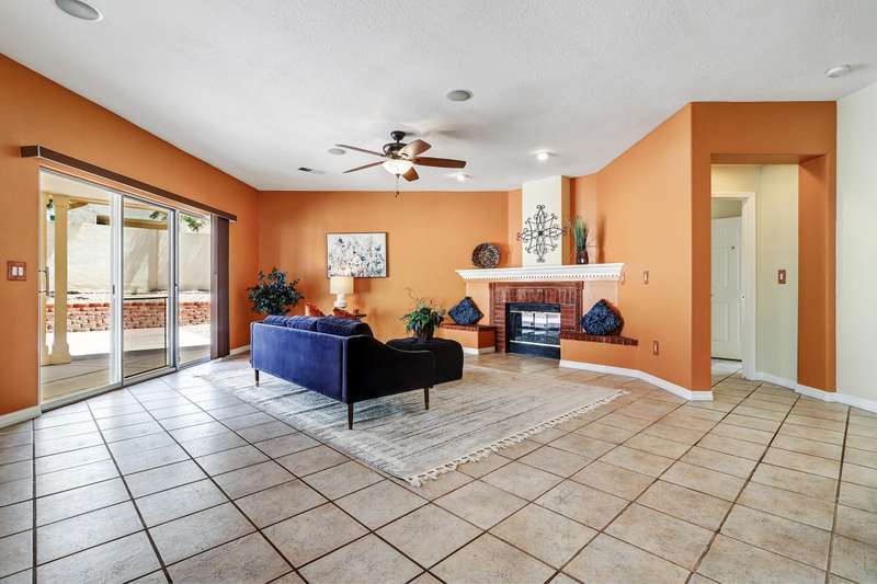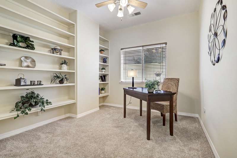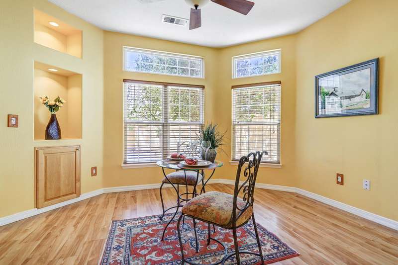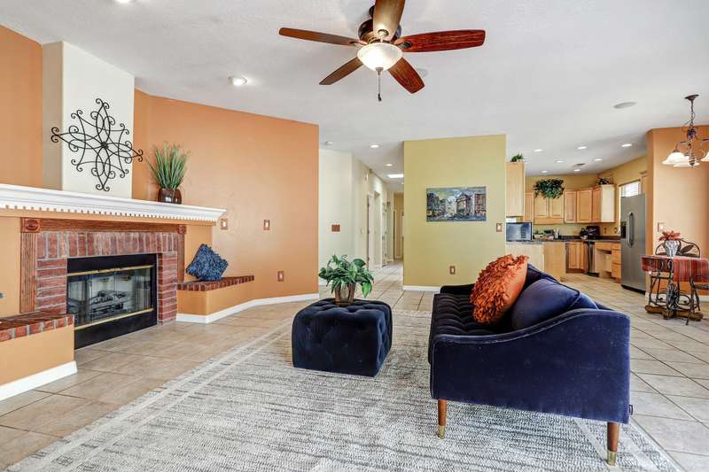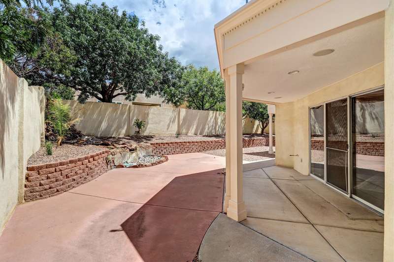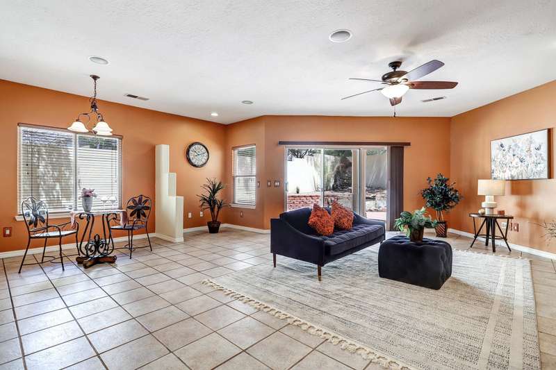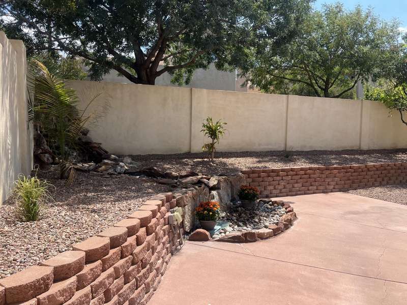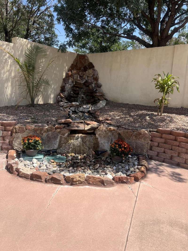 Discover this wonderful one-level Territorial-style home that blends charm, comfort, & accessibility. Thoughtfully designed with ADA compliance, it features wide hallways & large doors throughout. Inside, soaring ceilings & abundant natural light create an inviting atmosphere. A formal dining room & other eating space flows seamlessly into the great room, complete with a cozy gas-log fireplace. The large primary suite offers a luxurious bath w/ a garden tub, roll in shower, & dual sinks. 2 walk-in closets & a door to the back yard. Nice sized secondary bedroom & the 3rd bedroom would make a wonderful study w/ its built in book shelves. Out doors, enjoy the serene backyard with its beautiful waterfall feature & easy care landscape perfect for relaxation or entertaining.