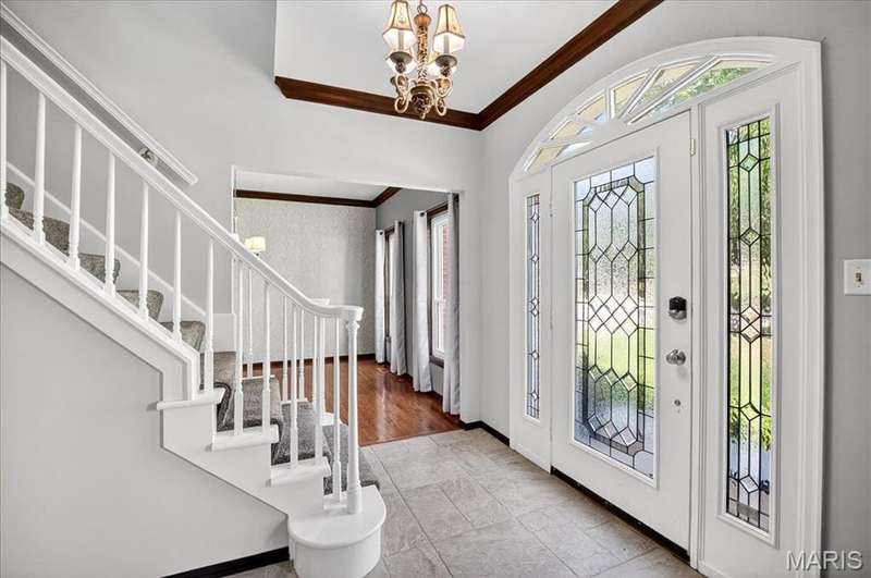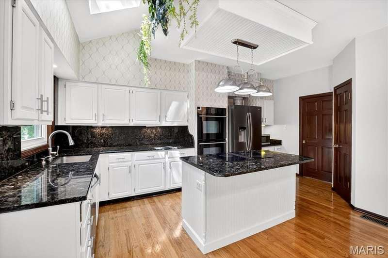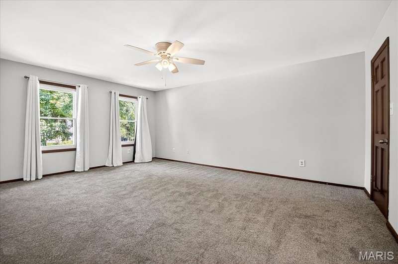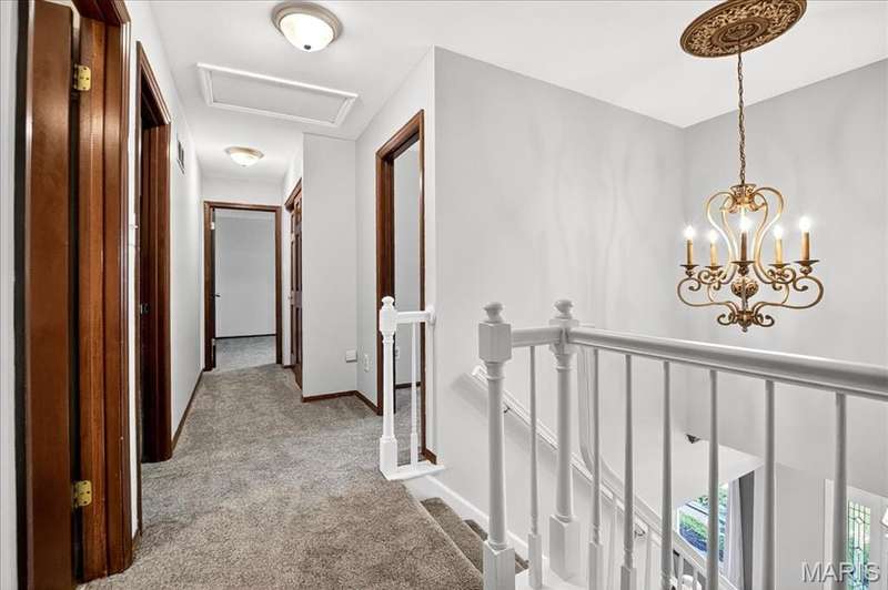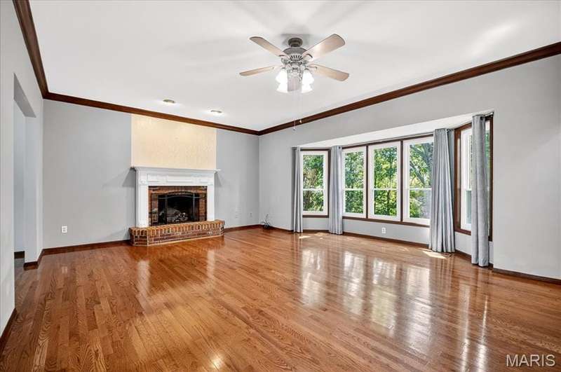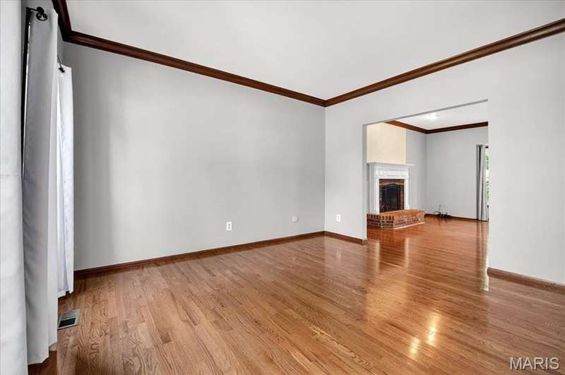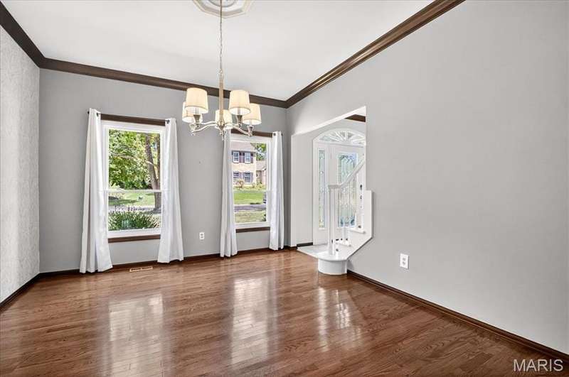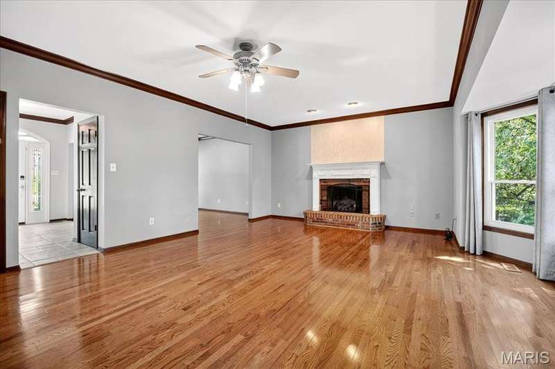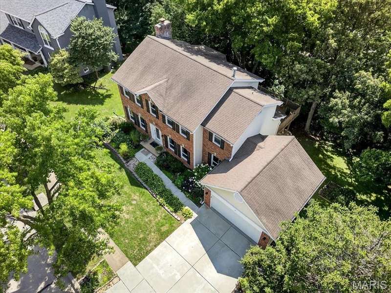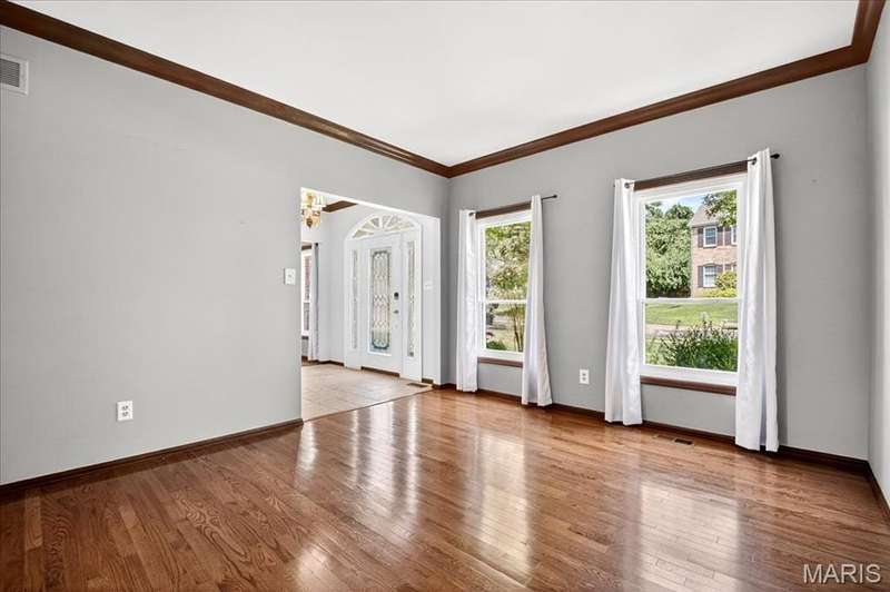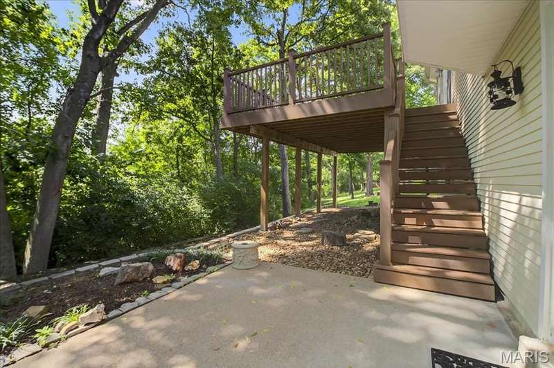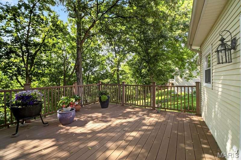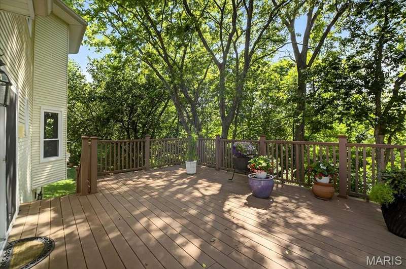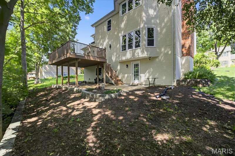 Spacious, Updated & Move-In Ready! This stunning brick home offers over 3,400 sq. ft. of living space designed for comfort and style. Gleaming hardwood floors flow throughout the main level, while brand-new carpet adds a fresh touch upstairs. The updated kitchen features granite counters, a center island, and stainless steel appliances, opening to the breakfast room with French doors leading to a large deckperfect for entertaining or relaxing among the treetop views. A convenient main-floor laundry room adds to the ease of everyday living. Upstairs, the luxurious primary suite boasts two walk-in closets and a spa-like en suite bath with double sinks, soaking tub, and separate shower. Three additional bedrooms share a spacious full bath with double sinks. The finished walkout lower level adds even more living space with a fifth bedroom with walk-in closetideal for guests, a home office, or recreation. Enjoy peace of mind with major updates, including energy-efficient windows (April 2025) and a new HVAC system (2024). All this in a great neighborhood with easy access to Hwy 270, 141, and I-44 for a convenient commute.