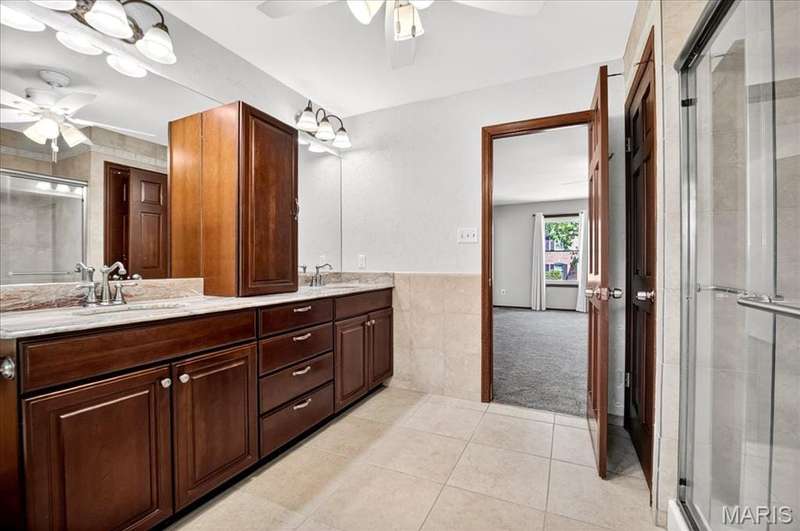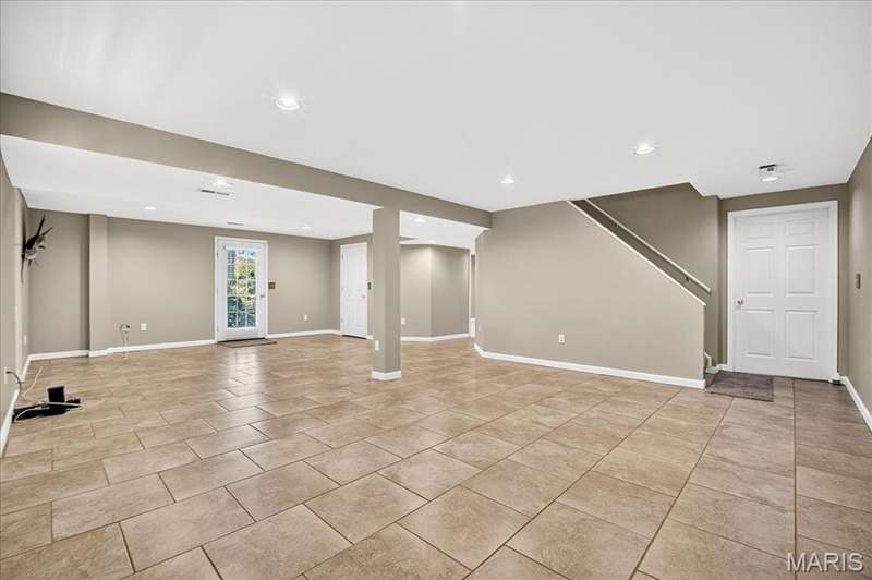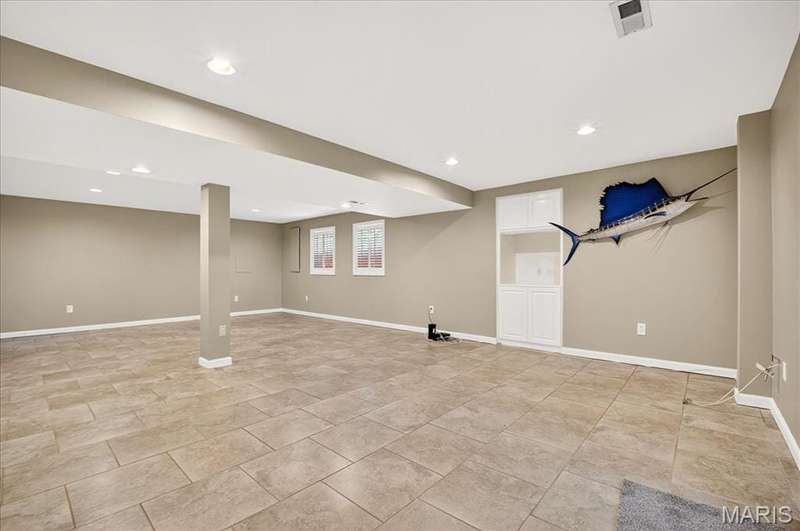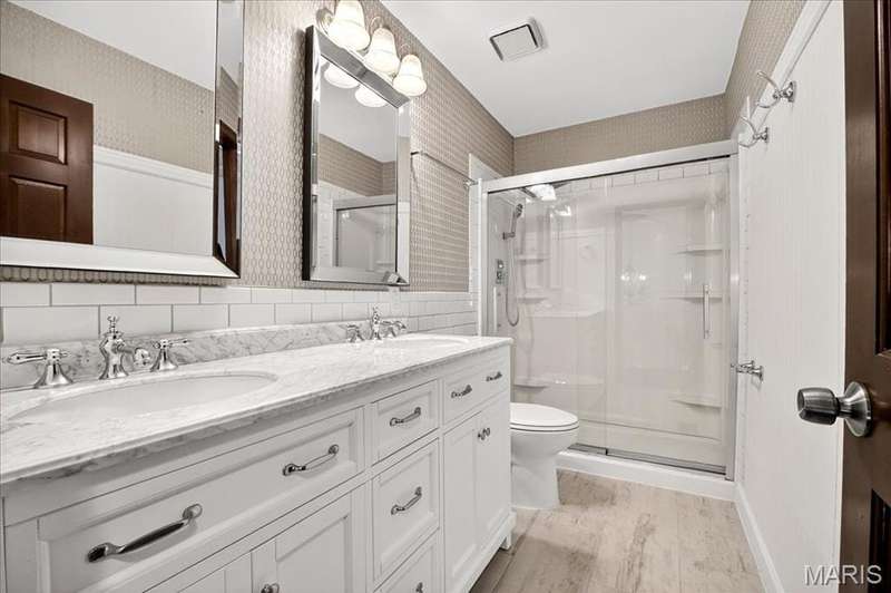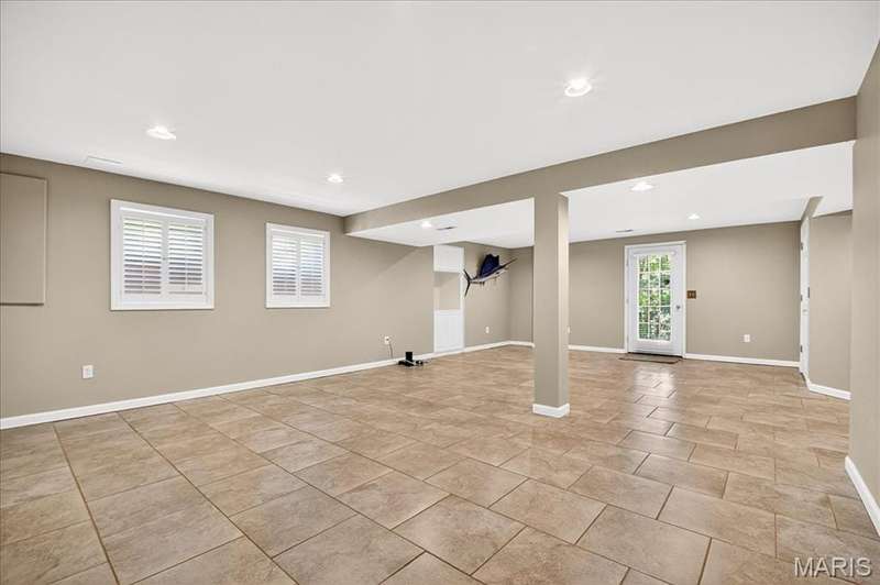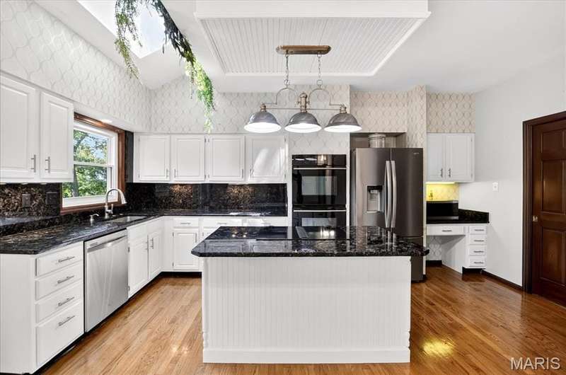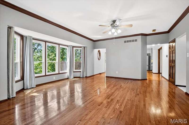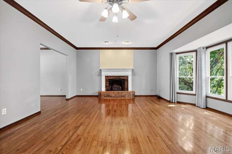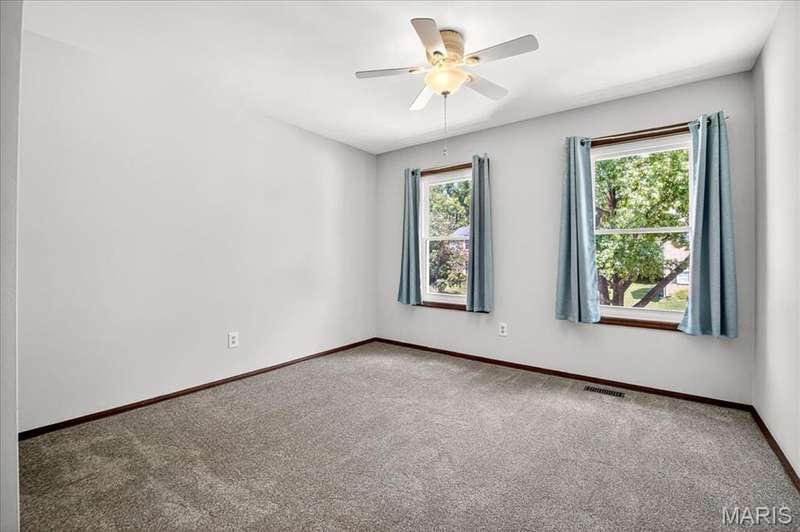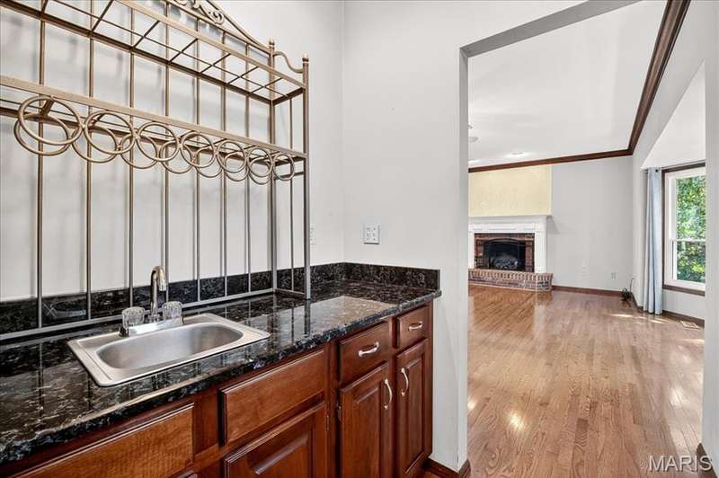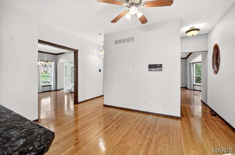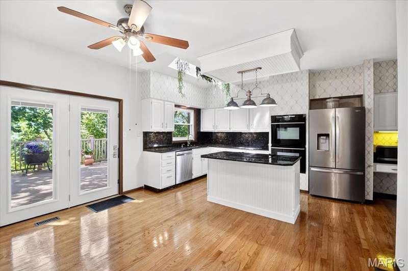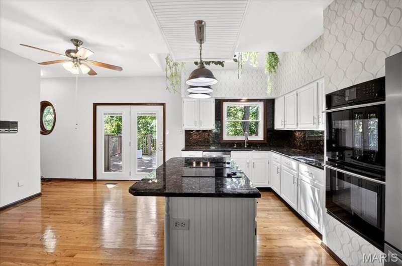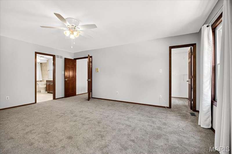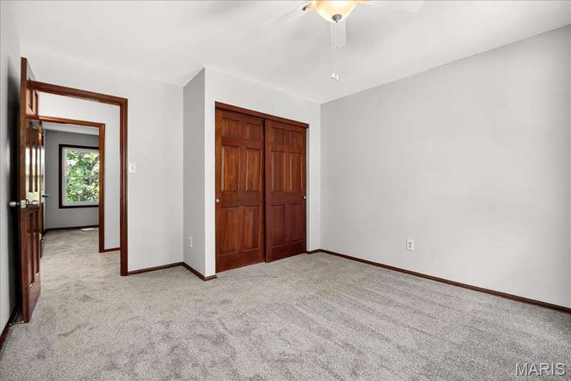 Spacious, Updated & Move-In Ready! This stunning brick home offers over 3,400 sq. ft. of living space designed for comfort and style. Gleaming hardwood floors flow throughout the main level, while brand-new carpet adds a fresh touch upstairs. The updated kitchen features granite counters, a center island, and stainless steel appliances, opening to the breakfast room with French doors leading to a large deckperfect for entertaining or relaxing among the treetop views. A convenient main-floor laundry room adds to the ease of everyday living. Upstairs, the luxurious primary suite boasts two walk-in closets and a spa-like en suite bath with double sinks, soaking tub, and separate shower. Three additional bedrooms share a spacious full bath with double sinks. The finished walkout lower level adds even more living space with a fifth bedroom with walk-in closetideal for guests, a home office, or recreation. Enjoy peace of mind with major updates, including energy-efficient windows (April 2025) and a new HVAC system (2024). All this in a great neighborhood with easy access to Hwy 270, 141, and I-44 for a convenient commute.