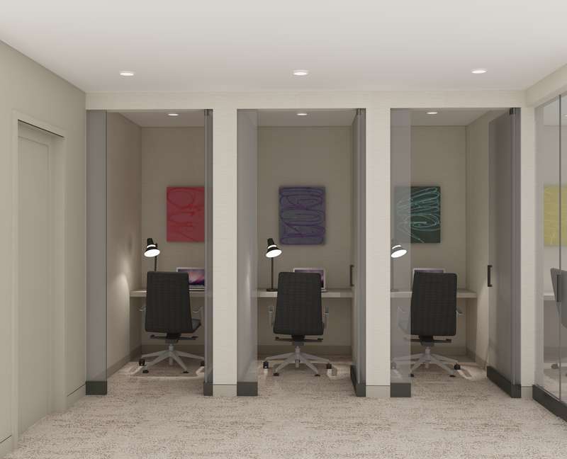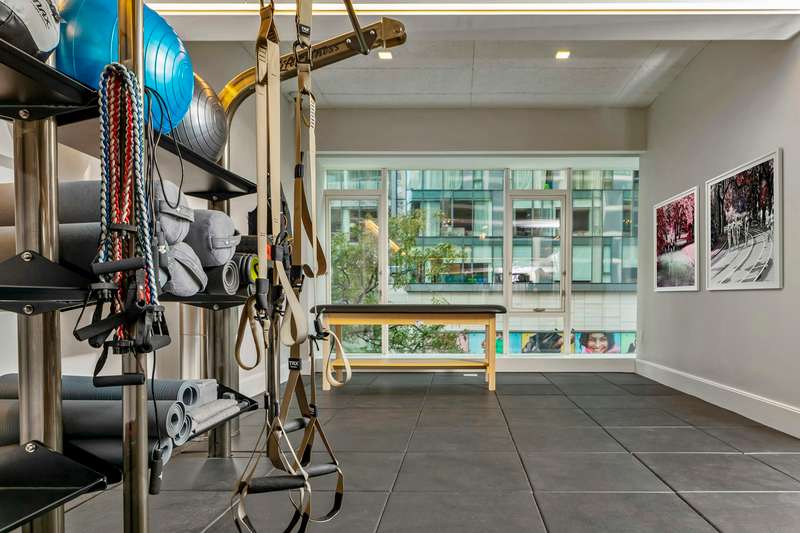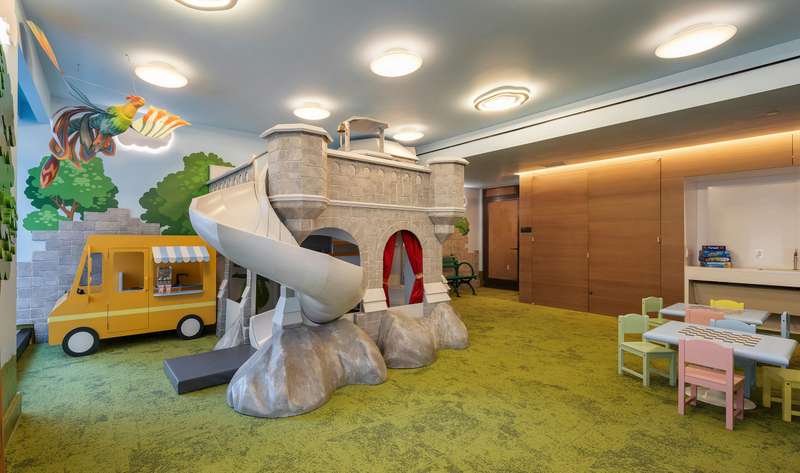 Amenities include a business center with four private study/Zoom rooms and a large meeting room; a Media Creation and Gaming room with Karaoke and musical instruments; a large and elegant lounge with a catering kitchen and landscaped terrace; a rooftop terrace with fireside seating, a kitchen with grill, and an outdoor shower; a windowed fitness center designed by The Wright Fit; a fun-filled playroom created by Silver Hill Atelier; as well as bicycle storage.