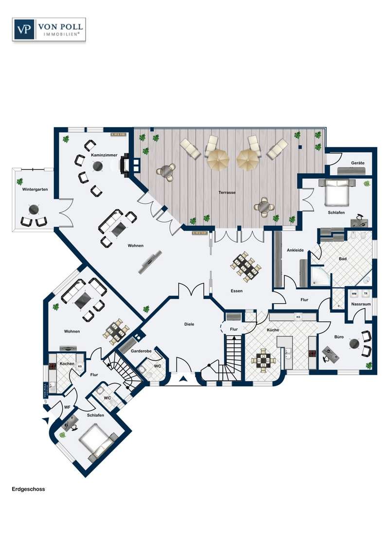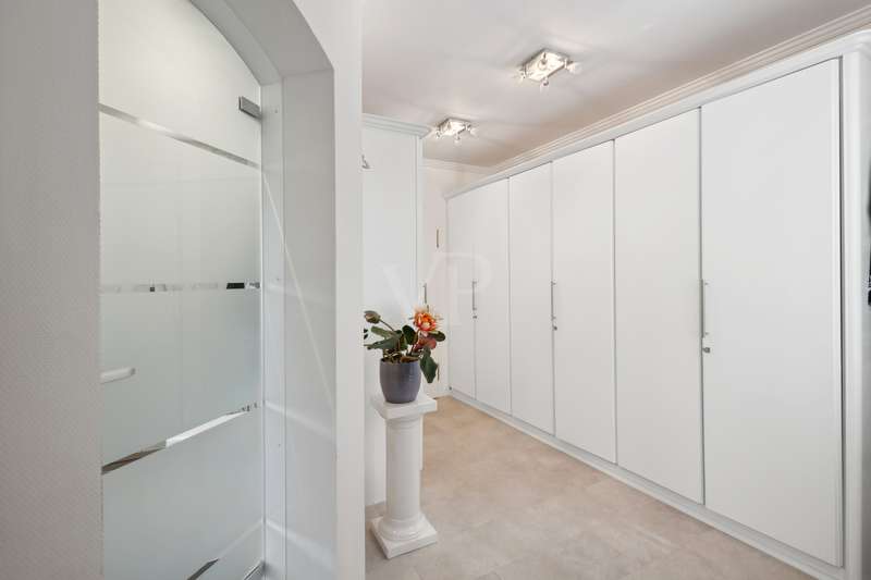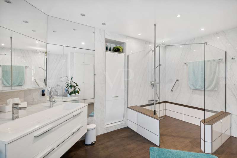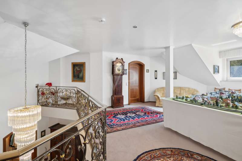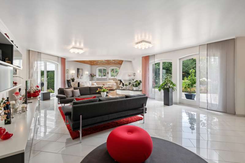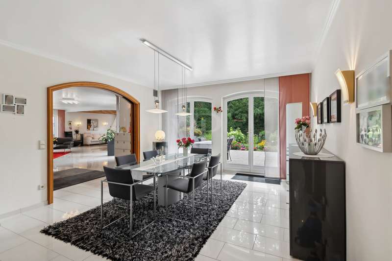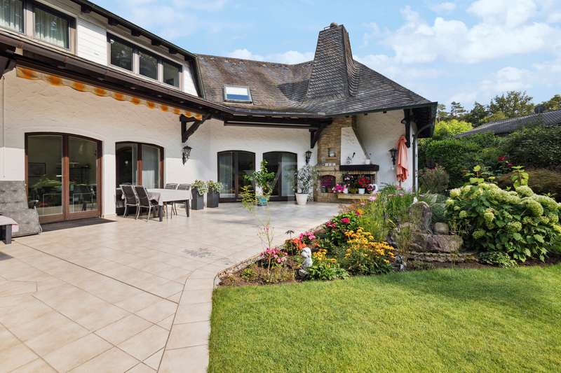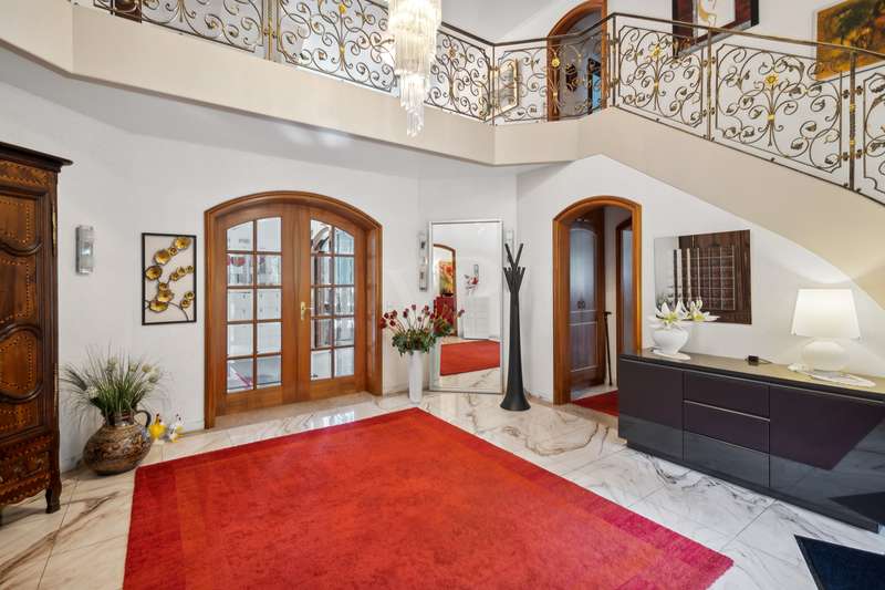 Welcome to the classic grace of Homburg. This first-class villa, built in 1986, sits majestically on a generous plot of approx. 1,663 m² and impresses with its unique architecture. The sophisticated design unfolds over two stylish levels with a living space of approx. 376 m² and also includes a basement with a shelter. The overall picture is completed by a granny apartment of approx. 70 m², which can be accessed via a separate side entrance. Upon entering this villa, you are greeted by an impressive entrance hall with an elegant marble floor and breathtaking ceiling height. The view of the open gallery enhances the feeling of spaciousness. A custom-made archway leads you into the heart of the property: the impressive living and dining area of approx. 100 m². The open fireplace in the fireplace room provides cozy warmth and contributes to the cozy atmosphere, while large windows offer a harmonious view of the well-tended gardens. An adjoining conservatory blurs the boundaries between inside and outside and provides the perfect place for a relaxed breakfast. The U-shaped kitchen, which is directly adjacent to the dining area, is equipped with high-quality electrical appliances and features a sophisticated marble worktop, providing the perfect setting for culinary delights. The sleeping area is located separately from the living area as a private retreat. A dressing room leads into this area, which is complemented by a spacious master bathroom with walk-in shower and double washbasin. The bedroom completes this elegant area and offers a comfortable retreat. The impressive marble staircase with handcrafted steel banisters leads to the next level of the villa's open gallery. Two branches lead off from here: In the left and right wings, you will find a bathroom, a bedroom and a living and studio area respectively. Each wing also offers access to a loggia or terrace with wonderful views. These separate areas are ideal as guest or children's wings. The basement also has its own wine cellar where you can enjoy a glass of your own wine. A sauna and wellness area invites you to relax, while a safe room provides additional security. A total of three garage parking spaces are available for your vehicles and offer secure protection. The garage can be reached easily and dry-footed via the staircase. Finally, you can enjoy the view of the idyllic gardens. The immaculately manicured lawn is framed by magnificent panicle and velvet hydrangeas as well as elegant grasses and perennials, which lend the surroundings a harmonious atmosphere. The spacious terrace invites you to linger not only on warm summer days, but also in the cooler seasons, as it is equipped with a cozy outdoor fireplace. This exceptional privacy creates a perfect retreat that invites relaxing moments and real rest. Immerse yourself in the atmosphere of this exclusive villa and discover your new home in a prime location in Homburg. Arrange a viewing appointment today.