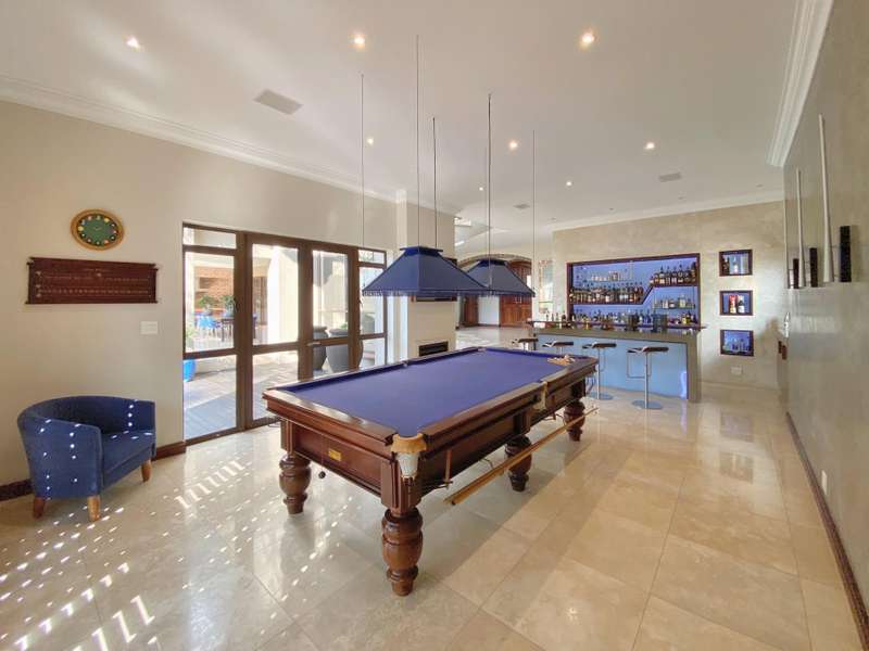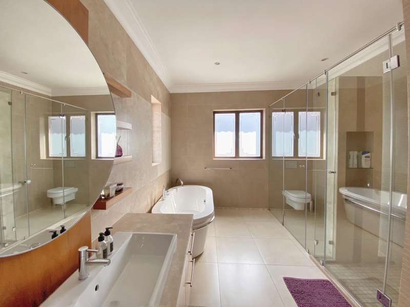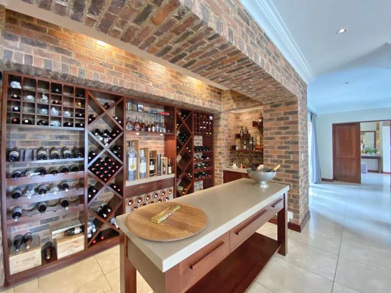 One is welcomed by open plan entrance hall featuring a spiral staircase, open plan entertainment lounge with modern fitted bar and private fitted study. The family room leads off from the entrance hall and offers a gas fireplace with the dining room adjacent to the lounge. The dining room also features a built-in wine area with serving station to wine and dine family and friends from. The large covered patio with built-in braai further enhances the entertainment features of this home.