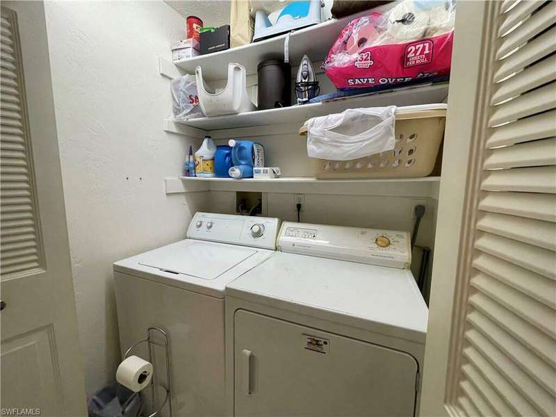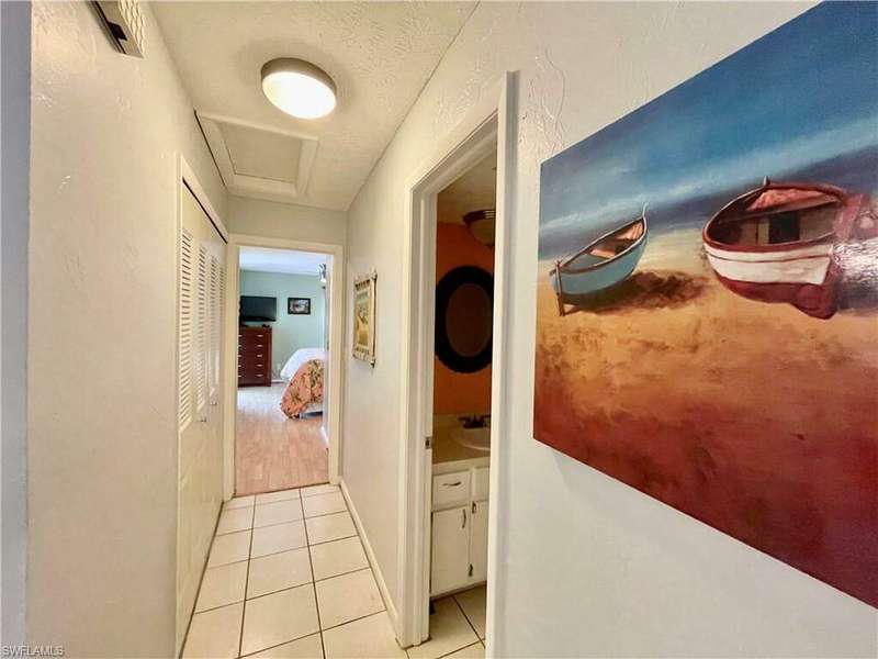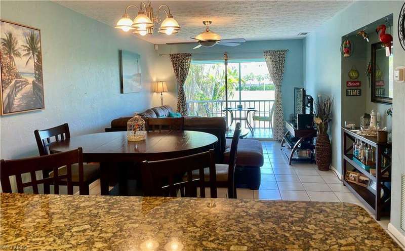 Opportunity knocks! ONLY AVAILABLE 2ND FLOOR CORNER END UNIT and comes with absolutely everything you need. Use it for personal use, or rent it out. Minimum is 30 day rental. This very gently-used condo is just waiting for you! Turnkey furnished with everything you need...including beach toys! You will find peace of mind knowing the metal roof is new, a/c is new, new water heater and the other appliances are newer and in tip top shape. Nice sized-lanai just off the gathering area or primary bedroom. Enjoy your morning or evening beverage, play some cards with friends or just enjoy a nice meal on your screened-in lanai. You can move right in to this split bedroom with 2 bedrooms and 2 bathrooms, with washer and dryer in unit. Gorgeous kitchen with glass tile backsplash, granite counters and lots of storage throughout. Bamboo and tile flooring throughout. Storage unit available for owner or tenant use close to the carport assigned parking space. Easy access to restaurants, nearby Fort Myers Beach and the beaches of the islands! Tennis and pickleball courts, swimming pool, shuffleboard and covered outdoor gathering are located near the pool. What else do you need? So close to the nearby beaches and restaurants, but without the cost! Call today for a private showing....You will be so happy you did!