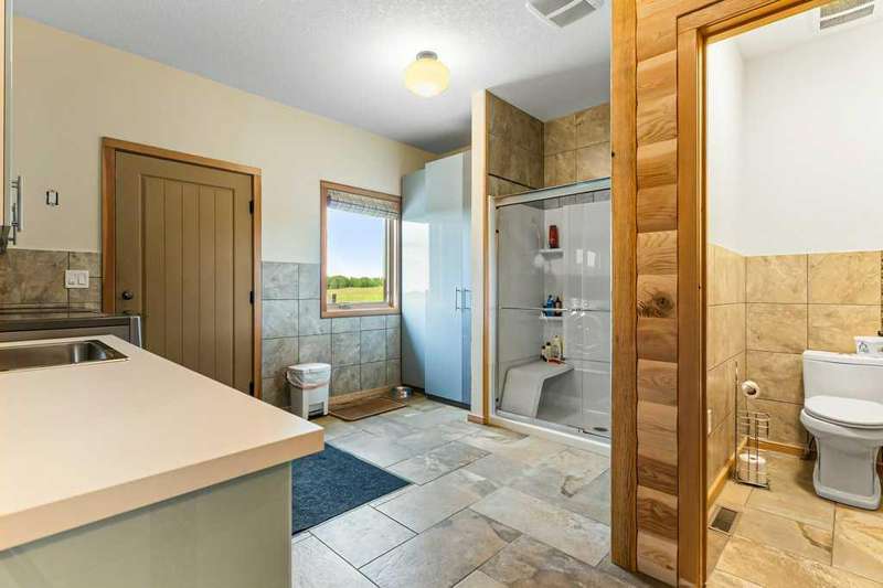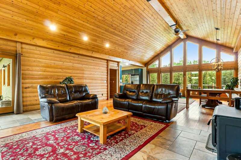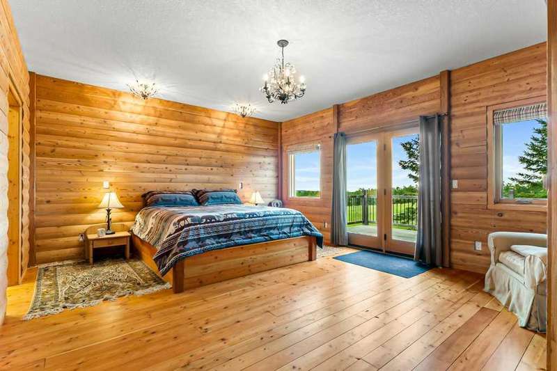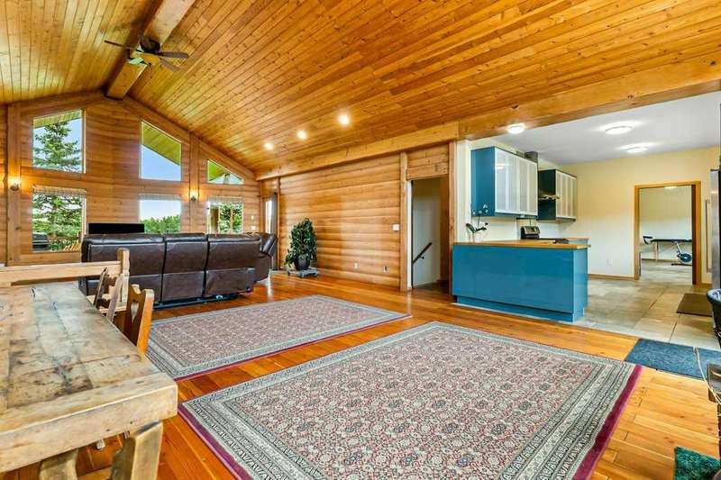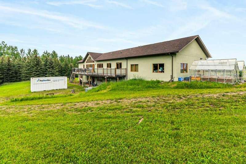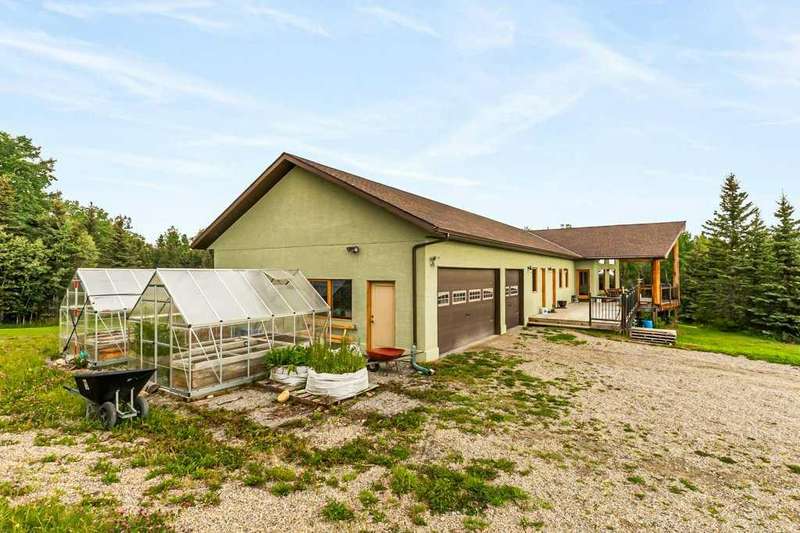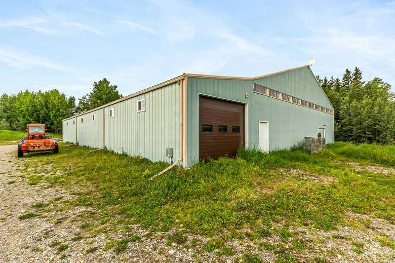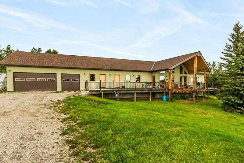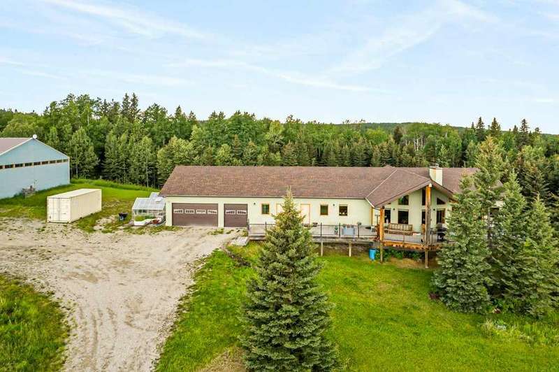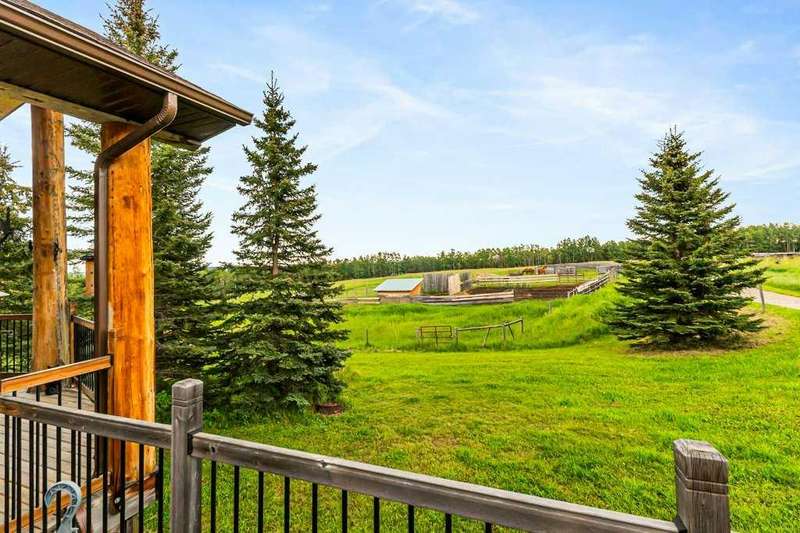 Stunning location just 10 minutes west of Water Valley. This beautiful 150-acre fenced and gated property offers a rare blend of open pasture, spacious yard, and dense forest with meandering creeks, creating an ideal setting for nature lovers, hunters and horse enthusiasts alike. The property includes a MASSIVE 100’ x 75’ INDOOR RIDING ARENA with a full-length 16’ side storage area along the east side—perfect for equipment, tack, and feed. Approximately 50 acres are dedicated to hay and pasture, while the balance is mature forest, offering privacy and recreational opportunities. North boundary is country grazing land and crown land is close by. Set up for a few horses with corrals and a round-pen. The unique 2,571 square foot walkout bungalow features vaulted ceilings and warm fir finishing throughout. The open-concept main living space includes a wood-burning stove, a huge kitchen ideal for gatherings, and a cozy family room perfect for relaxing. The spacious primary suite is located just off the living area and boasts a luxurious ensuite with a freestanding tub, dual vanities, water closet, brand new shower, wet sauna, and an expansive walk-in closet with custom cabinetry. The main floor also includes a second living area, flex space that was previously a second kitchen (see photos easily could be a second bed or office) and a convenient laundry room complete with a full bathroom, utility sink, and a shower that is also handy as a dog wash station. The bright and spacious lower walkout level includes a large living and recreation room, a full second kitchen, two generous bedrooms, a newly finished four-piece bath, another laundry station, plenty of storage, and a beautiful office with built-in cabinetry—ideal for working from home or another massive bedroom. Such a great space for multi-generational living or additional income. The centre piece of the lower level is a cast iron, top of the line HERGOM oven with a glass cooktop. Additional features include a heated triple attached garage, 30'x65' tarp storage building, BACK UP natural gas generator, two greenhouses for gardening, wood boiler system for the house in-floor heat and a massive west-facing deck to enjoy summer evenings. This exceptional property must be seen to be truly appreciated. Book your showing today!