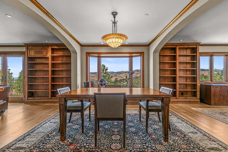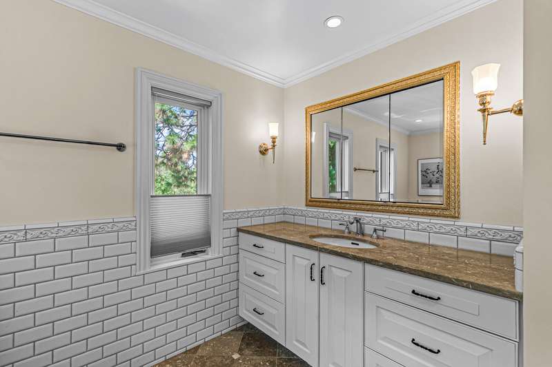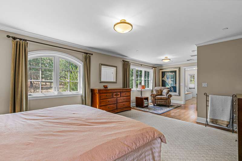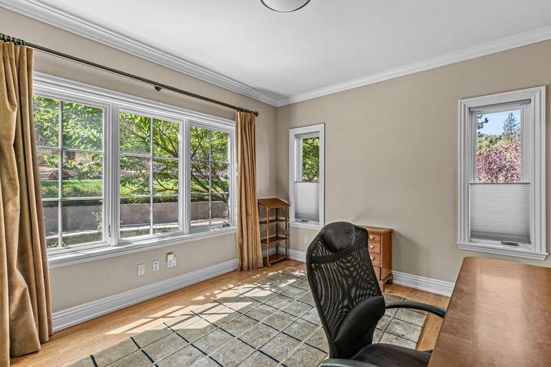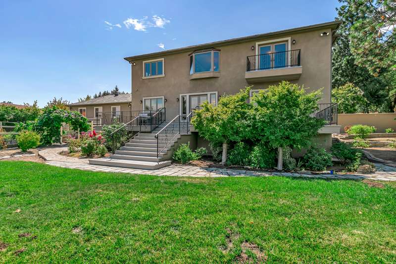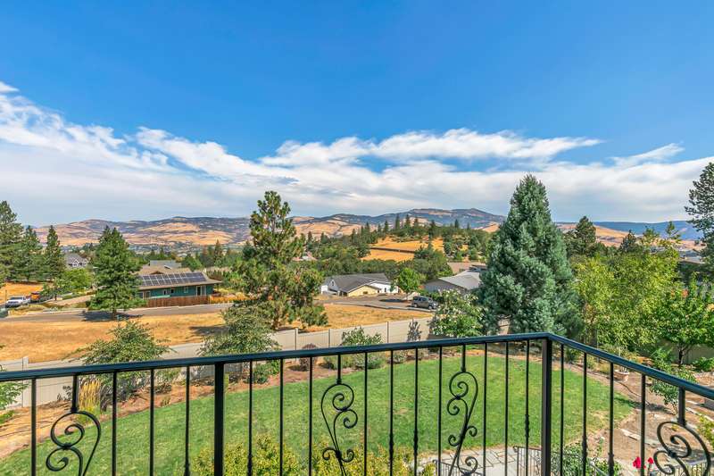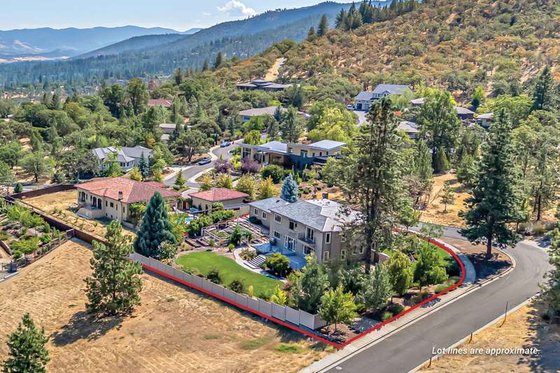 French provincial-inspired custom home located directly above Hald-Strawberry Park, just five minutes from Ashland's downtown plaza. Main level living room with integrated speakers, art lighting, gas fireplace, dining area with French doors to expansive view deck, gourmet kitchen with Electrolux Icon convection ovens and six-burner gas cooktop, powder room, media room, and office or guest bedroom with full ensuite bath. Spacious upper-level office, family room, and library with French doors to view balcony, gas fireplace, extensive custom built-in shelving. Primary bedroom with sitting area, two walk-in closets, and two full ensuite bathrooms with tiled showers, soaking tub, and sauna. Huge lower-level bonus room with washer, dryer, and utility sink. Detached three-car garage with attic storage. Landscaped grounds with mature trees, ornamental plantings, sunny gardening areas, grass lawn, stone and concrete patios. Inquire for details!