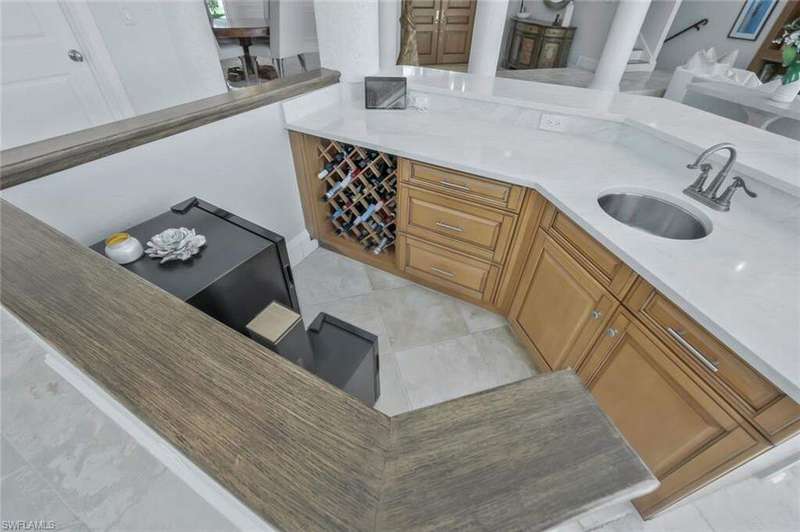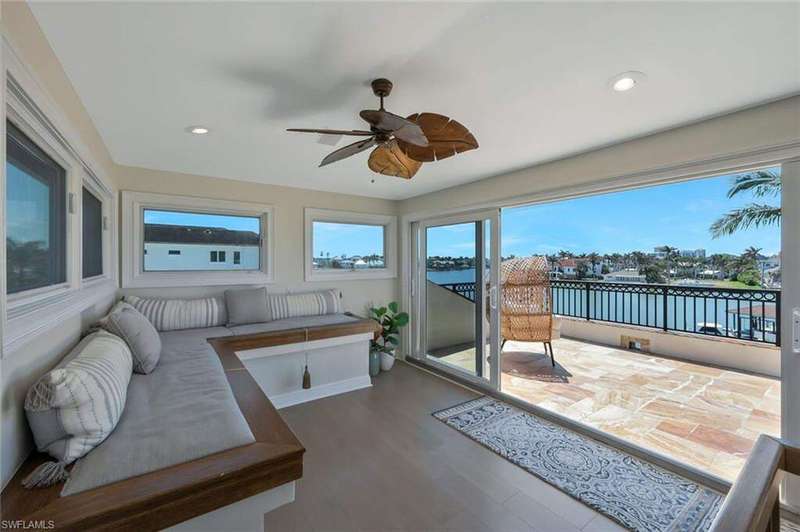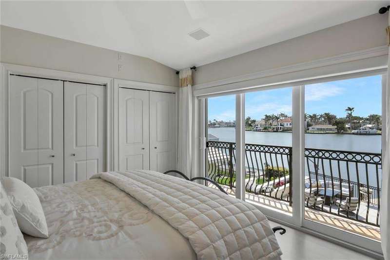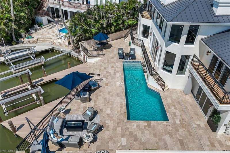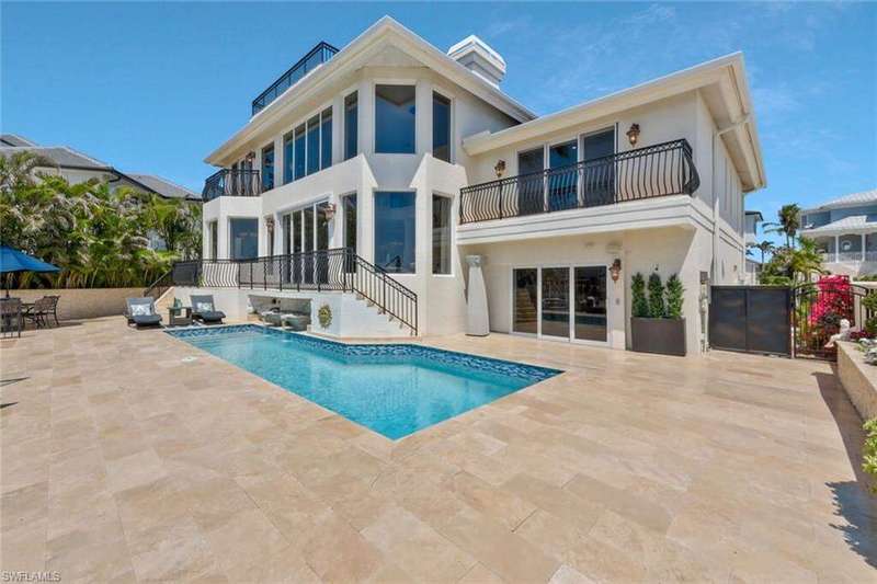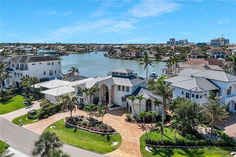 Sky-high waterfront fortress with 360 views, boat dock, pool, and southern exposure. Prepare to be captivated by this one-of-a-kind vertical masterpiece-a multi-story waterfront fortress in Naples that redefines luxury coastal living. With each level offering a unique experience, this architectural gem is designed for those who crave views, space, and unforgettable moments. From the moment you arrive, the circle driveway welcomes you with ease and elegance. Step inside to discover a custom-designed residence overflowing with natural light, dramatic floor-to-ceiling windows, and exquisite finishes throughout. Nearly every room showcases magnificent bay views, and the much-desired southern rear exposure ensures all-day sun and post-worthy sunsets from your pool deck. The ground level features a versatile family/recreation room with a full bathroom-ideal for guests, a gym, or game nights-that opens directly to the sun-soaked pool deck and private boat dock. Boating enthusiasts will love the direct Gulf access, updated pilings, and electric lift accommodating up to a 10,000 lb boat. The beautifully designed pool, surrounded by stunning travertine pavers, invites relaxation amid tranquil Gulf breezes. The second floor boasts the main living quarters with soaring ceilings, multiple dining areas, a custom wet bar with wine rack, and a show-stopping living room designed for effortless entertaining and everyday elegance. Stone pillars and travertine marble flooring elevate the ambiance, while expansive glass windows frame the surrounding water views. The third floor offers two spacious guest suites, each with private en-suite bathrooms and scenic water views for the ultimate in comfort and privacy. The fourth floor is home to the luxurious owner's retreat with skyline views, a skylight above the bed, a jetted tub, oversized walk-in shower with dual shower heads, and a generous walk-in closet. Also on this level is a private glass-enclosed home office, perfect for remote work or creative inspiration. The fifth floor, or "Crow's Nest," is a private 360-degree lookout accessed via a stunning spiral staircase. This entertainer's dream space includes a large balcony offering panoramic vistas of Naples, the bay, and glimpses of the Gulf, ideal as a sky bar or relaxation lounge. This custom home includes 3 bedrooms and 4.5 bathrooms, a gourmet kitchen with quartz countertops, custom cabinetry, and stainless steel appliances. The backyard is fully fenced for privacy, and the layout offers space and comfort for everyone. This is not just a home-it's a lifestyle. Schedule your private showing today.
