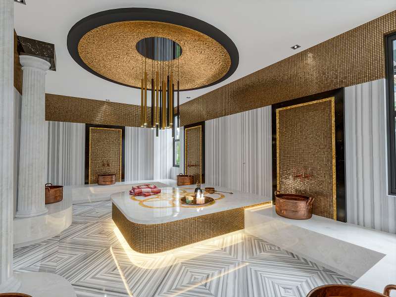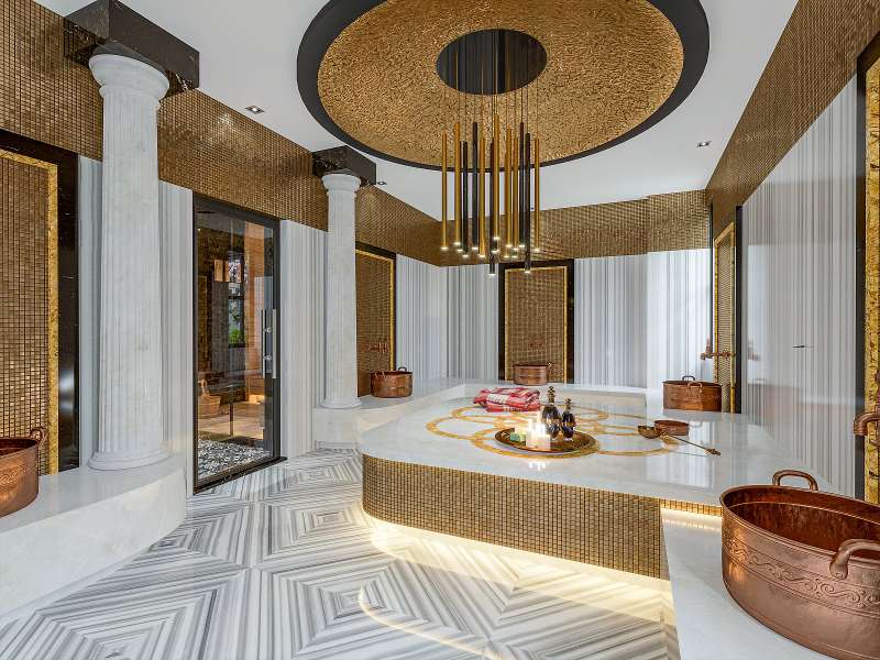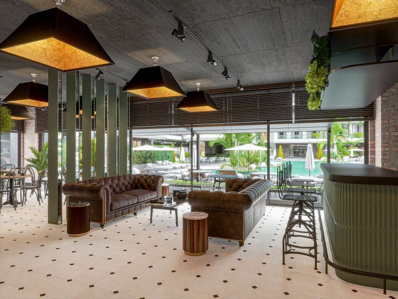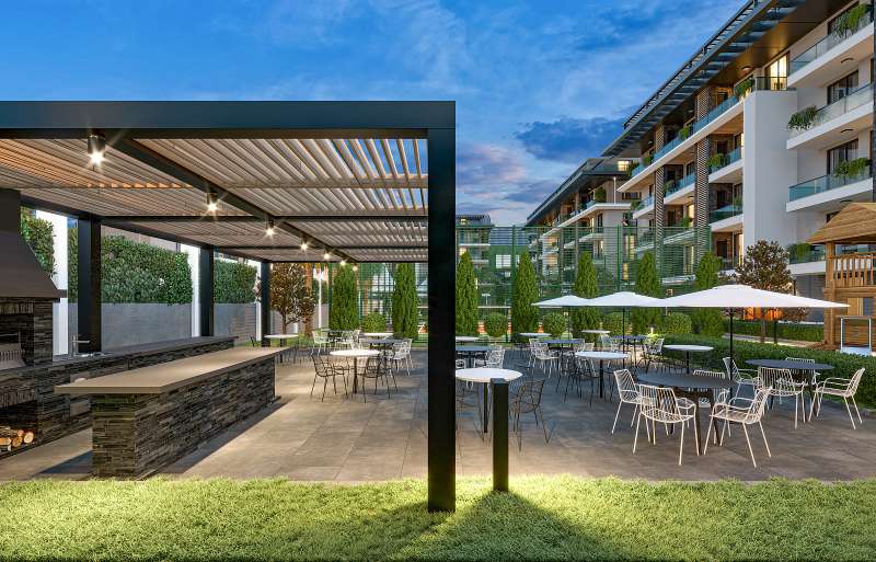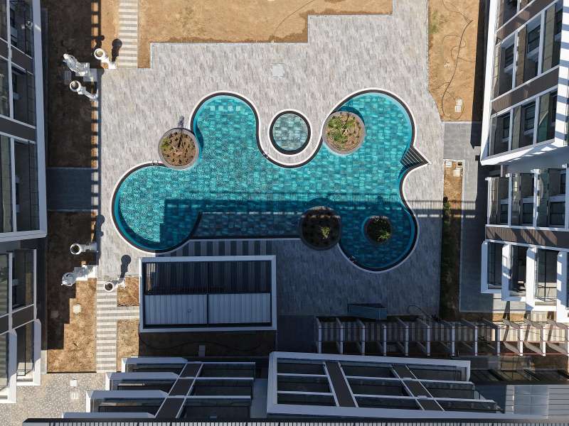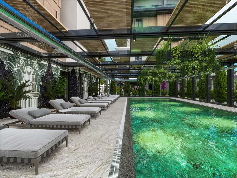 Located on an 8,600 m² land area, the project where the flats are situated includes 4 blocks and 136 flats. The project features a pool with a waterslide, a children's pool, an indoor heated swimming pool, a playground, a tennis court, a gym, a Turkish bath, a sauna, a steam room, massage rooms, a recreation room, a generator, and 24/7 security.
