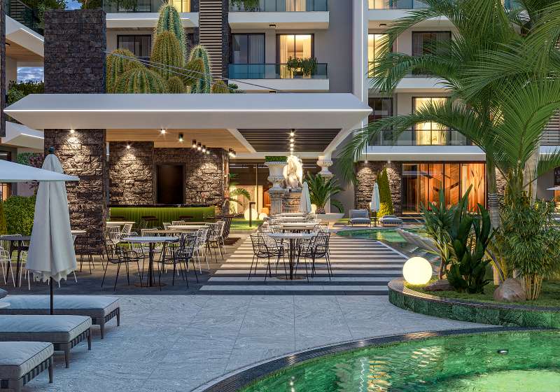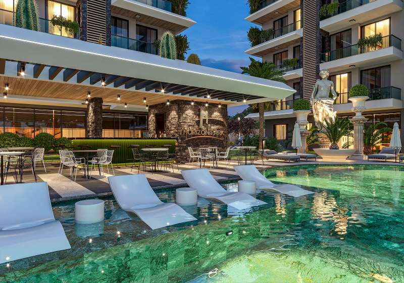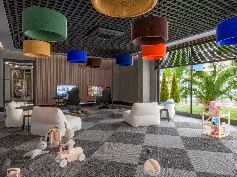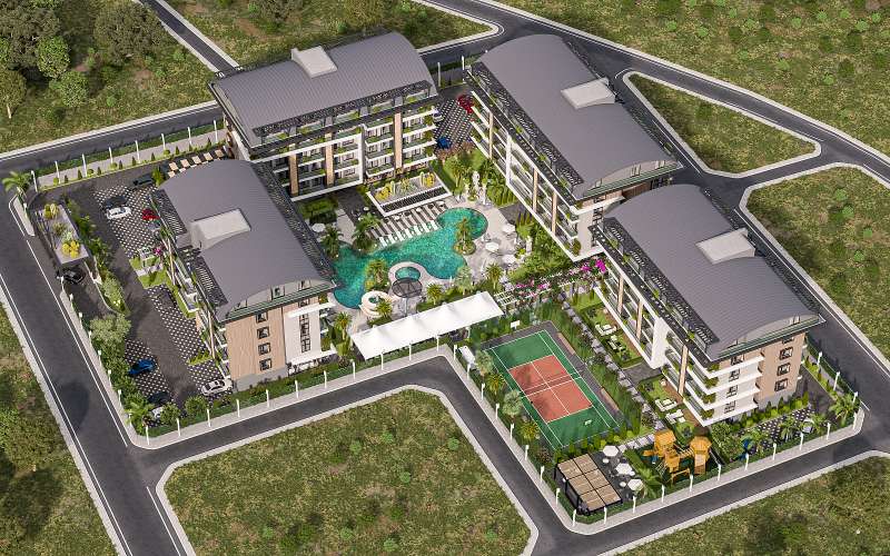 The flats for sale in Alanya, Antalya are situated 1.6 km from the hospital, 2 km from the shopping center, 2.7 km from the coast, 4.6 km from center, and 35 km from Gazipasa Airport.