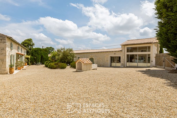 It is surrounded by a bar area and rest areas conducive to relaxation near the petanque court. The garden, tastefully planted with trees, also includes a vegetable garden, Mediterranean species and a large parking lot that can accommodate several vehicles and allows independent access to the different occupants of the living quarters.