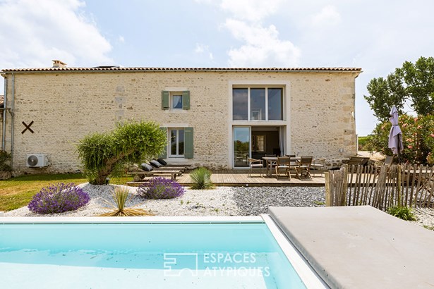 Three bedrooms complete this main living space, including a single-story suite with a large dressing room and a private bathroom. In addition, there are two other independent entities: a premium gite with four bedrooms, refined decoration and unusual amenities, and a third part converted into a convivial space with a living room, kitchen and an additional bedroom. A large stone wine storehouse offers additional space that remains to be developed according to the projects: reception room, artist's studio, storage space or garage. Outside, the swimming pool blends perfectly into a carefully maintained landscaped environment.