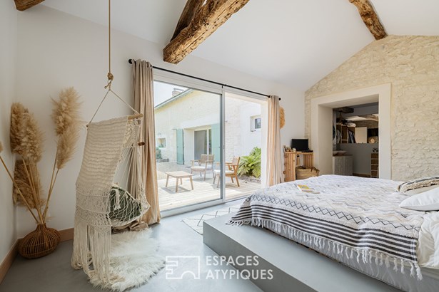 The main house, the true heart of the estate, seduces with its warm atmosphere and its brightness. The cathedral living room, enhanced by its raw wooden beams, stone walls, and travertine floor, unfolds into a living room where authenticity and contemporary comfort elegantly combine.