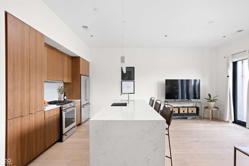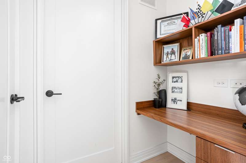 Experience luxurious, modern living in this beautifully designed 1 bed, 1bath condo located in highly sought-after Chatham Park. This stunning home features wide-plank oak flooring, custom walnut cabinetry, quartz countertops, and elegant marbled tile throughout. Enjoy the convenience of a built-in home office or soak up the sun while working from the oversized private patio. A flexible entryway space offers endless possibilities- perfect for a Murphy bed, bar area, or additional seating. Better than new, this condo comes equipped with a washer and dryer, plus custom motorized blinds for added comfort and style. A dedicated parking space and private storage unit are also included. Take advantage of top-notch community amenities including a library, fitness center, meeting room with kitchen, outdoor fireplaces, and grilling stations. All just steps from the vibrant restaurants and shops along Mass Ave and the dynamic Bottleworks District.
