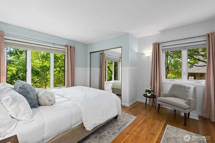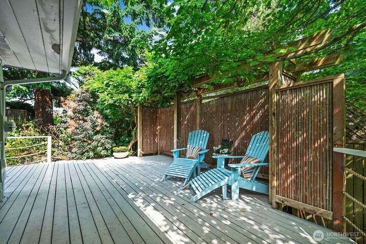 Tucked down a private lane, this 1930's Richmond Beach home offers a spacious LR w/hardwoods, oversized brick fireplace w/adjacent dining area that leads to the entertainment-sized deck. Sunny kitchen with oak cabinetry, granite counters, skylight and updated appliances. 3 bedrooms on the main floor along with 3/4 bath. Lower level could be a separate apartment with 800 sq. ft of functional space: living room, bedroom, cute kitchen and outside access (previously rented). Laundry machines on each floor of the home. Features: comp. roof, vinyl windows and detached artist's studio. There is a private, terraced yard with an abundance of mature plantings & landscape. Slate pavers lead you up to the home from the off-street parking.