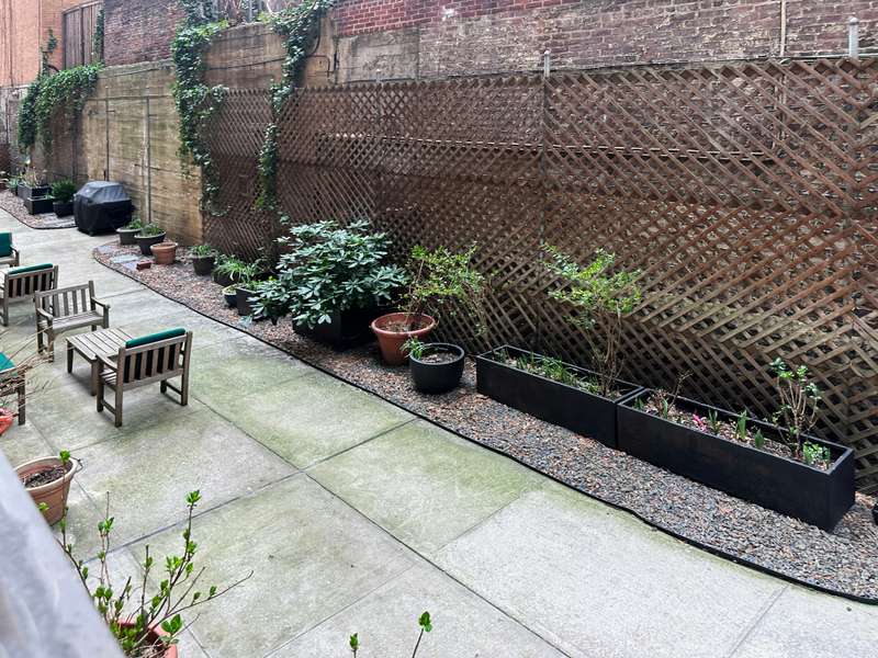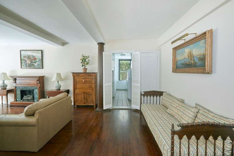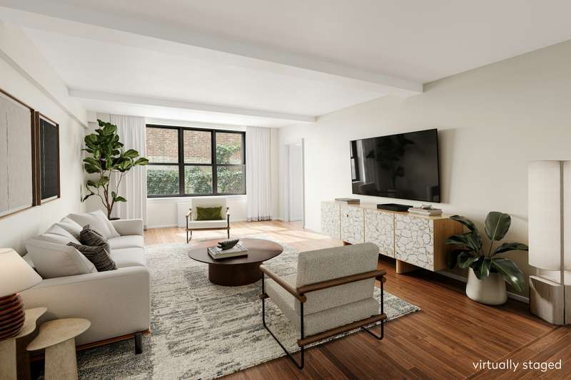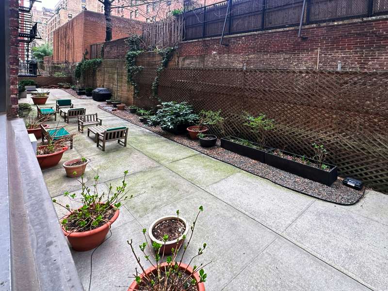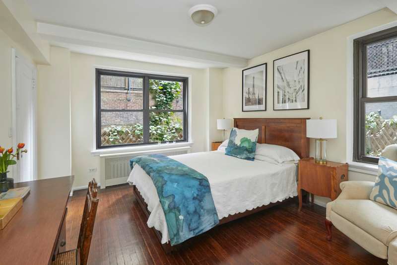 Townhouse living in a pre-war building. Welcome to apartment 1E, a lovely, quiet high first floor apartment overlooking a beautifully planted garden. This apartment has the unique convenience of being on the lobby level and one flight above the street. Windows are at second floor level.