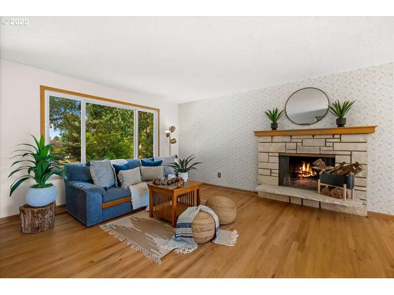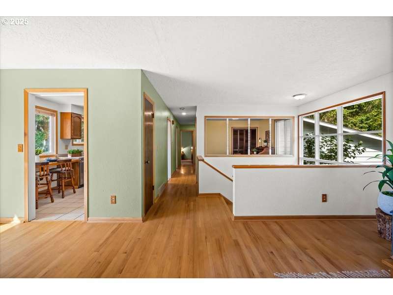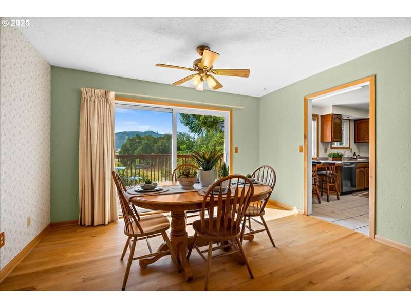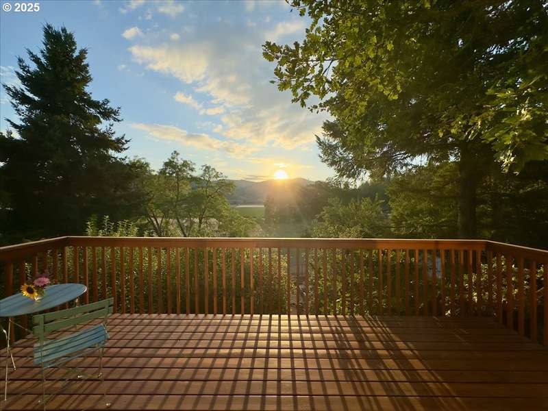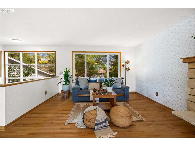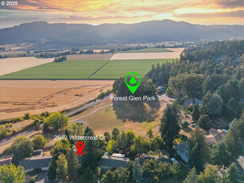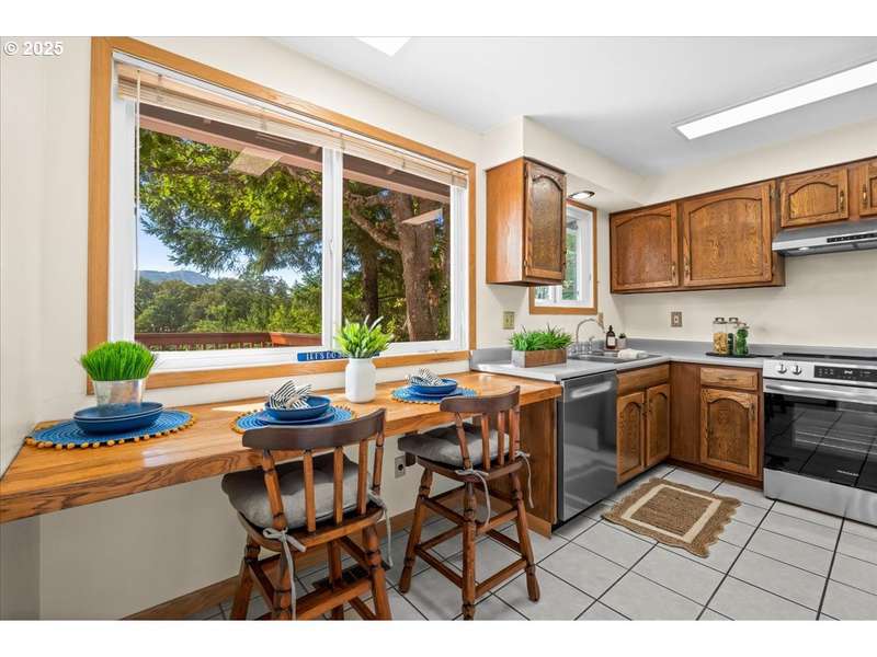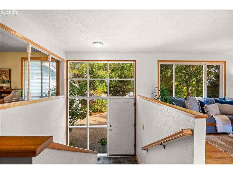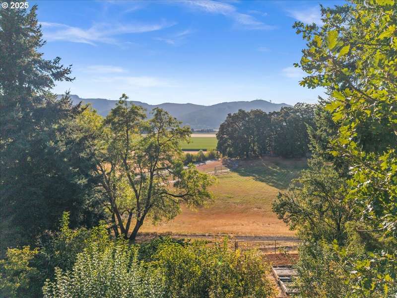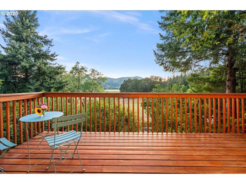 Classic Mid-Century Vibes in this Modern home with sweeping Coastal Range views! Step inside and you’ll find the main living spaces upstairs, designed to capture natural light and frame unobstructed views from every window. The living room, dining area, and kitchen flow seamlessly together, opening onto a deck that offers dramatic seasonal views — glorious sunsets, clouds and mist drifting over the hills, and blankets of snow against a backdrop of forest and farmland. Perfect for everyday living or hosting a full dinner party. Upstairs, the den is your blank canvas: create an office, a cozy reading nook, or a craft room — the choice is yours. Downstairs, the bonus room offers flexible living space with a brick fireplace, perfect for a cozy lounge or the ultimate game-day hangout. Two additional bedrooms and a fully remodeled bathroom make it ideal for family, guests, or a private retreat. The laundry/utility room adds function with generous storage, direct backyard access, and a separate workshop space. Out back, your private 1/3-acre yard is lush, peaceful, and alive with wildlife — a natural landscape that blends the region’s beauty with today’s lifestyle. The location feels like you are not in town, yet the well-kept neighborhood is welcoming, with a park with walking paths that sits directly behind the house. This home blends modern updates with original character to create a truly one-of-a-kind retreat.