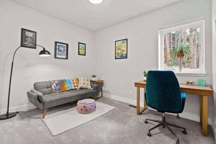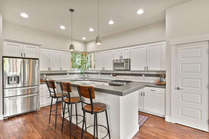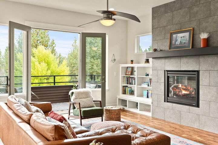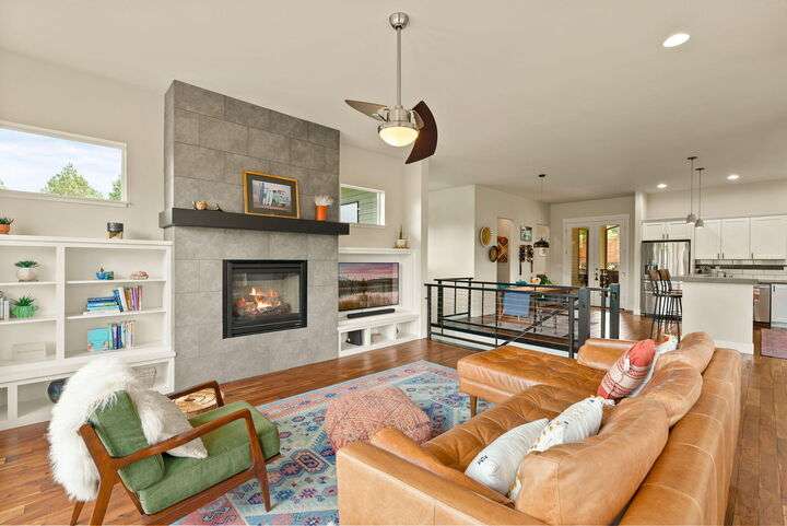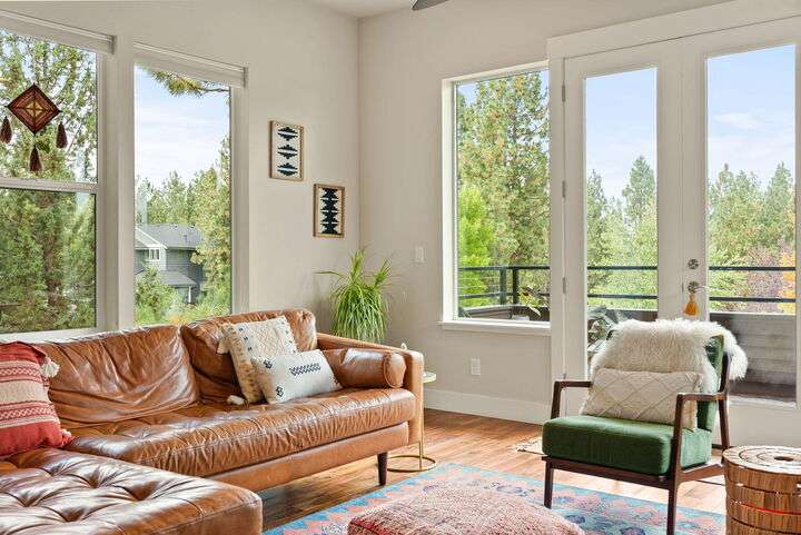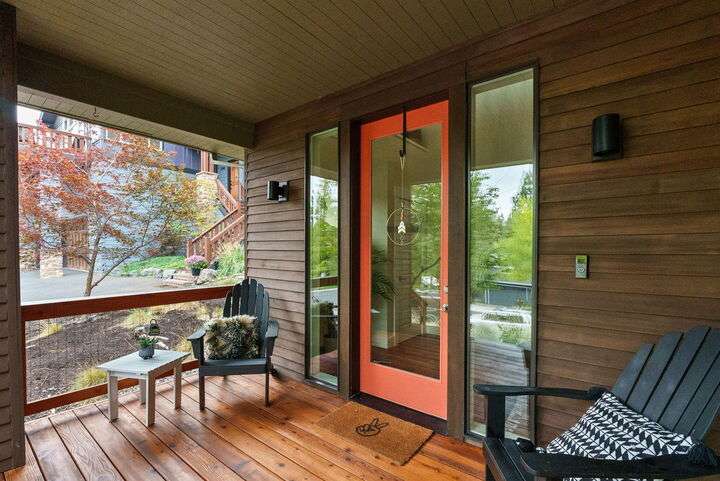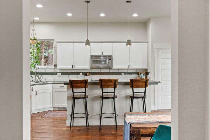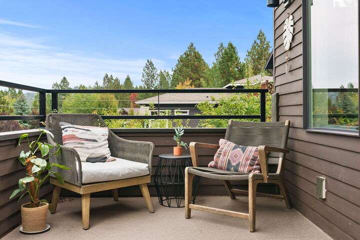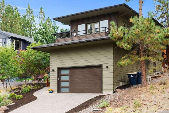 Welcome to The Treetop Oasis—a contemporary custom home in one of NW Bend's most coveted neighborhoods. This reverse-living home on a large lot captures sweeping treetop views from its elevated deck, the perfect backdrop for sipping your morning coffee. Inside, acacia hardwoods and a floor-to-ceiling fireplace with built-ins create a cozy gathering space, while updated fixtures + hardware pair w/ custom cellular shades for effortless style + privacy. The flat backyard boasts a greenhouse, firepit, and low-maintenance turf—ideal for gardening, entertaining + cornhole tournaments. A heated driveway eliminates winter shoveling and lofted garage storage keeps your gear organized. All tucked in a quiet, tight-knit neighborhood (turnover is so rare!) with an easy stroll to Quail Park and 6 minute drive to NWX's restaurants + shops. From afternoons at the pickleball court to accidental dinner parties on the patio, The Treetop Oasis is the place you'll always be happy to come home to.