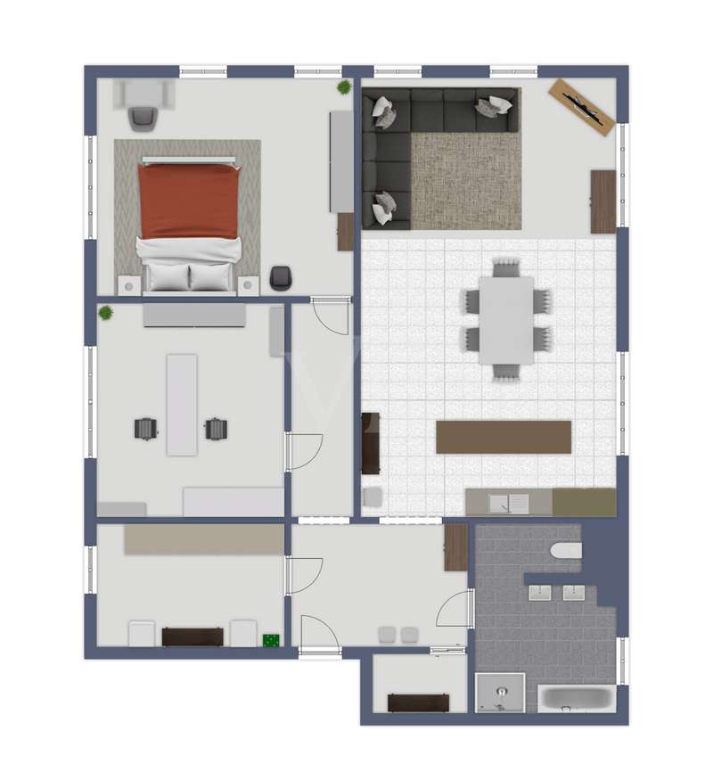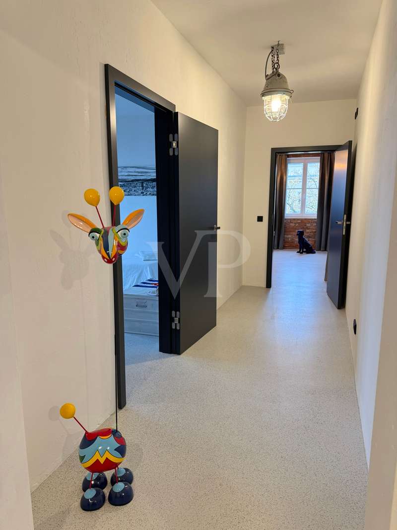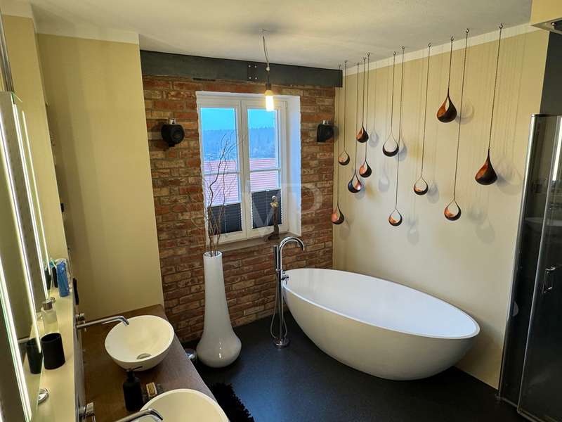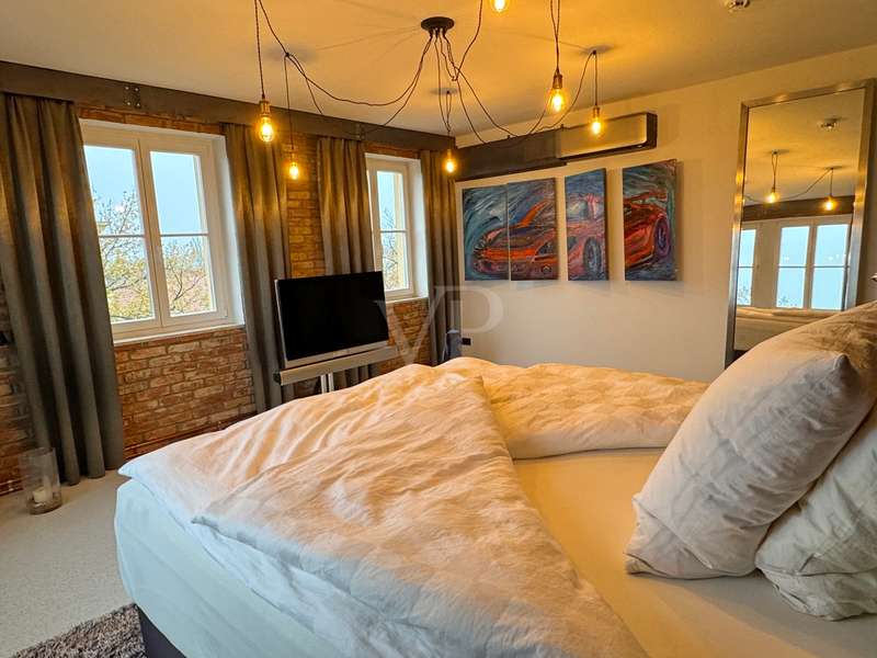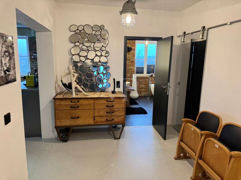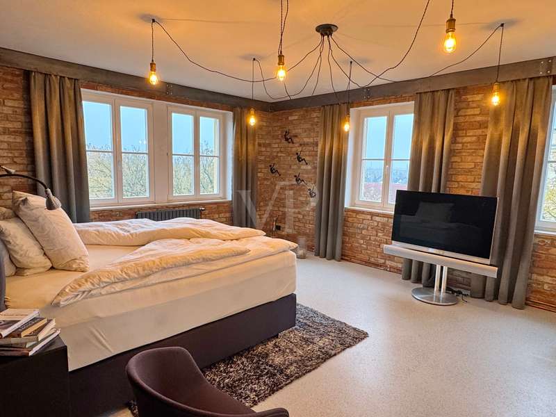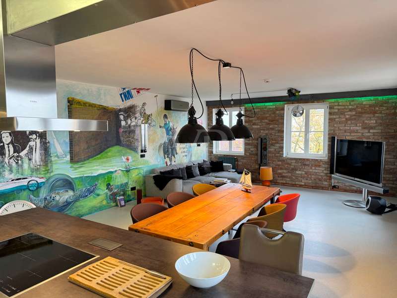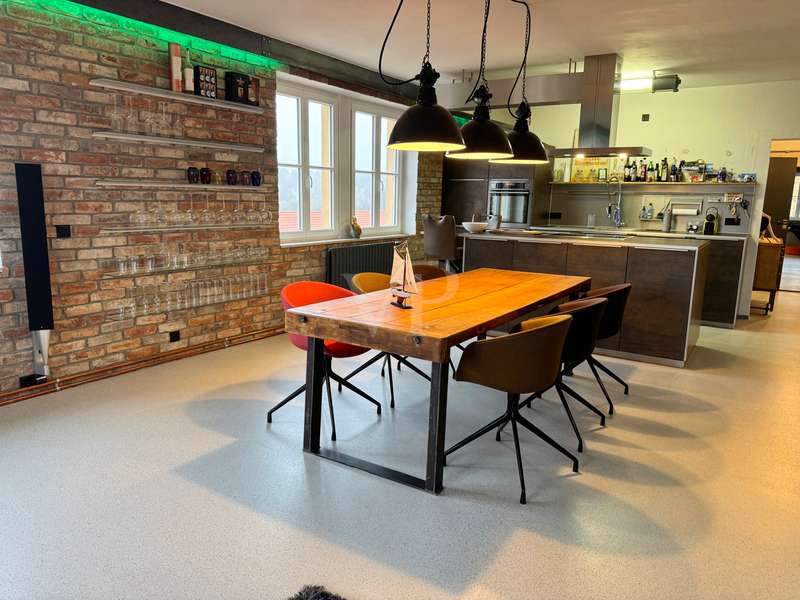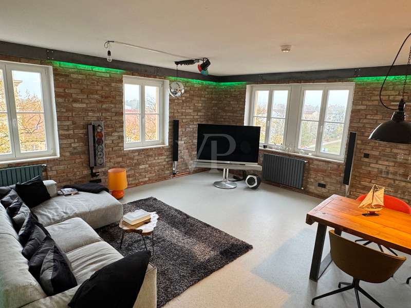 An exclusive, fully furnished and ready-to-move-in condominium awaits you in a central location in Senftenberg, which impresses with its modern furnishings and characteristic industrial style. The residential complex was built in 1950. The apartment was extensively renovated and modernized in 2016. The bathroom and kitchen were completely renovated, the floor plan was optimized and new windows and interior doors were installed. The walls were also clad with high-quality clinker brick. Further improvements to the apartment include the installation of electric interior darkening in the living room, kitchen and bedroom. The living area of approx. 137 m² offers enough space for comfortable living. A total of four rooms are available. The spacious living area integrates a dining area and an open kitchen, which is equipped with a generous, high-quality fitted kitchen. The large double casement windows throughout the living area ensure a bright living climate and the designer radiators and designer interior doors with internal hinges underline the upscale furnishings. Air conditioning units in the living and sleeping areas ensure pleasant temperatures on hot days. In the private area of the apartment, there is a large bedroom and a flexibly configurable study. Another room currently serves as a utility room, but can also be used as a children's room. The closed wardrobe offers additional storage space. The high-quality bathroom is equipped with underfloor heating and boasts a free-standing bathtub, a separate shower area and a separate WC area. The apartment is located on the 4th floor of an apartment building with a total of 8 apartments and a commercial unit. A separate cellar room and a separate attic room are available for additional storage space. A private parking space rounds off the offer. The property is heated by a central house heating system, which ensures a pleasant living climate in the cold months. The apartment is ideal for families, couples or singles who value individuality paired with high-quality furnishings. Thanks to its central location, all daily amenities and public transport are within easy reach. Arrange a viewing appointment and see the benefits of this modern apartment for yourself.