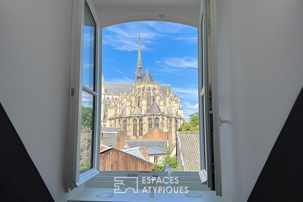 The sleeping area includes a comfortable bedroom and a separate office opening onto a breathtaking view of Notre-Dame Cathedral, a true living tableau for everyday life. Just a stone's throw from the Saint-Leu district, the city center, the train station, and the Chemin du Halage, the address benefits from a privileged location, ideal for city life, all within walking distance. The recent window frames guarantee thermal and acoustic comfort. Cellar in the basement. Parking space to purchase or rent at an additional cost.