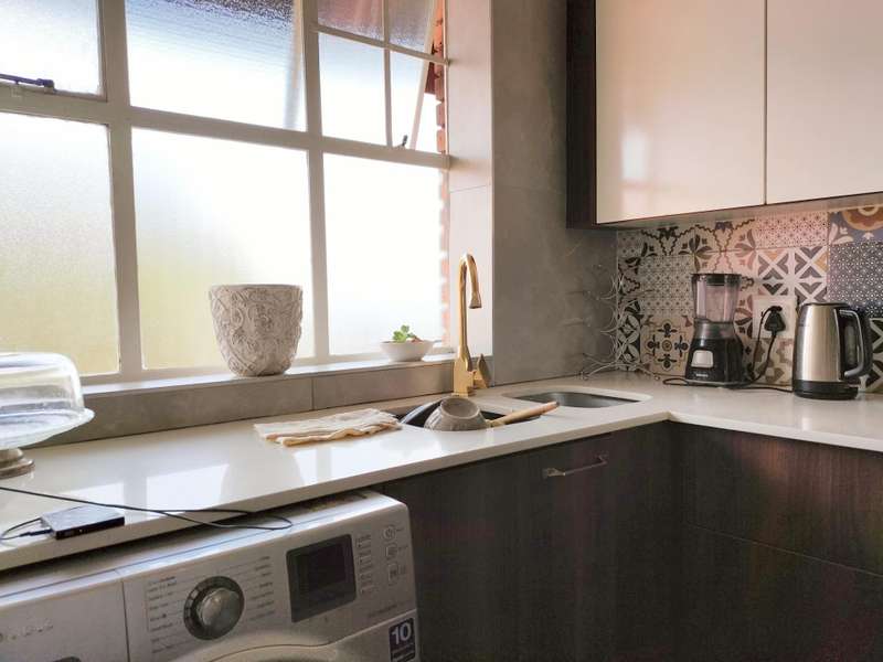 * Semi open plan kitchen with a glass-top stove and under-counter oven, and space for your washing machine