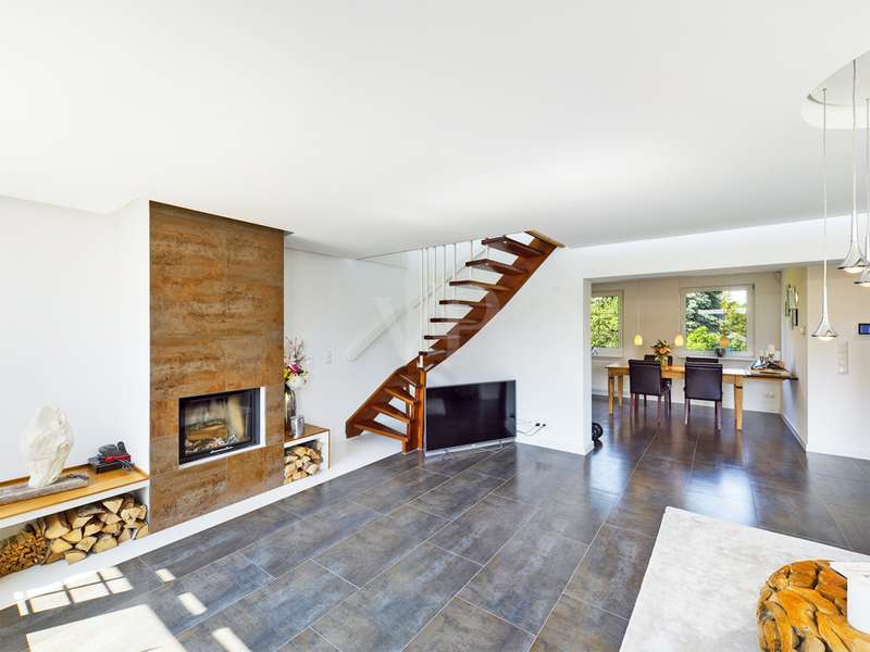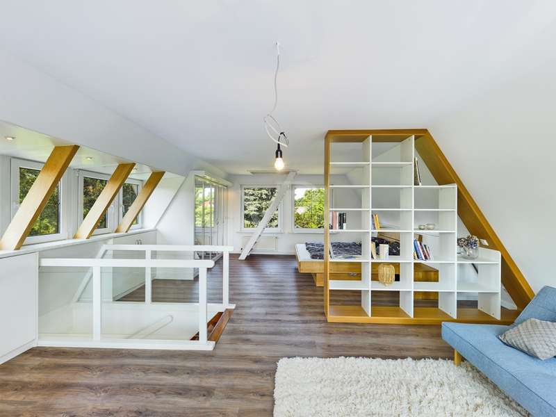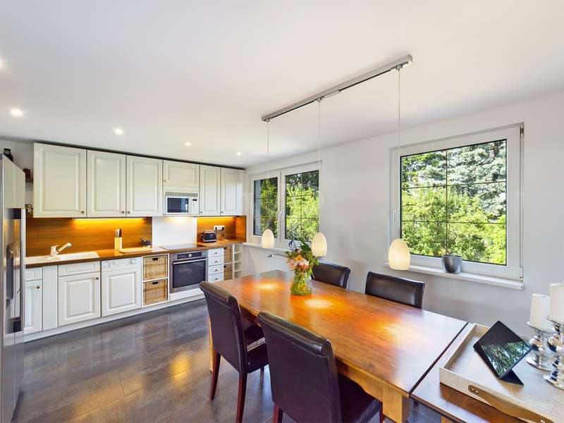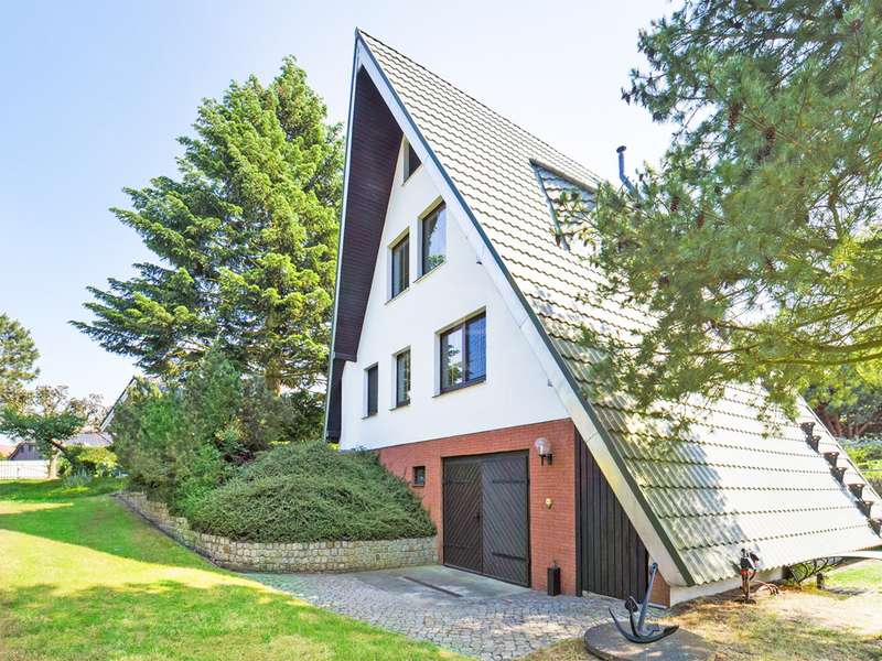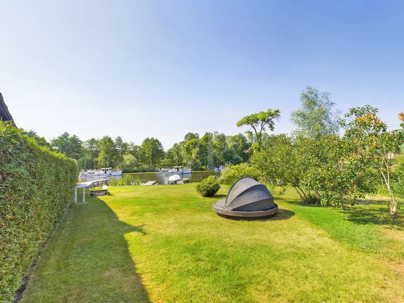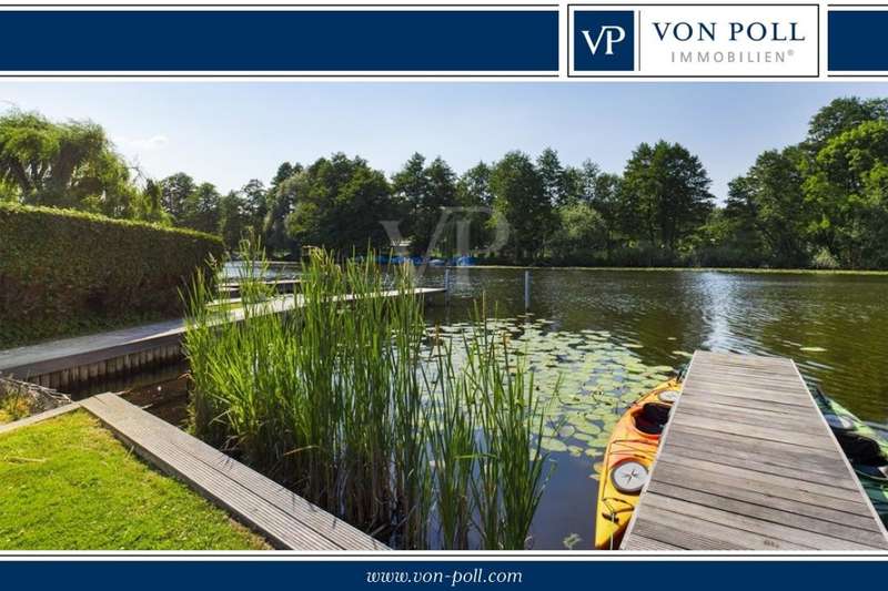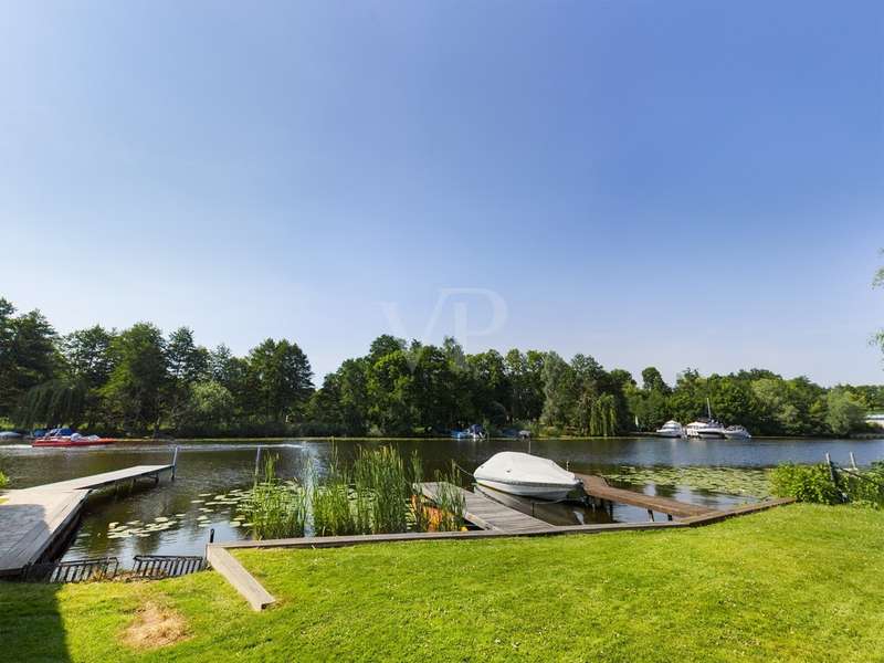 For sale is an idyllic lake property at the Krossinsee, just outside Berlin in the green Wernsdorf, a district of Königs Wusterhausen. The property has a size of approx. 1,174 m² in a grown single-family house as well as recreation settlement. The property is located in the dead end of a traffic-calmed 30 zone with resident traffic. The direct residential environment is characterized by well-kept single-family houses and a good milieu structure. The media of electricity, sewerage as well as a city water connection for drinking water are located on the property. The country house has a living area of about 100 m² and is in a very well-kept condition. 2 rooms, an attic studio, a bathroom and a furnished fitted kitchen with dining area are part of the equipment. On the first floor you enter via the hallway into the south-facing living room with adjacent, approx. 20 m² sun terrace and into the tiled bathroom. From the living room, an open wooden staircase leads to the bright, gallery-like upper floor. Here is a spacious sleeping /, living / and working area with access to the south-facing balcony available. The developed attic studio is usable without further as work-/, guest-/ or bedroom. The property has a partial basement and two rooms. The former garage (room 1) in the basement is currently used as storage space. The utility room (room 2) is also located in the partial basement and also has a washing machine connection. Highlight of the large and well-maintained property is the own shore zone with direct water access and two own jetties. Here, water sports and swimming enthusiasts will find their balance. Breathtaking sunsets can be watched wonderfully from the terrace or the shore zone. Together with family or friends you can relax and let the day end and recover from the hustle and bustle of everyday life. Through the waterways of the open lakes, motorboat enthusiasts have the opportunity to reach the Baltic Sea and the Mediterranean Sea. IMPORTANT: A jetty is used with a right of way registered on the property by the neighbor !