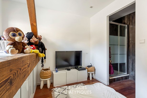 Upstairs, two sleeping areas stand out: a cozy first bedroom of approximately 9sqm with its adjoining shower room, a spacious master suite, offering bathroom, shower, toilet and dressing room, for refined daily comfort.