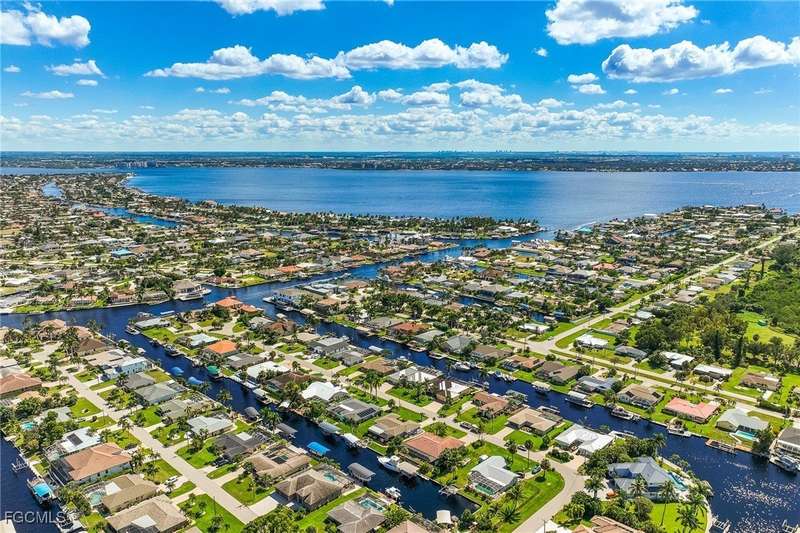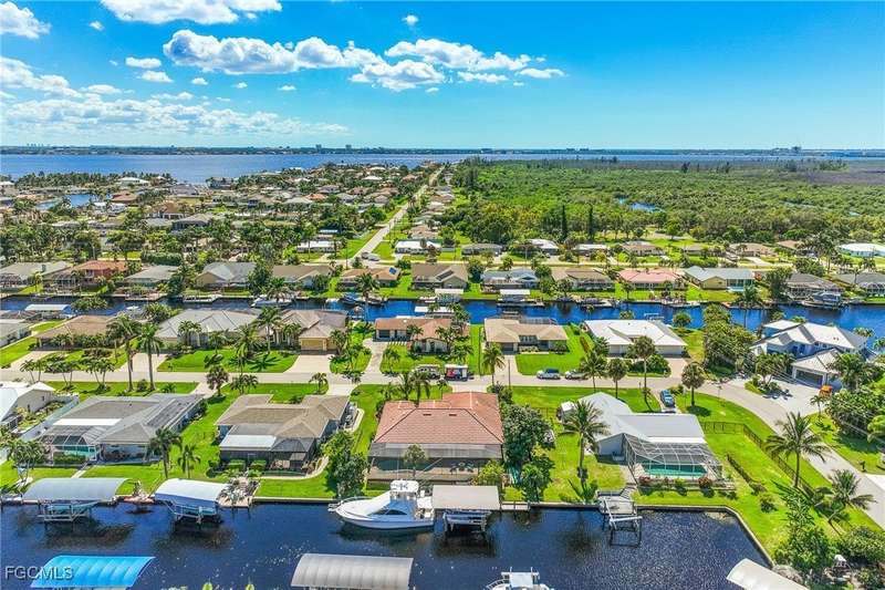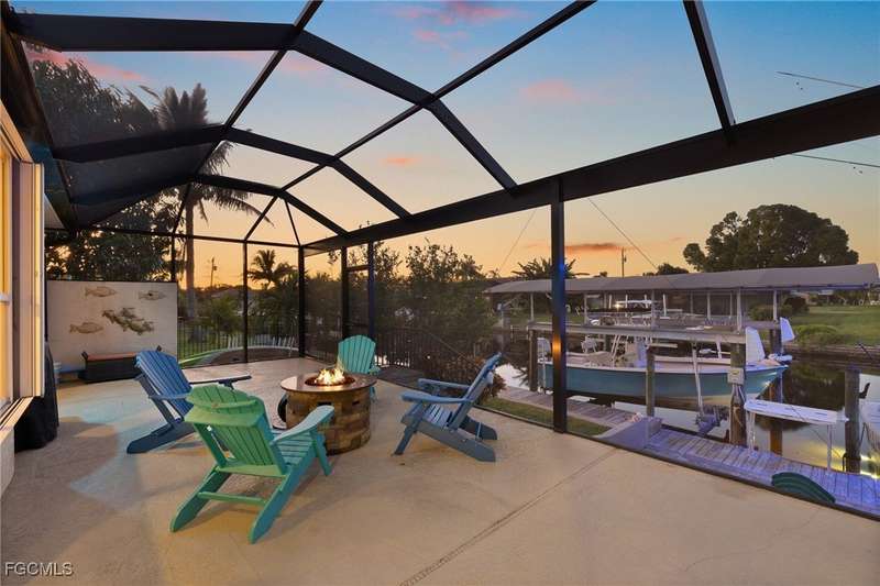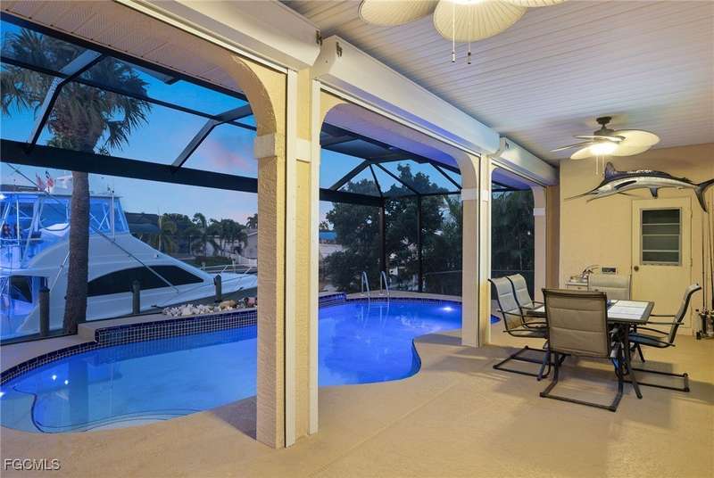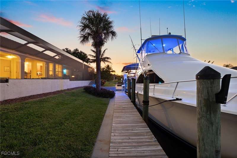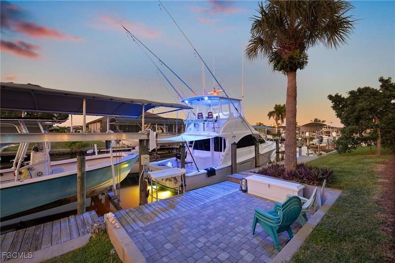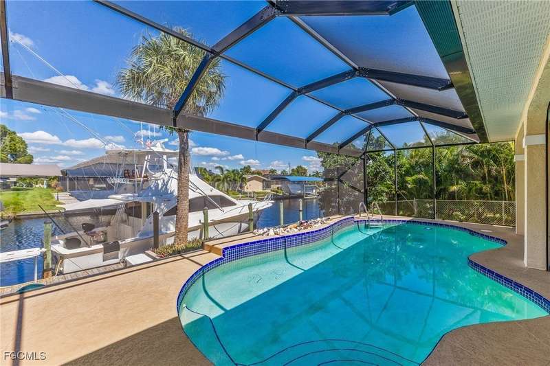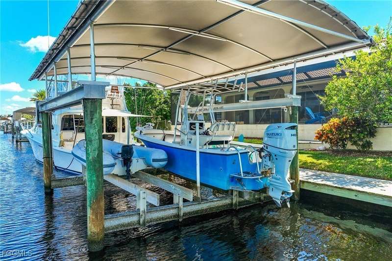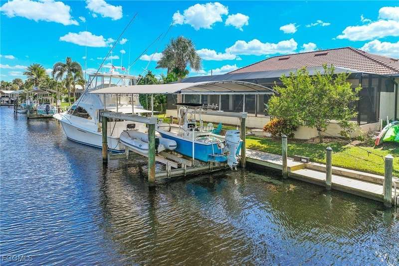 Welcome to the boater's dream; Homes with this level of water access and dockage don't come around often! This premium, sailboat-accessible Gulf Access home is built for serious boaters who demand more than just water views. Tucked away on a quiet cul-de-sac in one of Cape Coral's most sought-after neighborhoods, this ranch-style home offers unmatched big boat accommodations - including no bridges and direct river access in under 5 minutes. At the water's edge, you'll find an 87-foot Captain's Walk dock, complete with a Golden 28,000 lb. dual-motor lift 16' x 28' with canopy for your offshore vessel, plus tie-up space for a second boat or water toys. Whether you run a sportfish, cabin cruiser, or catamaran, this setup delivers the dockage flexibility and capacity rarely found in residential properties. Inside, the 3-bedroom, 2.5-bath layout centers around an open-concept design with soaring ceilings and pocketing sliders that dissolve the boundary between indoors and your outdoor oasis. The chef-friendly kitchen features granite counters and is perfectly positioned for entertaining with pool and canal views. Step into the lanai and you'll immediately appreciate the newer panoramic screen enclosure, framing the heated pool and creating the ultimate entertaining or wind-down space after a day on the water. The master suite is its own retreat, featuring a spacious bath with dual vanities, walk-in shower, and soaking tub - the ideal place to recharge after a long run offshore. Additional highlights: - Huge, oversized air-conditioned 2-car garage with ample storage - Concrete dock with water & power - Never flooded/Very low flood insurance costs - Located just minutes from Tarpon Point & the Westin. Whether you're cruising out to the Gulf, relaxing by the pool, or entertaining on the lanai, this home is designed to elevate your boating lifestyle.