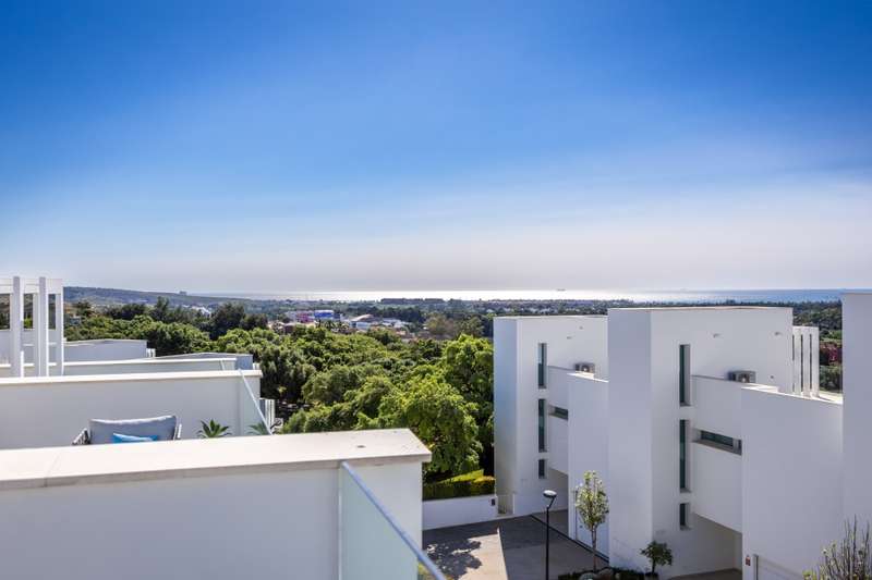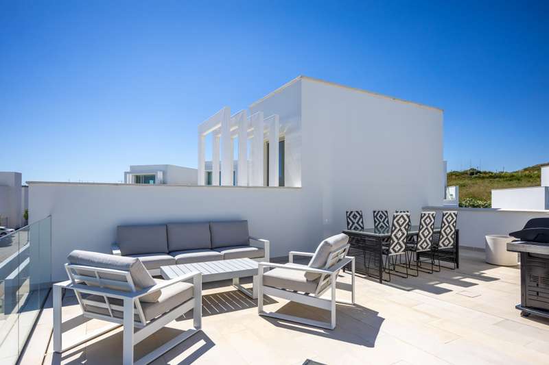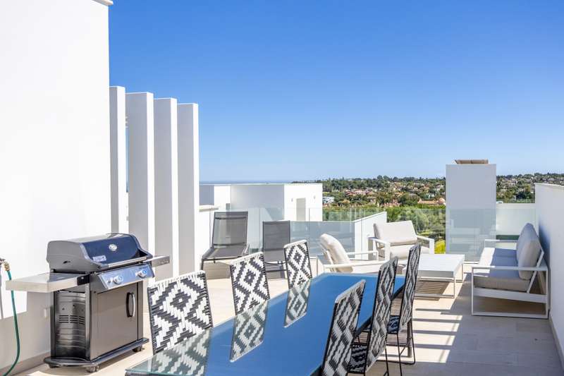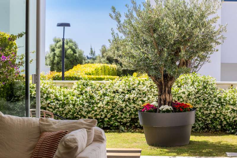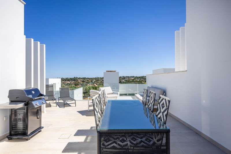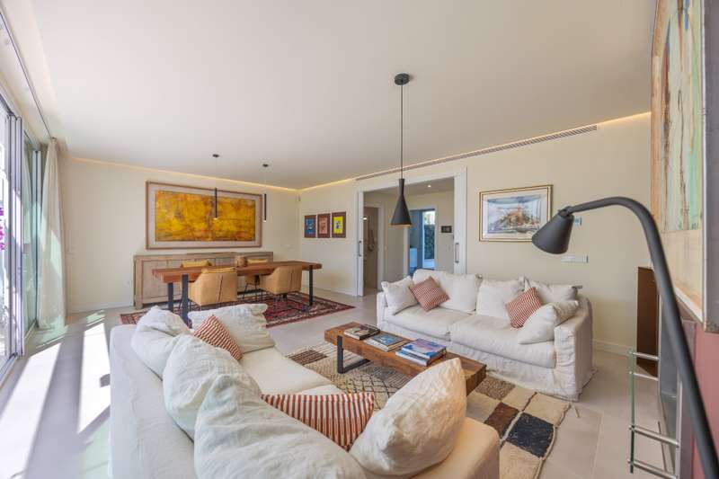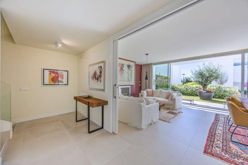 In the heart of La Reserva de Sotogrande, one of the most sought-after areas on the Costa del Sol, you will find this bright and elegant townhouse located in the prestigious private development, La Finca. With a built area of 314.6 m², this property combines contemporary aesthetics with maximum comfort, offering an exclusive lifestyle just minutes from the golf course and the iconic The Beach, the beach club of La Reserva. The design of the home unfolds in spacious and luminous areas, highlighted by large floor-to-ceiling windows that flood every room with natural light thanks to its south-facing orientation. From the impressive 54.30 m² solarium, you can enjoy panoramic views of the sea, the communal pool, and the natural surroundings, inviting relaxation and the enjoyment of unforgettable sunrises and sunsets. The house also features a private garden and a front patio totaling 52.03 m², ideal for outdoor breakfasts or moments of unwinding. Spread over three floors plus a solarium, the property offers 3 bedrooms, 2 full bathrooms, and a guest toilet. The living-dining room, decorated with art pieces and noble materials, opens onto a cozy terrace that connects to the garden, while the kitchen, with clean lines and a minimalist style, is fully equipped and opens onto the front patio. Comfort is guaranteed year-round thanks to ducted air conditioning and underfloor heating. As for amenities, La Finca is a recently built development (year 2020) distinguished by the quality of its finishes and its comprehensive communal areas: communal pool, gym, paddle tennis court, and landscaped areas. It also offers its own concierge service. Additionally, there is 24-hour private security and surveillance cameras in La Reserva de Sotogrande, and it is located on the second line of the golf course, a privileged setting for golf enthusiasts. The property includes a private garage with capacity for 2 vehicles. Sotogrande is not just a destination, it is a way of life. Internationally recognized for its select atmosphere, impeccable urban planning, and commitment to nature and sports, this enclave on the Cadiz coast has established itself as one of the most exclusive places in Europe. Here, luxury is present in every corner, but always with a discreet, relaxed spirit deeply connected to the environment. From prestigious golf courses such as the renowned Real Club Valderrama or La Reserva Club, to its marinas, tennis and polo clubs, natural beaches, and sophisticated beach bars, Sotogrande offers a lifestyle that combines the tranquility of a privileged setting with a vibrant social and sporting calendar. All this, with first-class infrastructure, excellent security, and an international community that values privacy and quality above all else. Whether as a primary residence or a second home, this property is a unique opportunity to become part of an enclave where time stands still, light envelops everything, and every day can begin with sea views and end with a stroll in this exclusive community. Please do not hesitate to contact us for more information.