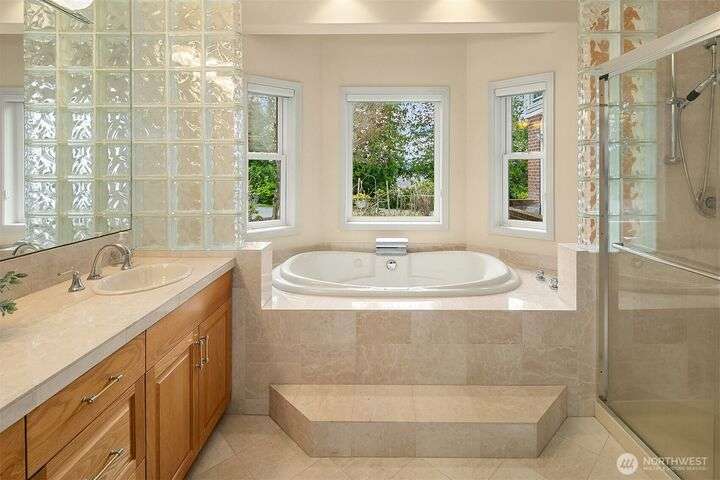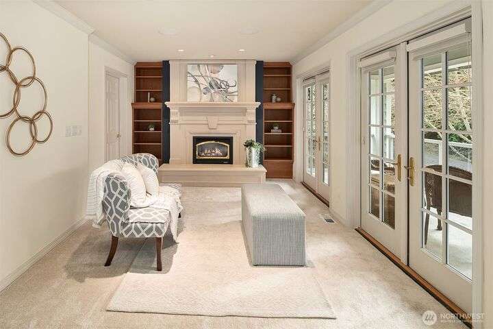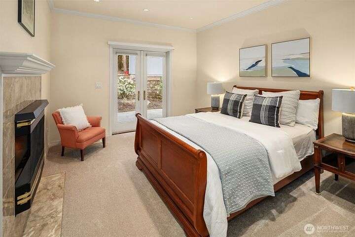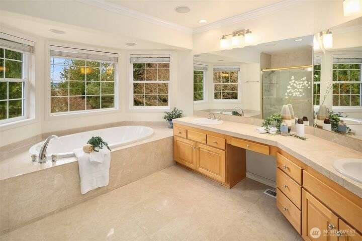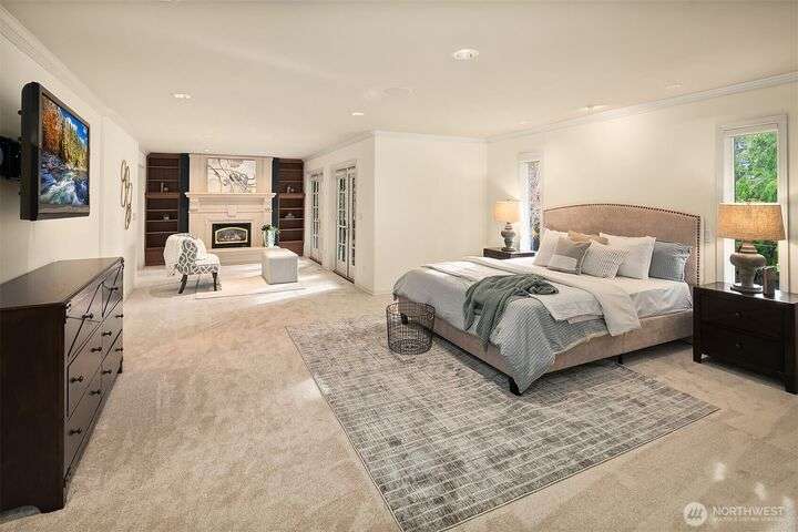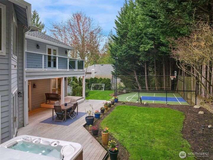 Home is NOT on PLATEAU. Only 5 mins from DT Red and 520.This expansive home includes a private ADU w/ full kitchen, living room w/gas FP, bedroom & spa-inspired bath. Perfect for guests, multi-generational living, or income potential. Enjoy shared beach access & possible boat moorage on Lake Sammamish. Formal living room boasts vaulted ceilings, a bay window, & a custom concrete gas FP. The chef’s kitchen features custom maple cabinets, slab granite, DCS gas cooktop, Subzero fridge & freezer & walk-in pantry. Large family room w/marble-trimmed gas FP. Primary suite w/sitting area, FP, private deck, & 5-piece bath. Bonus room w/entertainment center & wet bar, new carpet throughout & dual AC units.Backyard w/Trex deck, sports court,& hot tub