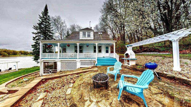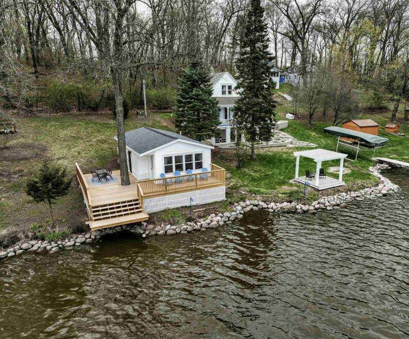 Imagine waking up to the tranquil sounds of Sinissippi Lake on an island! This exceptional property offers a truly unique opportunity to own *two* exquisitely renovated cottages and approximately 150' of pristine lake frontage. The main house is a haven of relaxation, featuring 3 bedrooms, an open living and dining area, wraparound deck for panoramic views, bathroom with a claw-foot tub for indulgent soaks, in-unit laundry, an outdoor shower, and a screened-in porch. The second cottage has been meticulously remodeled, offering a functional & stylish living space, gorgeous bathroom with tiled shower and double vanity, and a large deck that gazes out over the sparkling water. Both come fully furnished and boast new exteriors, private piers, and dedicated garage spaces.