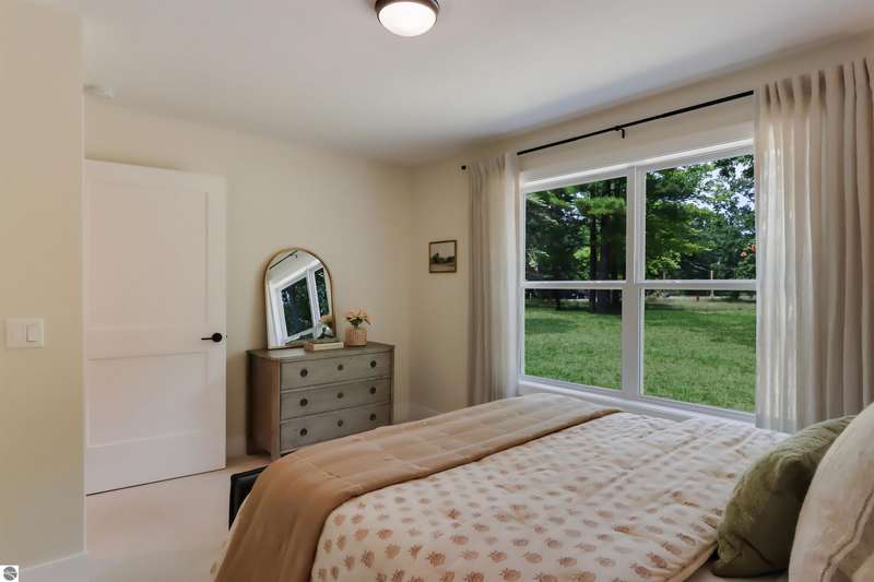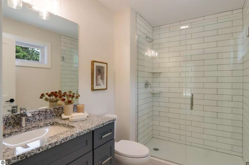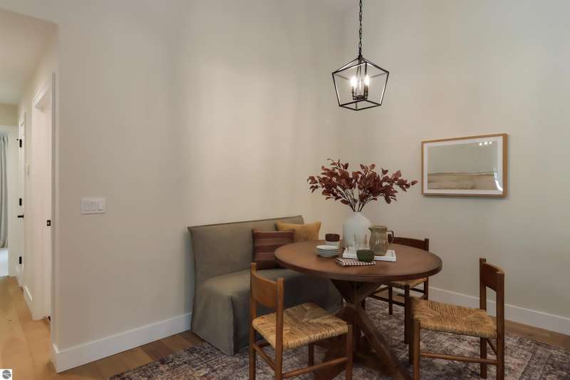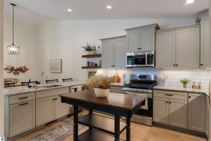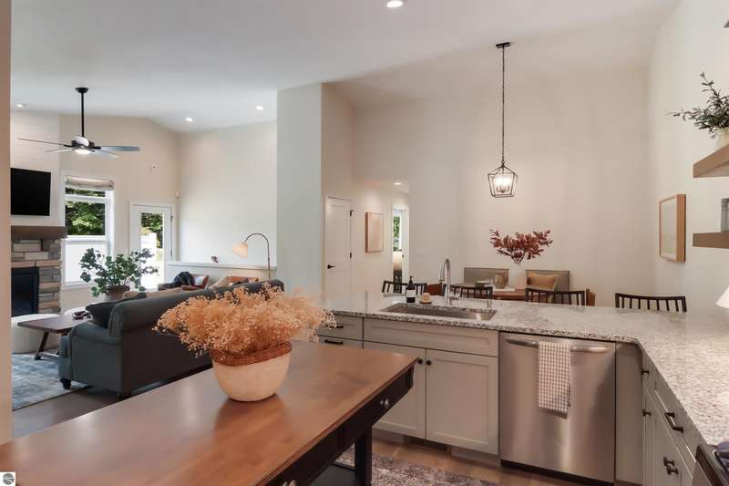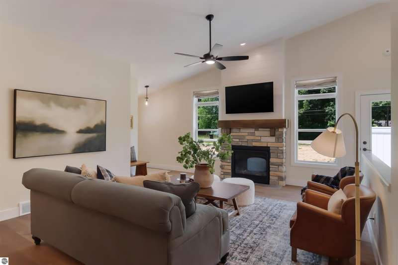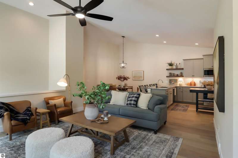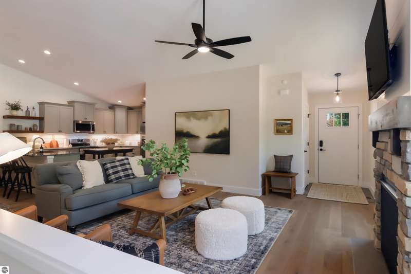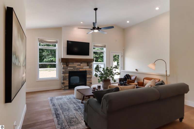 Brand new, energy-efficient duplex condo offering one-story, handicap-accessible living with 3' interior doors on the main level. Featuring premium vinyl lap siding with ledgestone accents, stained cedar columns, and beams for added curb appeal. The open-concept floor plan includes a peninsula kitchen with granite countertops, a spacious living room with a gas log fireplace and full shiplap accent wall, and beautiful 3/4 " White Oak hardwood flooring throughout the kitchen, dining, and living areas. The main-floor primary suite offers a walk-in closet, carpeted flooring, and a private bath with ceramic tiled shower and floors. Main-floor laundry off the garage includes tile flooring, a built-in shiplap bench, and convenient cubby storage. The lower-level features luxury vinyl plank flooring, a large family room, third bedroom, and full bath. Built for efficiency, these homes are modeled for a low HERS score of 48 (see documents), with estimated annual energy costs around $750. Additional highlights include a 2-car attached garage pre-wired for an EV charging station, underground irrigation, professional landscaping, and a 10x12 concrete patio. Located just minutes from shopping, restaurants, Cherry Capital Airport, the library, and the newly completed Boardman Lake Loop Trail with access to downtown Traverse City and the TART trail system. Photos are of a model unit; appliances are not included.