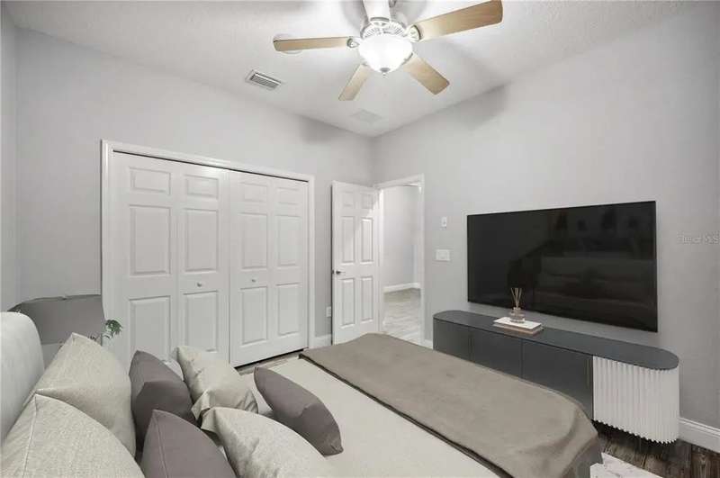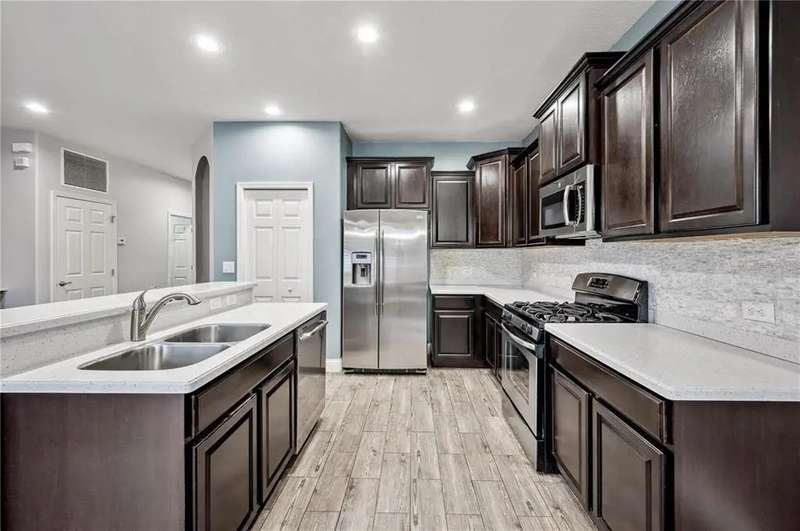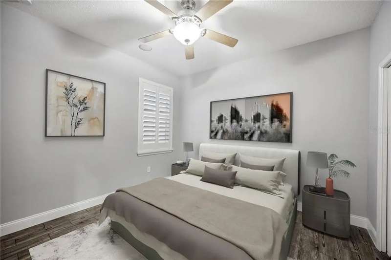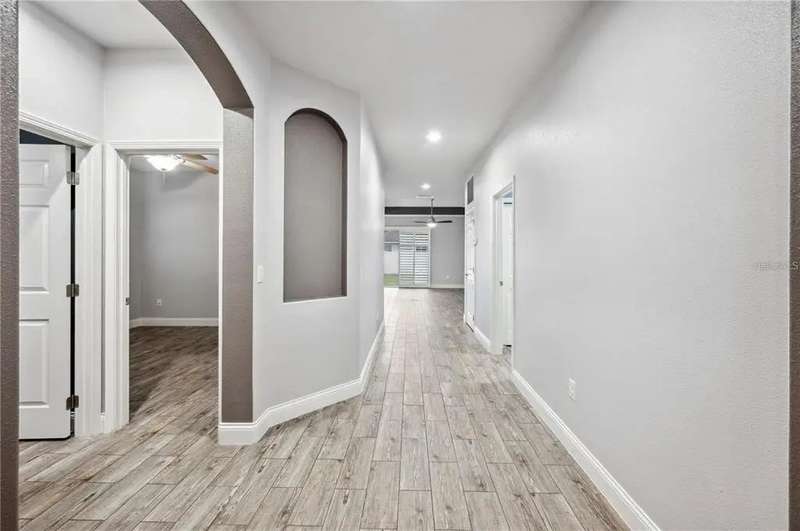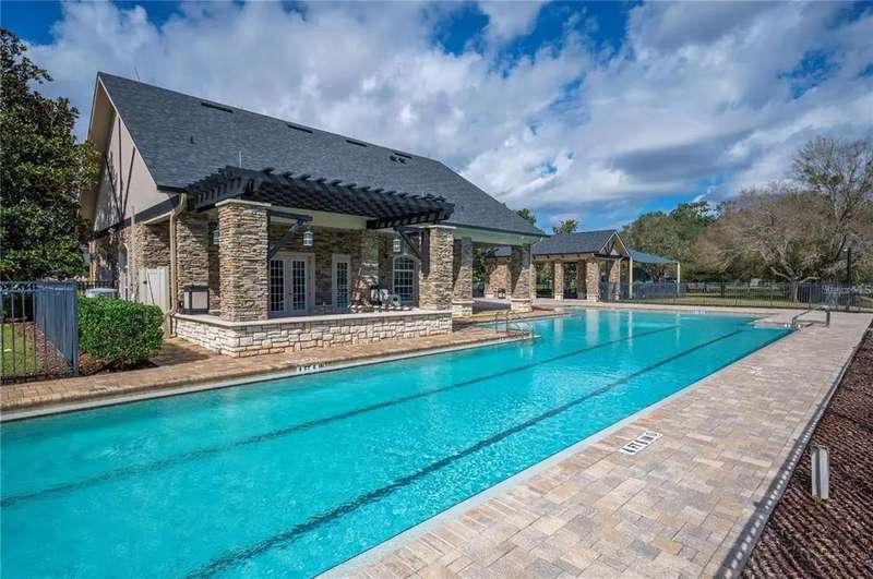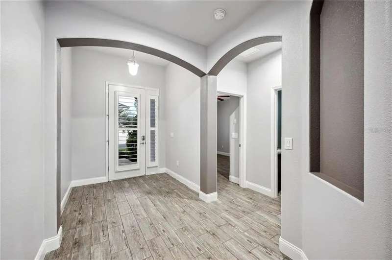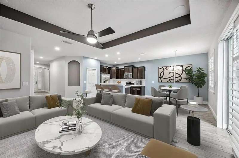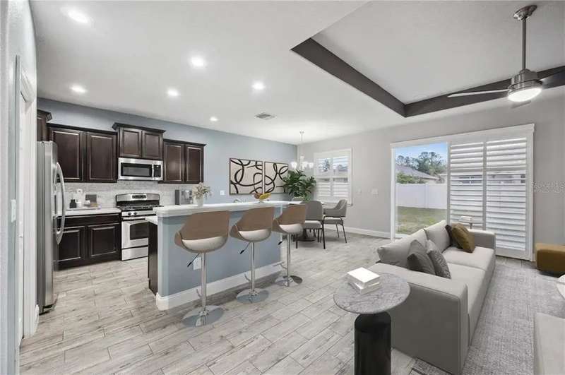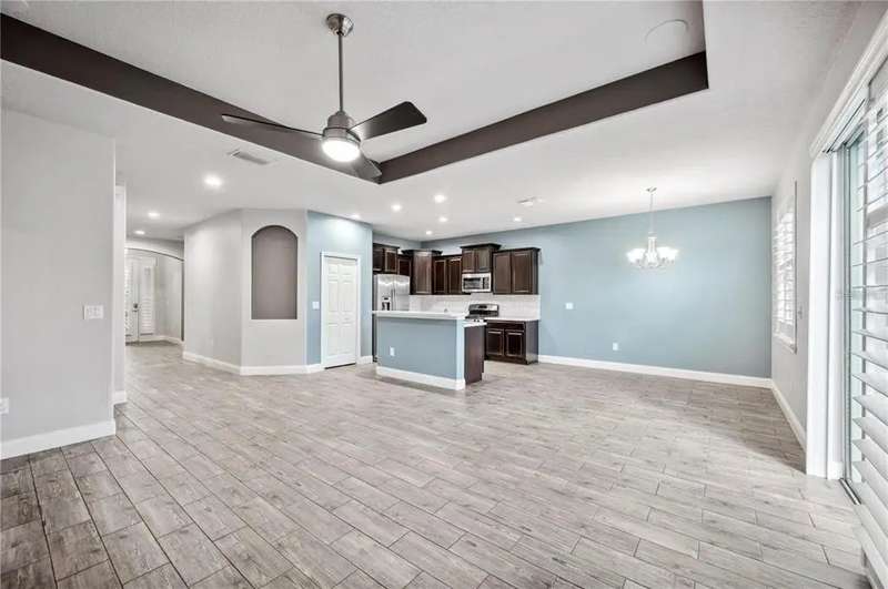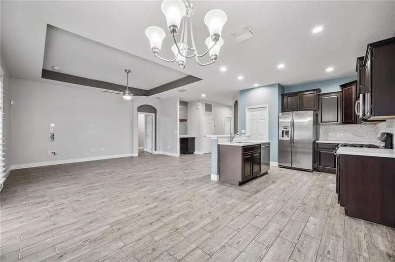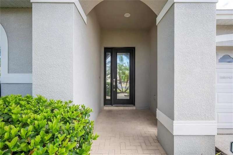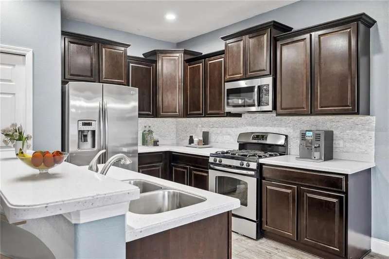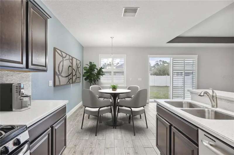 One or more photo(s) has been virtually staged. Welcome to this beautiful home in the highly sought-after, gated community of Stonegate. This meticulously maintained 3-bedroom, 2-bathroom residence offers a modern, open layout designed for both everyday comfort and elegant living. As you approach, you’ll be greeted by excellent curb appeal, highlighted by mature landscaping and an impressive 8-foot custom front door. Step inside to a spacious foyer with nearly 11-foot ceilings that open to a bright and airy great room. The open-concept design flows seamlessly into the stunning kitchen, featuring a large island with Corian countertops, rich Espresso wood cabinetry, stainless steel appliances, and a striking stone backsplash. The kitchen opens to the roomy great room, complete with large windows in the breakfast nook and sliding doors that lead to the backyard. Throughout the main living areas, you’ll find gorgeous wood-look ceramic tile plank flooring. The spacious primary suite includes two walk-in closets with custom built-ins, while the ensuite bathroom boasts granite countertops, dual vanities, Espresso cabinetry, and a large walk-in shower—creating a serene retreat at home. Step outside into your oversized fenced backyard, offering plenty of room for a future pool or other outdoor features. Perfectly situated just a short walk from playgrounds, the community pool, and a scenic waterfront fishing pier, this home combines comfort, style, and convenience. Stonegate is ideally located near A-Rated Schools, shopping, dining, and major access roads—making this the perfect place to call home.