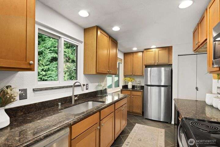 Prepare to be surprised! Beautifully refreshed 5 bedroom home, with hardwoods, fireplace, fresh paint, new carpet, updated kitchen & baths, 3 bedrooms on the main level, dedicated primary bath, lower level with huge family/entertainment room, 3/4 bath, 2 more rooms for bedrooms or offices Completely fenced & gated yard with plenty of room for gardens, pets & play. Privacy, hot tub, 2 car garage, Close to schools, excellent school district, quiet cul de sac location. The surprise is 1120 square feet of studio space! Originally used for glass blowing, imagine this huge open room for your own craft. So many possibilities, maybe a gym, gallery, workshop, indoor play area, pickle ball court ADU? (buyer to verify) Excellent value!
