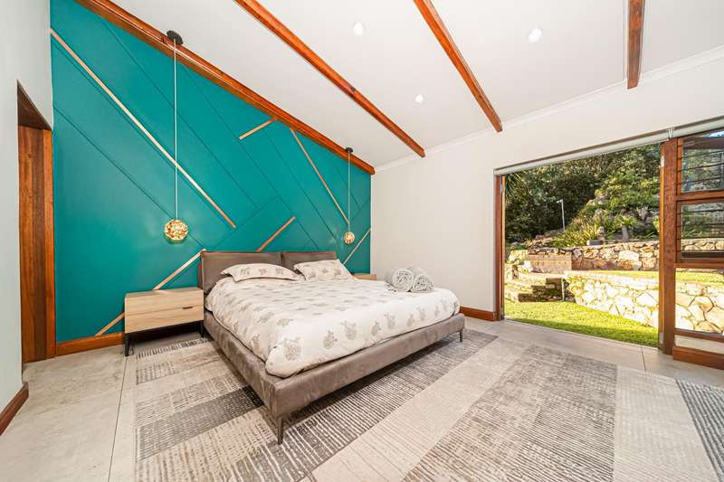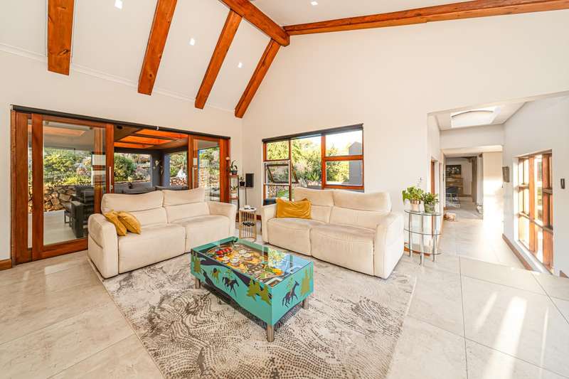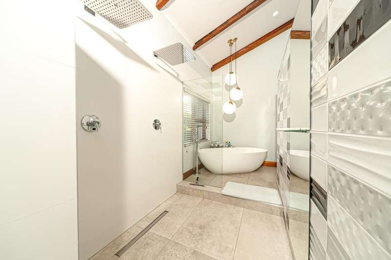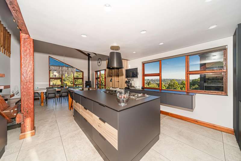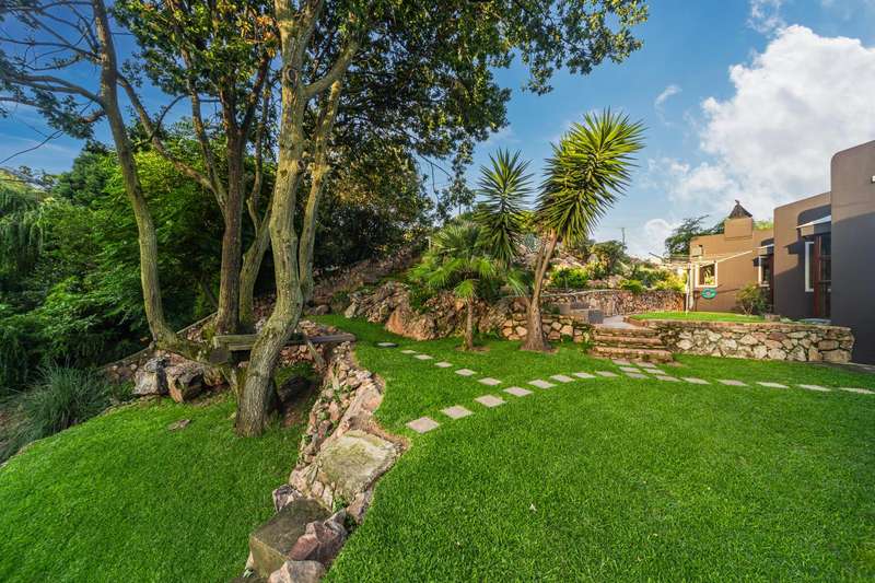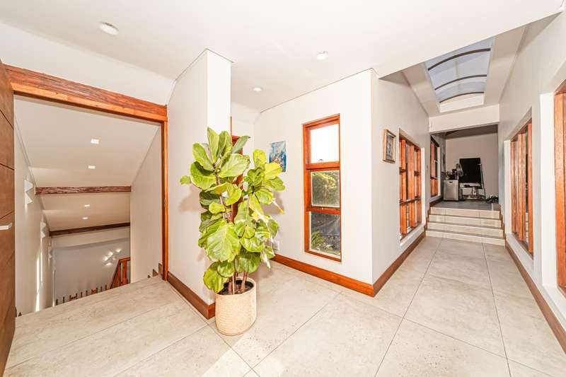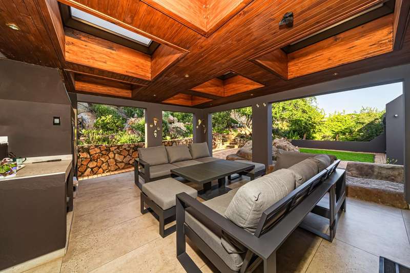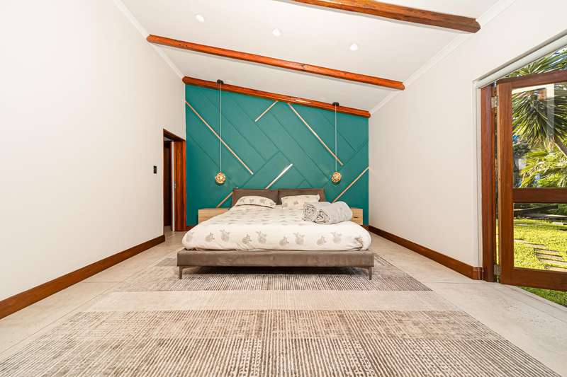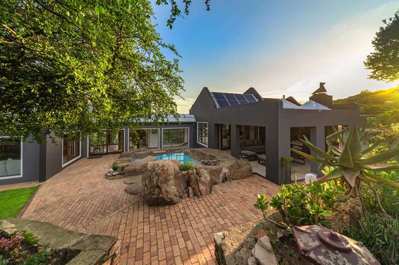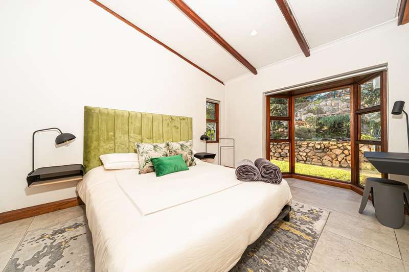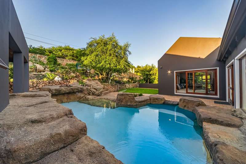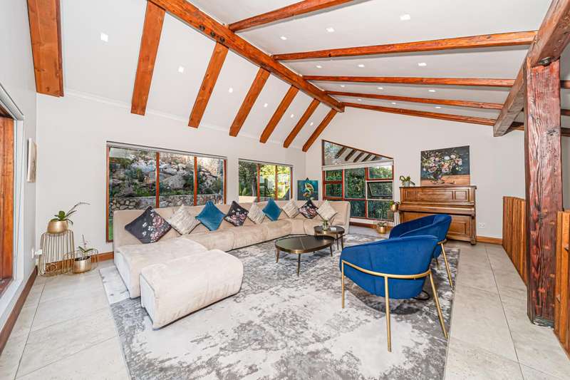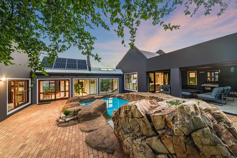 Designed for refined living and entertaining, the residence features a formal lounge, a TV room, and a pyjama lounge that seamlessly extends to a covered outdoor entertainment area. Here, you are greeted by a mesmerizing rock-featured swimming pool, set against the stunning natural backdrop of the mountain.