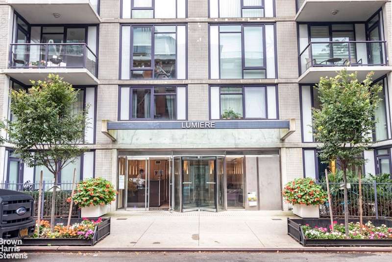 This 7-story full service building at 350 West 53rd Street, known as the Lumiere for its iconic cherry blossom trees that remain illuminated throughout the year, was built in 2005. It was developed by Victor Homes and was designed by Gerner Kronick + Valcarel. ; 350 West 53rd Street, situated mid-block between 8th and 9th Avenue, is pet-friendly, has an attractive fenestration pattern of floor-to-ceiling windows, a full-time doorman/concierge service, a live-in superintendent, refrigerated storage, a fitness room, individual storage units, bicycle storage and many balconies. There is also a garden for all residents in the rear of the building. Please note the currently advertised real estate taxes reflect primary resident use.