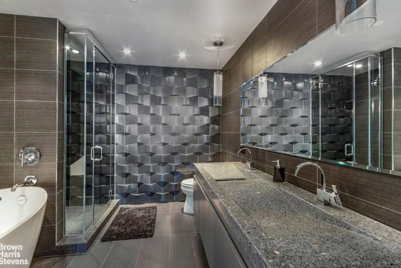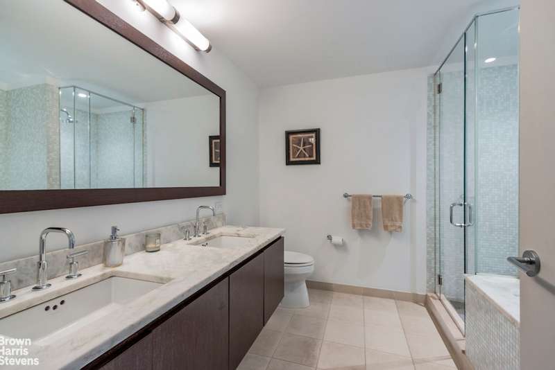 The separated layout of Apartment 6J ensures privacy for all occupants. The primary bedroom has an expansive ensuite bathroom that was completely remodeled down to the studs. The ensuite primary bathroom retained its five-fixture layout and features concrete Marilyn waterfall tiles, a stand-alone oversized soaking tub, luxurious shower and dual custom waterfall sinks. The second bedroom enjoys easy across the hall access to the second full five-fixture bathroom that includes a marble-topped double vanity, soaking tub, and spa glass shower. The brand new in-unit Bosch washer/dryer in its own dedicated closet is ideally located at the end of the hallway just outside of the second bedroom.