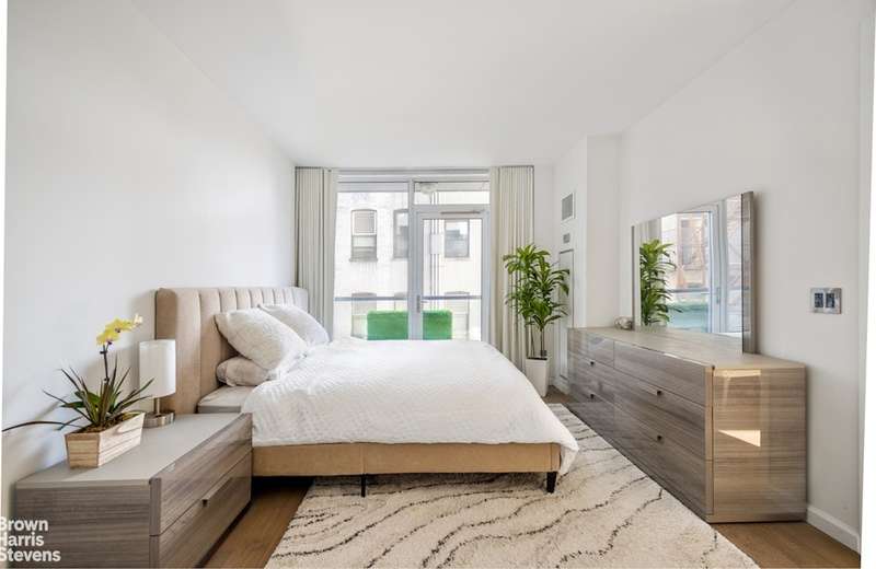 This apartment is a pin drop quiet split two bedroom that receives an abundance of natural light through its floor to ceiling south-facing windows. The entryway, complete with an expansive walk-in coat closet, leads to the open kitchen overlooking the sun-bathed living room and 25-foot south-facing private balcony beyond. The balcony extends from the living room to the primary bedroom. The living room features custom track lighting and the kitchen boasts Leucos fairy pendant lights over the large breakfast bar, marble countertop with under mounted sink, and a full suite of stainless-steel GE appliances - including refrigerator with built in ice maker, full size gas range stove and oven, and full-size dishwasher. Expanding the functional space of the kitchen is custom cabinetry with hardwood and glass shelving designed specifically to be incorporated into the existing wall.