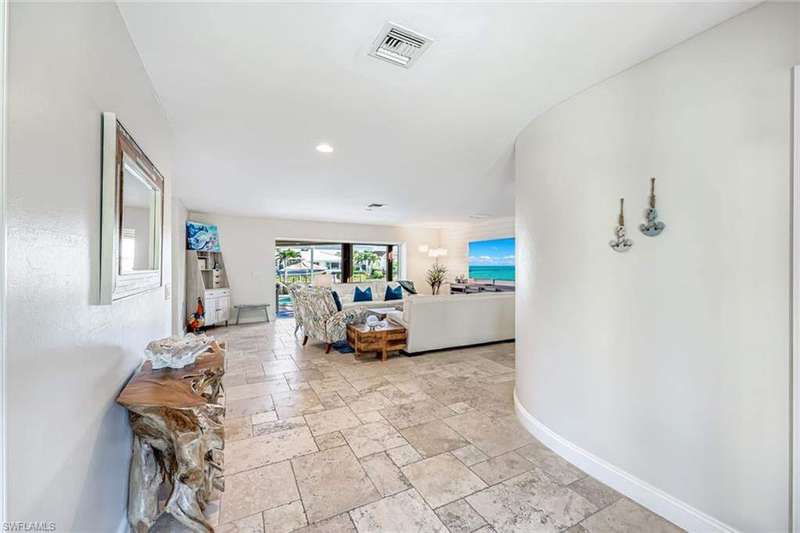 Steps from Tigertail Beach lies this coastal retreat that captures the essence of island living with effortless style and comfort. Completely reimagined from top to bottom with over $300,000 in thoughtful updates, this 3 bedroom, 3 bath home is move-in ready and built to impress. Behind its charming nautical exterior lies a light-filled open layout featuring a comfortable living area, dining space, and inviting family room with volume ceilings accented by a striking stone fireplace and warm cedar ceiling details. The gourmet kitchen showcases crisp white shaker cabinetry, quartz counters, stainless-steel appliances, and a large island perfect for entertaining. The primary suite has dual closets, and a stunning spa-inspired bath with a walk-in glass and tile shower, and granite countertops. Step outside to the expansive lanai with cedar ceiling trim, a saltwater pool, and a paver deck framed by a panoramic screen enclosure. Boating enthusiasts will appreciate two docks with a 12,000-lb lift, reinforced seawall, and an elevated sun deck ideal for relaxing by the water. Modern upgrades include stone flooring throughout, impact windows and sliders, a new roof in 2022, updated electrical and plumbing systems, and a newer A/C. With no storm damage, complete storm protection, and a premier location within walking distance to Tigertail Beach and north of Collier Boulevard, this property is not only an ideal full-time residence but also a top choice for rental income.
