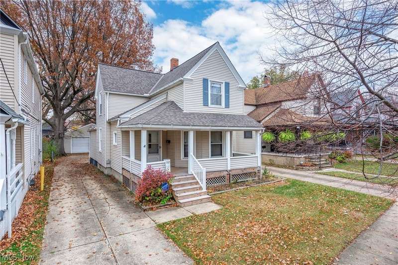 This wonderful Lakewood home offers affordability, convenience, and generous living space! A large front porch greets you with vinyl siding and newer roof! Enter into the large foyer. There is a formal living room and dining room and a first-floor bedroom that can be used as an office if needed. The eat-in kitchen is large with solid oak cabinetry and all appliances stay. There is a first-floor laundry room/half bathroom combination. Upstairs are two large bedrooms with great closets and a very big full bathroom. Storage is a standout in this property, including a great attic space and an excellent, oversized garage complete with its own large attic, ideal for tools, equipment, vehicles, or additional storage needs. A covered rear entry, perfect for staying dry while bringing in groceries or welcoming guests. This home delivers the space you need with the practicality you've been searching for?both inside and out. Schedule your showing today!